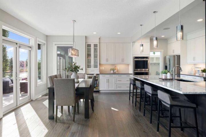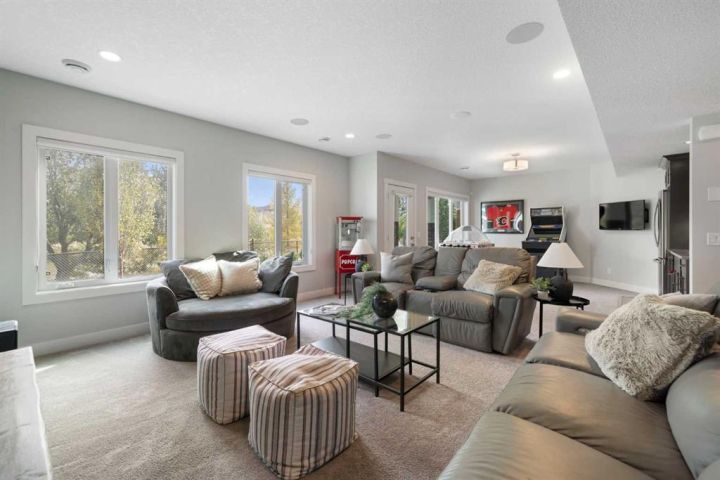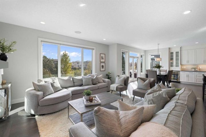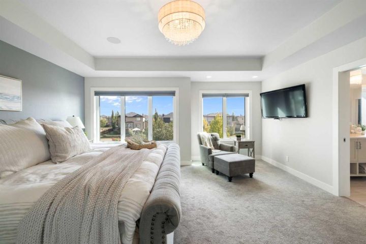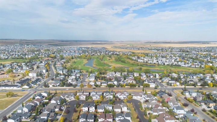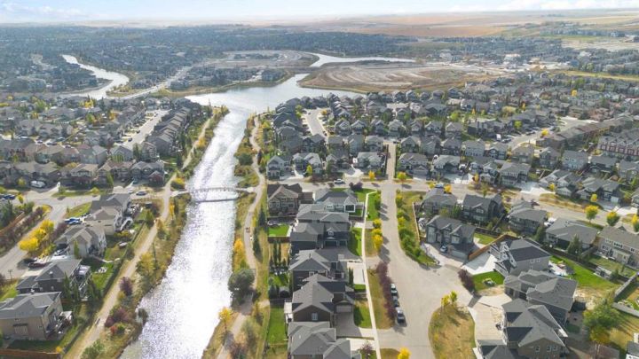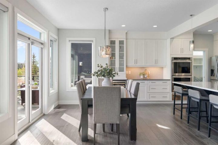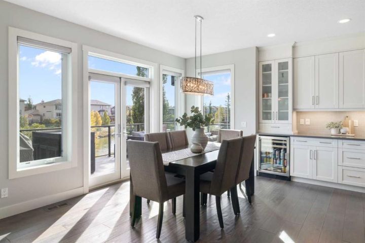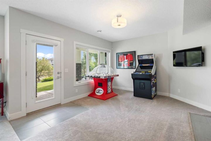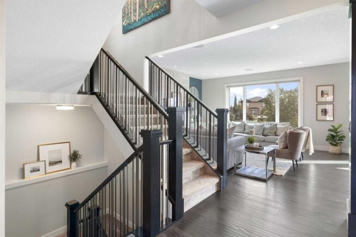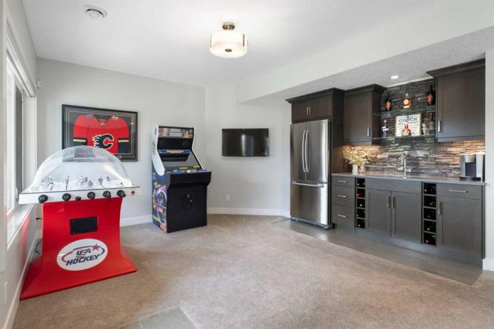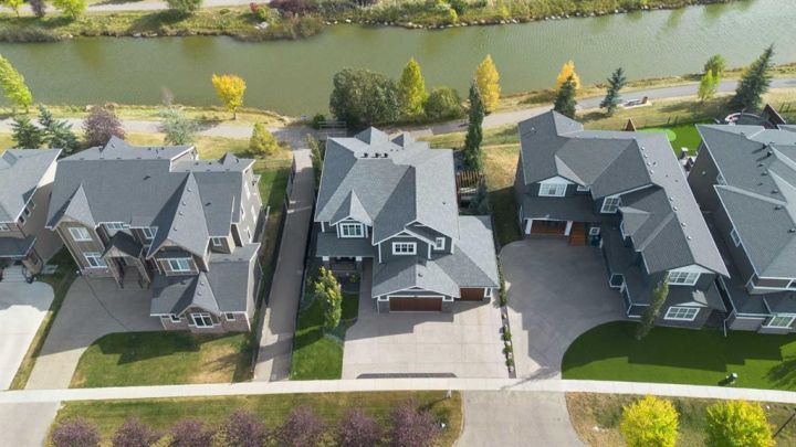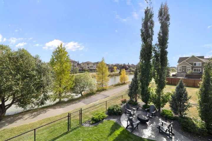 Hello, Gorgeous! Welcome to 158 Canoe Crescent SW in Airdrie, a stunning executive walkout home offering over 3,000 square feet above grade plus a fully finished basement, with 5 bedrooms and 3.5 bathrooms. Backing directly onto the canal and walking paths, this property offers the perfect blend of serenity and convenience in the desirable Canals community. From the Hardie board siding and cedar garage doors to the oversized solid wood front door, the curb appeal sets the tone for what awaits inside. Step into a grand main floor with soaring ceilings, engineered hardwood, and a chef inspired kitchen featuring floor to ceiling cabinetry, dual ovens with warming drawer, a six burner gas cooktop, and a walk in pantry with custom built-ins. The upper level provides a vaulted bonus room, three additional bedrooms, and a luxurious primary suite complete with steam shower, heated floors, and a custom walk-in closet system. The fully finished walkout basement is designed for entertaining with a wet bar, large rec room, in floor heating, and two more bedrooms. Outdoors, enjoy a professionally landscaped yard with exposed aggregate, a stamped concrete fire pit area, cedar pergola with hot tub, and a glass railing deck overlooking the water. Additional features include a fully finished heated triple car garage with epoxy flooring, two furnaces, two air conditioning units, upgraded crank windows, and a built in speaker system indoors and outdoors. This is more than just a home, it is a lifestyle, offering luxury, comfort, and location all in one.