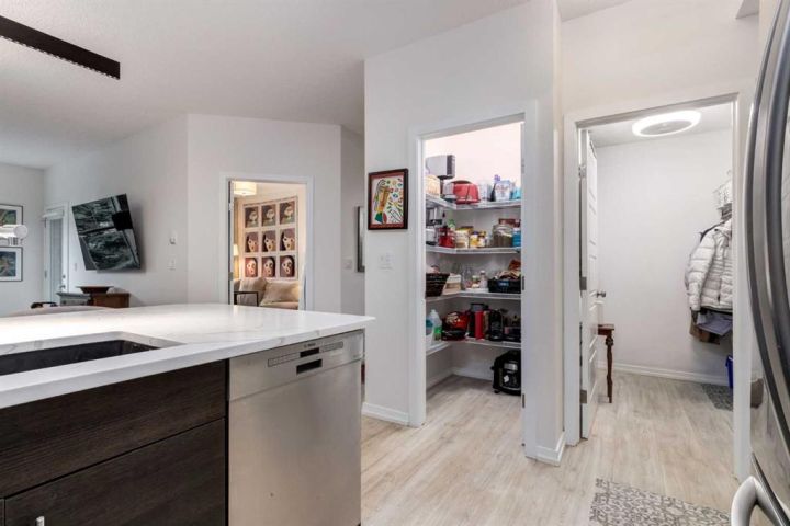 This meticulously cared-for apartment-style condo blends style and function with a bright, neutral palette and thoughtful luxury upgrades throughout. The spacious primary suite offers a walk-through closet and generous ensuite, while a French-door den provides the perfect work-from-home space or spare bedroom. Recent renovations include luxury vinyl plank flooring throughout, new stainless steel kitchen appliances, quartz countertops with a modern backsplash and faucet, updated vanities with new sinks and faucets, and professionally installed window coverings. Both bathrooms and utility areas feature upgraded flooring, and high-profile toilets add to the quality finishes. The well-appointed kitchen boasts abundant cupboard space, a sizable pantry, and a separate enclosed laundry room with additional storage. Enjoy your morning coffee on your uniquely private ground level patio while taking in breathtaking Cochrane sunrises. Living at Alora in Sunset Ridge means access to a fully equipped fitness centre just down the hall and guest suites for visitors. A titled, heated underground parking stall with storage locker is also included. Move-in ready and beautifully updated, this condo is priced to sell—don’t miss out!