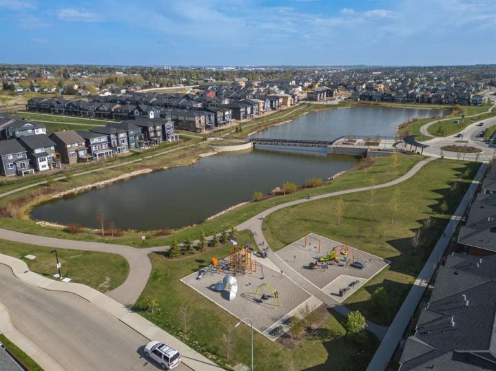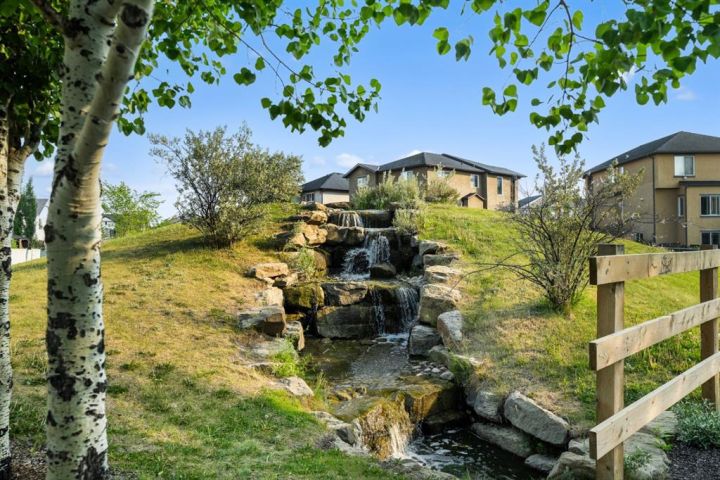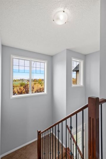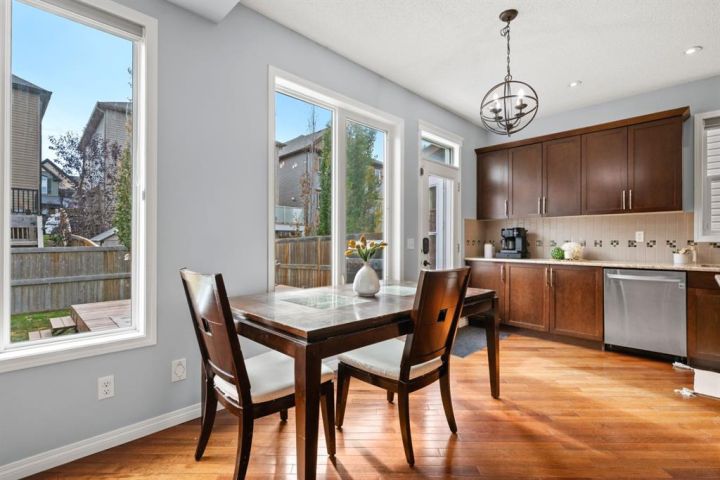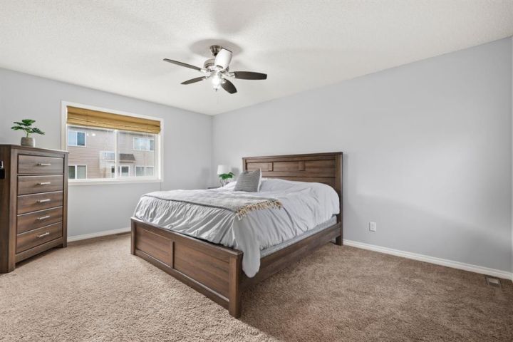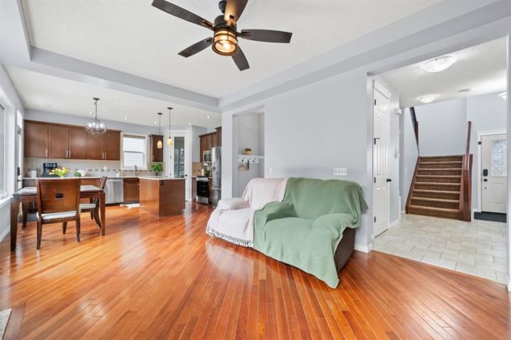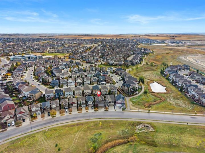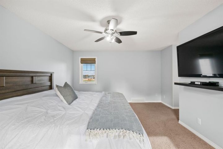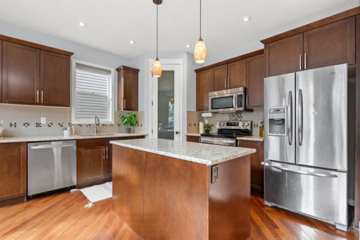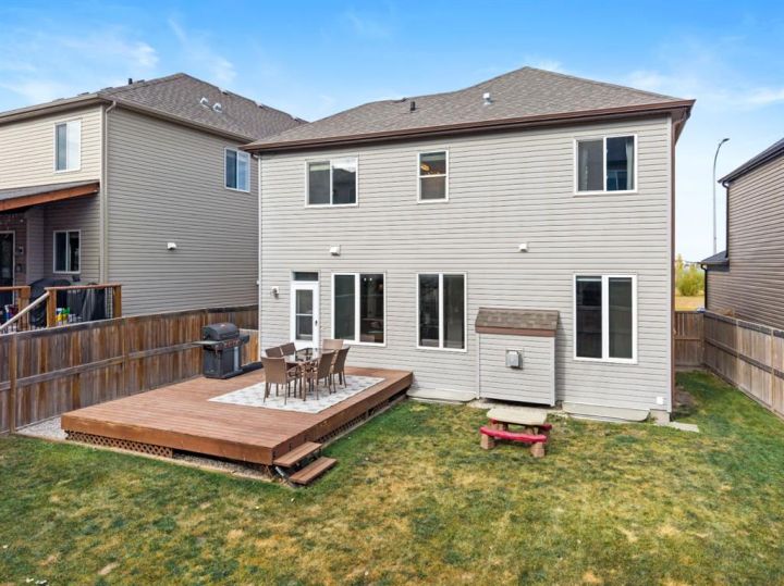 Welcome to Windsong in Airdrie! This beautifully designed 2-storey home offers 1567.70 SqFt. of stylish living with 3 bedrooms, 2.5 bathrooms, and a double attached garage. Freshly painted throughout (2025), the home feels bright, inviting, and move-in ready. From the moment you arrive, the charming covered front veranda and vaulted entry set the tone. Inside, you’ll find 9-ft ceilings, 8-ft doors, diagonally-laid hardwood, oversized windows with Allusion blinds, and detailed ceiling accents with pot lighting. A granite-faced fireplace anchors the open-concept living space, adding warmth and sophistication. The kitchen is both functional and elegant, showcasing espresso maple cabinetry, granite countertops, stainless steel appliances including a new range (2025), a new kitchen sink and faucet (2025), a large island, corner pantry, and heightened cabinets for extra storage. The dining area opens seamlessly to your sunny south-facing backyard—fully landscaped, fenced, and perfect for BBQs (gas hook-up) and family gatherings. Upstairs, the spacious primary suite features a walk-in closet and a luxurious ensuite with a tile and glass shower, granite vanity, and dual sinks. Two additional bedrooms, a full bathroom, and a convenient laundry room with a new washer and dryer (2024) complete the upper level. Additional updates include a new hot water tank (2022), new garage door opener and springs (2025), baseboards freshly painted (2025), new smoke detectors (2025), furnace serviced (2024), and ducts cleaned (2025)—all adding peace of mind and lasting value. Situated directly across from Chinook Winds Regional Park, you’ll love the unbeatable convenience of having a skate park, splash park, ball diamonds, walking paths, and schools just steps from your front door. From your veranda, enjoy front-row seating to Airdrie’s spectacular Canada Day fireworks—a truly unique perk of this prime location. With shopping, dining, golf, and transit nearby, this home combines modern comfort, thoughtful upgrades, and an ideal setting. If you’re looking for a move-in ready home with timeless appeal and an exceptional lifestyle—this Windsong gem is the one!