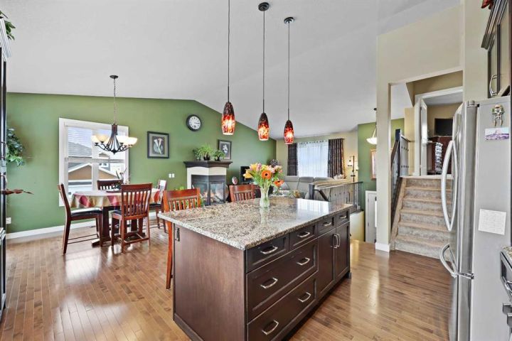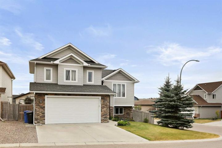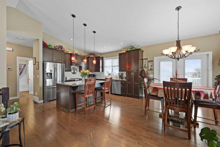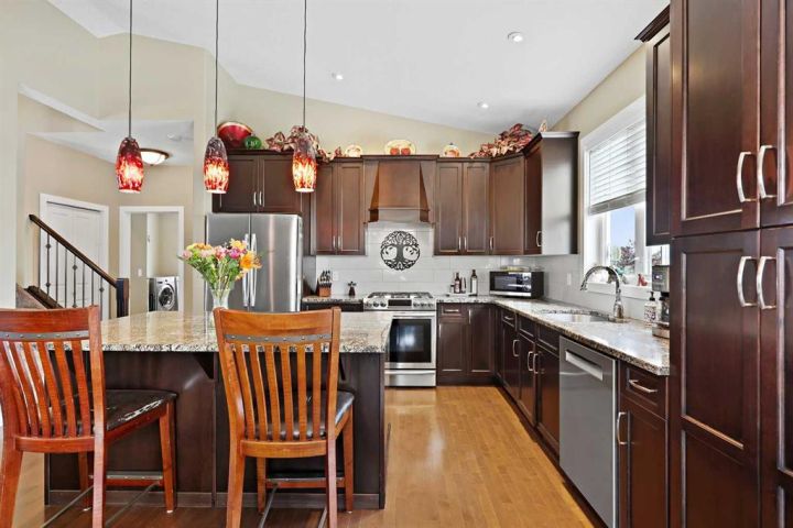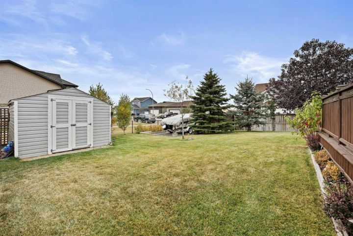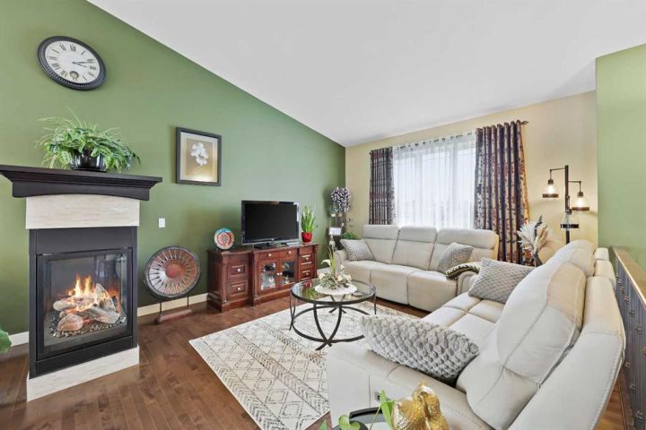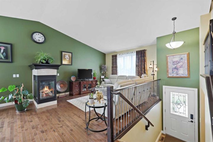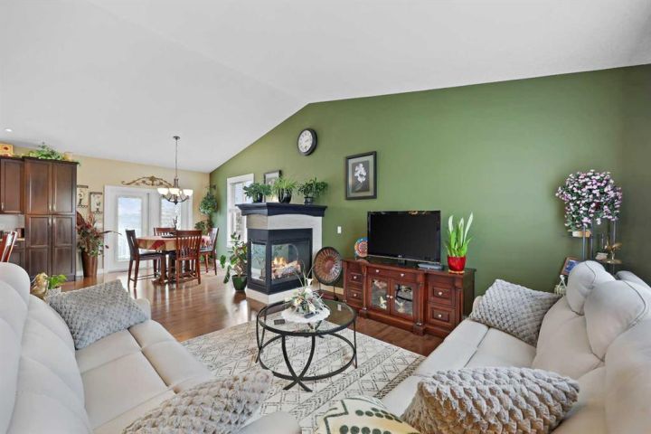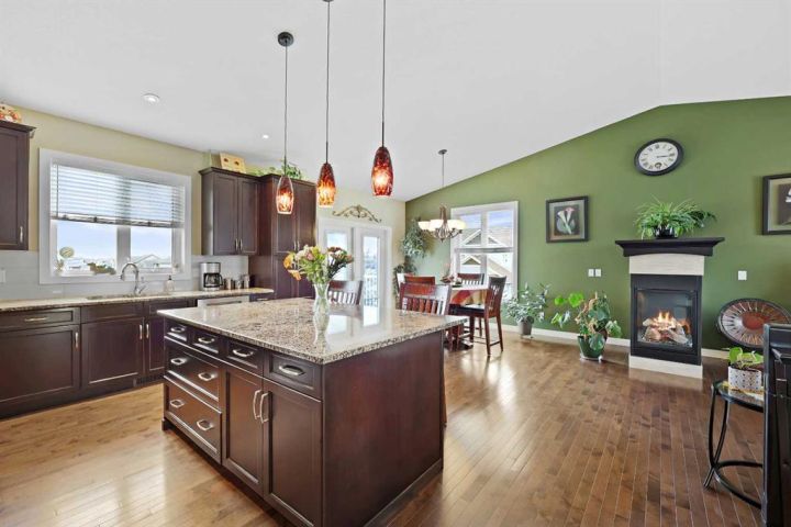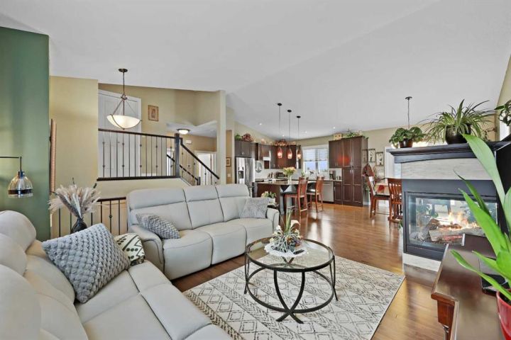 Pride of ownership shines throughout this beautifully maintained, custom-built home in the sought-after West Highlands community of Carstairs. Offered by the original owners who customized the design in collaboration with a reputable local builder, this thoughtfully tailored layout offers both comfort and sophistication—perfect for those seeking a refined small-town lifestyle. The welcoming open-concept main floor features a soaring vaulted ceiling and a striking three-sided fireplace that provides a warm visual divide between the living and dining areas. The kitchen is a delight for the home cook, complete with granite countertops, a gas range, and ample workspace for entertaining. A secondary bedroom and full bathroom, along with a generous laundry and storage room, complete the main level. Privately tucked above the garage, the primary suite is a peaceful retreat with a walk-in closet, 3-piece ensuite, and charming window seat overlooking the neighborhood. Downstairs, the walkout basement extends your living space with in-floor heat, a spacious recreation room large enough for a pool table, living room, a third bedroom, and a full bathroom—ideal for guests or family visits. Step outside to enjoy tranquil views of the expansive greenspace beyond your private backyard, featuring a large upper and lower decks, gated RV pad and beautifully maintained landscaping. Additional highlights include a heated double garage, central air conditioning, a newer hot water tank, and central vacuum. Situated in one of Carstairs’ most desirable neighborhoods, this property offers the perfect balance of elegance, ease, and small-town charm.