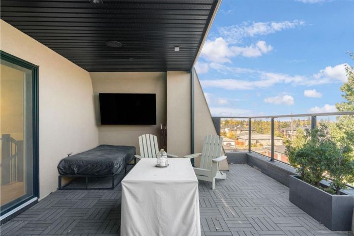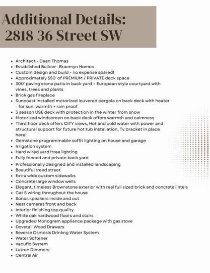 This one is SPECIAL! Custom-built by established/respected Braemyn Homes & designed by Dean Thomas (a Global Leader in Design!), this rare home stands apart from other semi-detached options available in SW Calgary. Prepare to be WOWED inside & out. The minute you drive onto the street - lined with mature Elm trees...you will feel at HOME. Elegant, timeless Brownstone exterior with real full sized brick & concrete lintels. Wait till you see this home at night - Gemstone lighting on home/garage=magical effect! Extensive work & investment went into ensuring the exterior of this home - reflects the amazing interior! This home offers a LIFESTYLE uncommon in Calgary...the ability to enjoy your outdoor spaces year round! Walk up your extra wide concrete walkaway, while you appreciate the beautiful, low maintenance landscaping out front. Inside front door, you are greeted by high ceilings, open concept timeless design that allows light to travel from EAST - WEST & white oak hardwood floors! Custom lighting options and window treatments throughout. Entertaining family or cozy nights at home in front of gas fireplace - all can be accomplished in this space. Kitchen is a chef's dream with UPGRADED Appliances - Monogram Fridge, 48" Monogram gas/electric stove + POT filler! HUGE QUARTZ Island w/room for casual dining or company while you cook/bake. TONS of cupboards/storage. Kitchen built at back to allow easy transition outside via door or patio sliders - directly to deck space to dine, BBQ (gas line), host sports parties, family events or enjoy quiet evenings in front of the fire! 2 piece bath & mudroom space complete this level. Double finished garage is insulated/drywalled with epoxy floors. Head up your Hardwood stairs to second level & find TWO amazing suites - both with large bedroom areas, beautiful ensuites & closet spaces! One stands out w/heated ensuite floors, dual sinks, stand alone tub and HUGE shower. Laundry w/sink & direct hamper access to walk-in closet! The THIRD level is all about OPTIONS! Use as extra space for relaxing, entertaining, WORKING. OR transform it to a THIRD bedroom. 2 piece bath on this level. Could achieve an incredible THIRD FLOOR PRIMARY suite if desired. Private balcony on this level offers CITY views! Set up for future hot tub installation. There is even a fully finished basement space! Offers another BEDROOM, 5th bathroom, flex space, dedicated Wine Room & tons of storage. School at end of the block! The home is steps to Marda Loop, Westhills & LRT. 37th ST revitalization adds new trees, bike paths to North Glenmore Park & downtown + easy access to amenities, dining, coffee shops, shopping, services - creating a vibrant, walkable neighborhood with a feel similar to Marda Loop! It's impossible to describe this incredible home to its full potential w/limited characters! Get downtown or out of town quickly! You TRULY need to SEE this HOME in person! List of upgrades in photo carousel. Book your showing today!