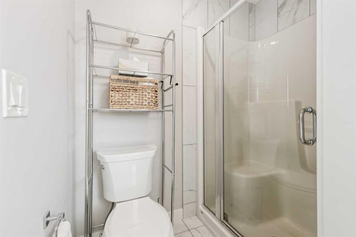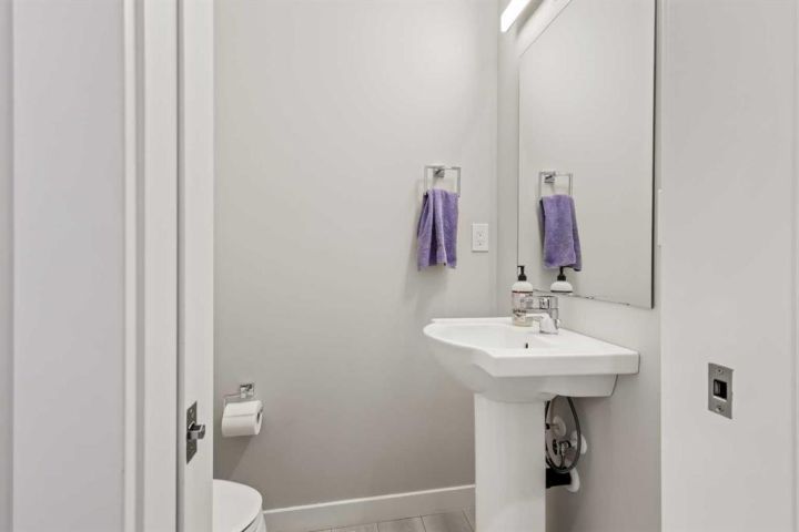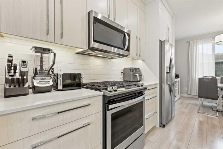 Step inside and be impressed by the chef’s kitchen featuring upgraded stainless steel appliances, quartz countertops, a full-height tile backsplash, and a sleek stainless steel under-mount sink. The open-concept main floor boasts upgraded laminate flooring, a spacious living room, a dining area, and a convenient 2-piece bath.