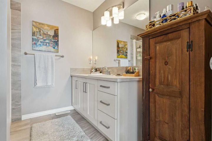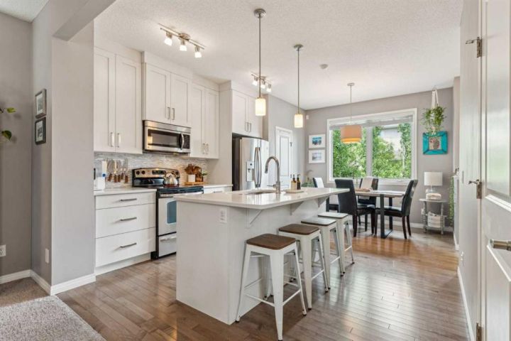 Family Living at Its Best ~Tucked into a quiet, family-friendly street, this beautifully crafted semi-attached home feels every bit like a standalone house. Only a small shared wall where the garages meet connects you to your neighbor, offering added privacy and peace. From the moment you step inside, warmth welcomes you in. Sunlight pours through large windows onto rich hardwood floors, filling every corner with a bright, cheerful glow. The heart of the home is designed for connection, with an open-concept main floor where a cozy fireplace sets the tone for movie nights and the spacious kitchen island invites family breakfasts and after-school snacks. Full-height white cabinetry, quartz countertops, and 9’ ceilings add a sense of space and style throughout. Upstairs is where family life truly flourishes. A generous primary suite with walk-in closet and ensuite offers a restful retreat, while two additional bedrooms and a full four-piece bathroom provide comfort and space for growing families. A versatile bonus room can easily become a play area, home office, or quiet reading nook — whatever suits your lifestyle best. Step outside and you’ll find your own private backyard escape. A large 19’6” x 8’ deck overlooks a beautifully landscaped yard shaded by mature trees, with storage tucked neatly under the deck and along the side yard. A charming sitting area creates the perfect spot to relax, unwind, or gather with friends and family. Downstairs, a fully finished basement adds a whole new layer of possibility. Whether you envision a home theatre, workout studio, games room, or creative space, this one-of-a-kind lower level is ready for whatever you dream up. And location? It’s hard to beat. An elementary school is just 100 yards away via a safe pathway, making morning drop-offs a breeze, while the middle school is a mere three-minute walk. Parks, playgrounds, golf course, shopping, and canal pathways are all walking distance, making this a place where kids can grow, friendships can flourish, and memories are made just steps from your front door. This is more than a house. It’s a home designed for real family living.