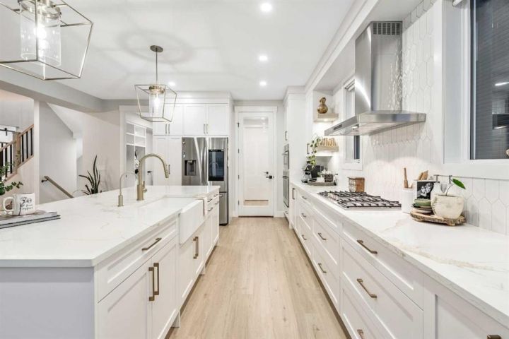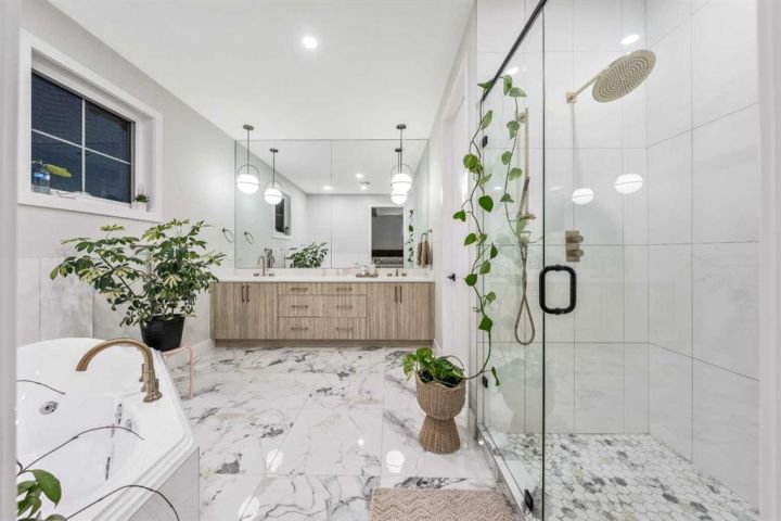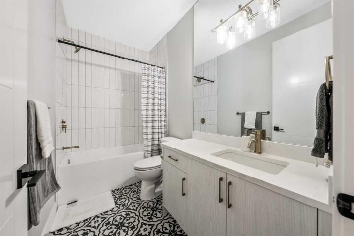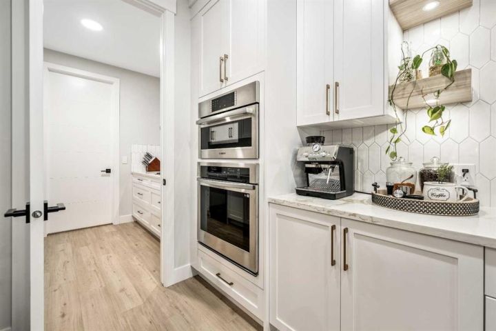 On the upper level, you’ll discover four generous bedrooms and a thoughtful layout for practicality and comfort. The primary suite is a sanctuary, with a large walk-in closet and spa-inspired 5-piece ensuite, complete with premium finishes. One secondary bedroom enjoys its own 4-piece ensuite, while the other two bedrooms share a beautifully appointed 4-piece bath. A bonus room opens to its own balcony, offering a quiet retreat or reading nook. The upper floor also features an expanded laundry room equipped with a sink and steam closet to make chores easier—and all washrooms are enhanced with upgraded gold faucets, shower heads, and lighting fixtures. Quartz countertops and stylish shaker-style cabinetry carry through here and throughout the home for continuity of quality and finish.