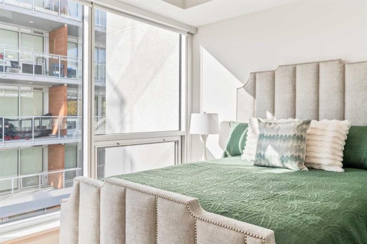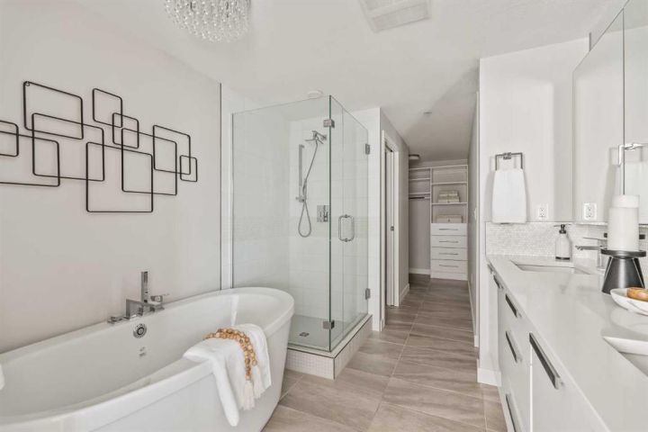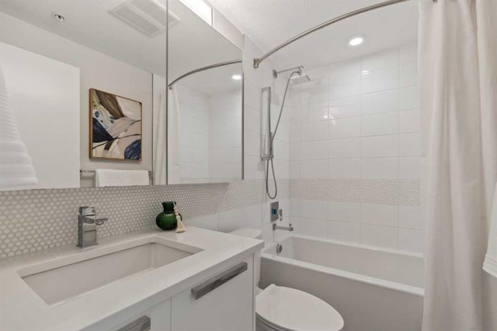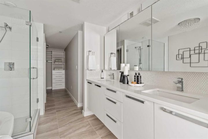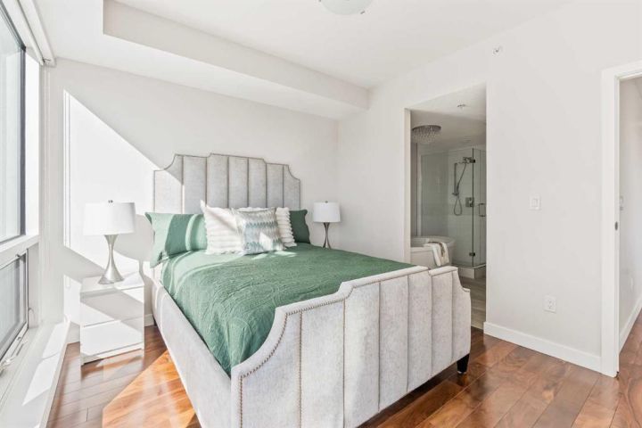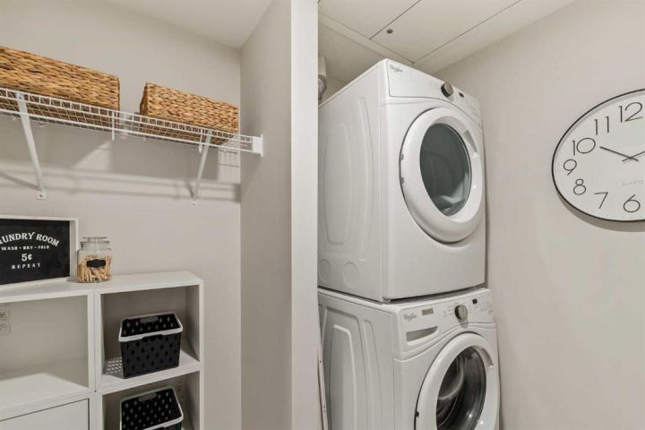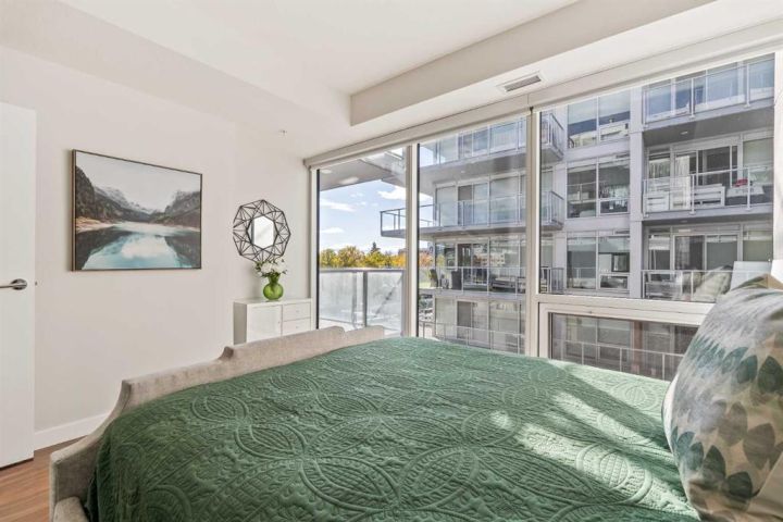 Experience refined urban living in this bright corner unit, thoughtfully designed with two bedrooms and exceptional flow throughout. Floor-to-ceiling windows flood the space with natural light, while the open-concept living and dining areas create an inviting atmosphere. Step out onto the private balcony to take in sweeping south-facing views of downtown. The contemporary kitchen blends style and function, featuring high-end stainless steel appliances, a gas range, and a large quartz island that’s perfect for casual dining or entertaining. The primary suite offers a generous walk-in closet and a spa-inspired 5-piece ensuite complete with a free-standing soaker tub. The second bedroom enjoys convenient cheater access to the main 4-piece bath, ideal for family or guests. A separate laundry room with full-sized machines adds extra practicality. Upgraded engineered hardwood floors extend throughout, bringing a warm, modern finish. This home also comes with one titled underground parking stall and secure storage. At Ezra, residents enjoy exclusive amenities including a stylish party lounge with wine storage in the East tower and a fitness/recreation facility in the West tower. Situated next to historic Riley Park, you’ll be just steps from the LRT, Kensington shops, Safeway, and an abundance of bike paths and walking trails. A truly elevated lifestyle in the heart of the city.