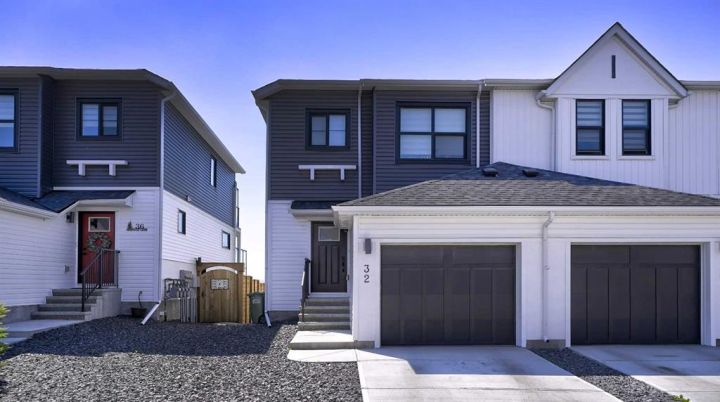 MOUNTAIN VIEWS | SOUTH-FACING BACKYARD | BACKING ONTO GREENSPACE | END UNIT | NO CONDO FEES. This stunning home combines a dream location with modern luxury—just like new! The bright, open-concept main level feels like a show home, featuring a large quartz island, full-length white cabinetry, sleek subway tile backsplash, gold hardware, modern lighting, stainless steel appliances, and a pantry. Knockdown 9-ft ceilings, pot lights, and luxury vinyl plank flooring add to the upscale feel. A convenient main floor half bath completes the space. Enjoy incredible views from every level with no neighbours behind. The sun-drenched living room offers direct access to the south-facing backyard, backing onto greenspace and pathways that weave throughout the community. Added luxury of motorized blinds on main floor and stairwell. Upstairs, the primary retreat is a true sanctuary with a walk-in closet, private balcony overlooking Cochrane and the mountains, and a spa-inspired 5-piece ensuite with dual quartz vanity, glass shower, and deep soaker tub. Two additional bedrooms share a full bathroom (also with quartz countertops), and the upper-level laundry closet adds everyday convenience. The home also features a separate side entrance leading to an undeveloped basement—perfect for storage or future customization. With NO CONDO FEES, mountain views, and a prime location backing onto a park and greenspace, this property offers the perfect blend of tranquility and modern design. OPEN HOUSE Sunday Oct 5th (noon-2 pm)