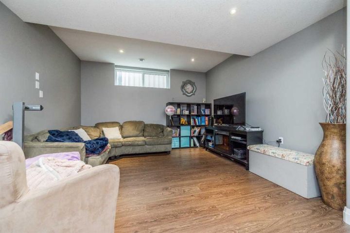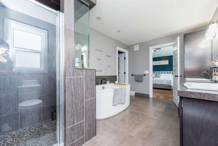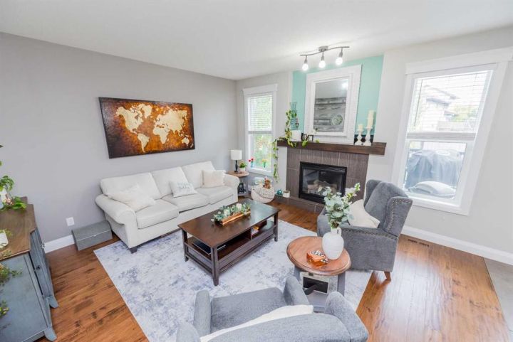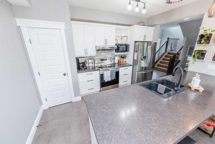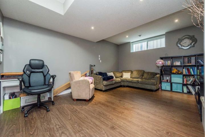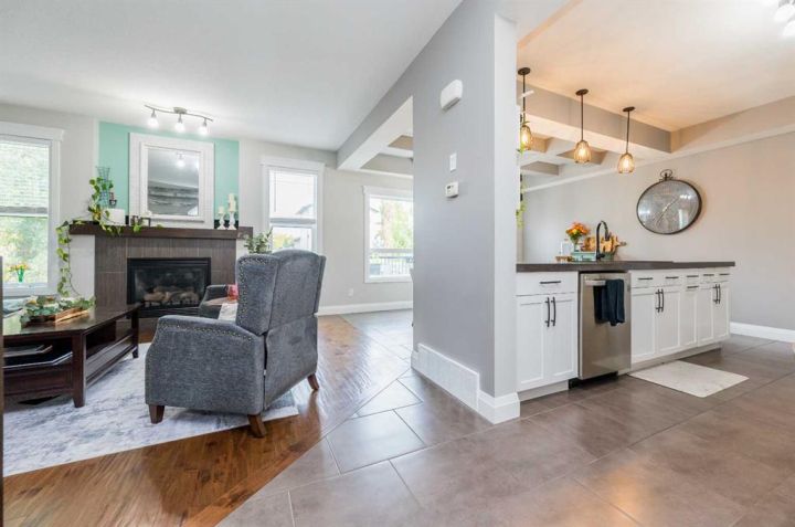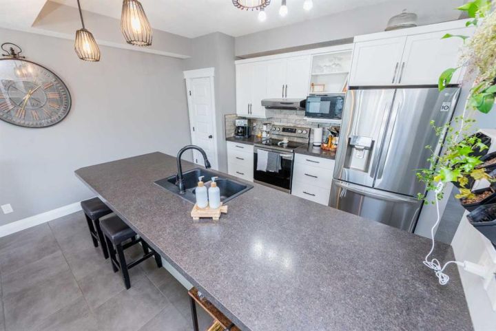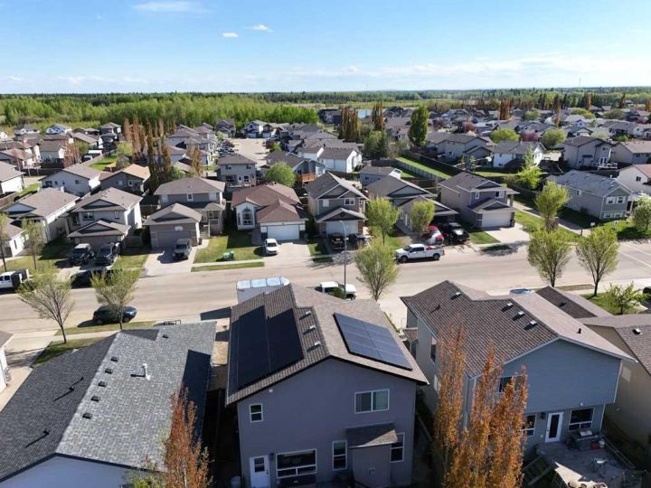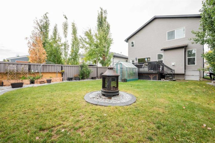 This beautiful home is filled with thoughtful upgrades and modern finishes inside and out. The exterior showcases stunning landscaping with decorative curbing, solar panels for energy efficiency, and a low-maintenance back deck with aluminum railings—perfect for enjoying the outdoors without the upkeep. Inside, the open floor plan is bright and welcoming, featuring engineered hardwood floors and a cozy gas fireplace in the living room. The kitchen is designed for both style and functionality, offering an island with eating bar, a pantry, and a spacious dining area that opens directly onto the back deck. Just off the entry, you’ll find a convenient half bath paired with a laundry room complete with built-in shelving. Upstairs, the luxurious primary suite is a true retreat with a walk-in closet and an impressive ensuite featuring a free-standing tub, his-and-hers sinks, and a beautifully tiled shower. Two additional generously sized bedrooms and a full bathroom complete the upper level. The fully finished basement provides even more living space, including a family room, fourth bedroom, additional bathroom, dedicated office, and a storage room. The attached garage is insulated and drywalled, adding comfort and value. This home offers the perfect combination of elegance, practicality, and efficiency—ideal for families looking for space and style.
