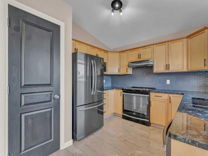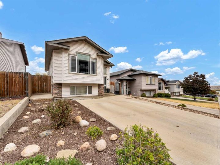 Welcome to this nicely updated bi-level style family home in the sought after Terrace neighbourhood — just steps from Ken Sauer School, scenic walking paths, and a short drive to all amenities and the Big Marble Leisure Centre. Step inside to a bright, open entryway with tiled flooring that leads up to a spacious main level featuring vaulted ceilings and a stylish open-concept layout. The kitchen, dining, and living areas flow seamlessly together, highlighted by a full stainless steel appliance package, granite countertops throughout and a striking black tile backsplash that ties in perfectly with the bold accent wall in the living room. The main level offers two bedrooms and a four-piece bath, with double his-and-her closets in the primary. Downstairs, the fully developed lower level includes two additional bedrooms, a large family room with big windows, a laundry room, storage, and another four-piece bath with the added bonus of heated floors. Outside, enjoy a roomy deck and large patio area with a pergola, perfect for entertaining, plus a fully fenced yard with plenty of space to build your new garage. Lots of room available on the front driveway for 2 vehicles as well as additional off-street parking. This home blends modern style, function, and location — all in a family-friendly neighborhood you’ll love coming home to. Don’t miss this one!