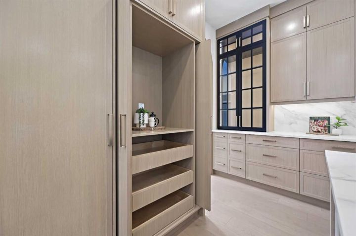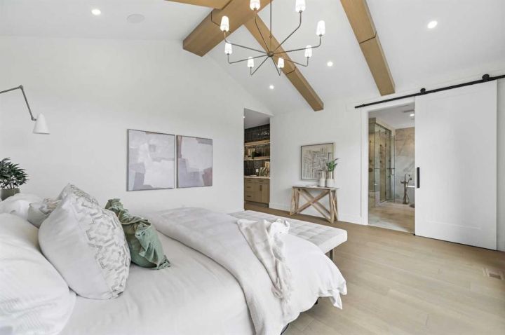 Beamed Ceilings, Bookcases, Built-in Features, Central Vacuum, Chandelier, Closet Organizers, Double Vanity, French Door, High Ceilings, Kitchen Island, Low Flow Plumbing Fixtures, Natural Woodwork, Open Floorplan, Pantry, Quartz Counters, Soaking Tub, Track Lighting, Tray Ceiling(s), Vaulted Ceiling(s), Walk-In Closet(s), Wet Bar, Wired for Sound