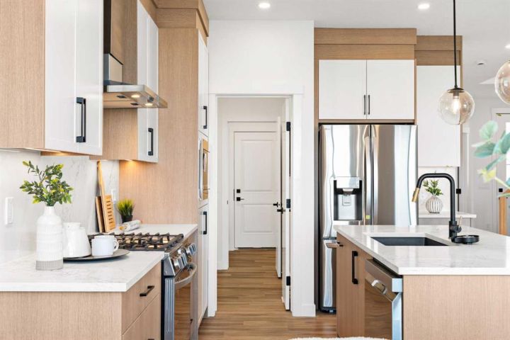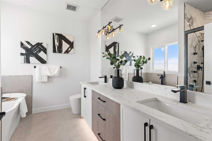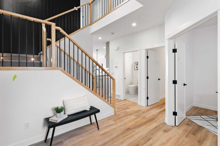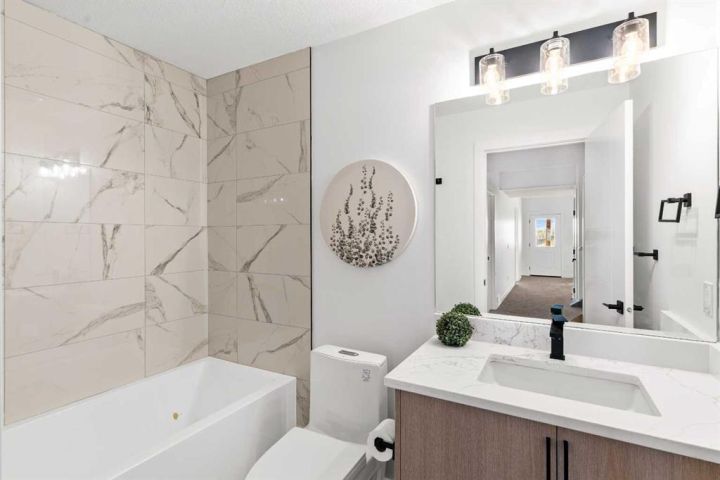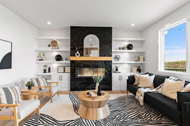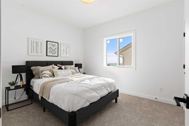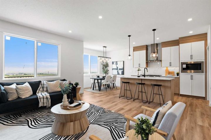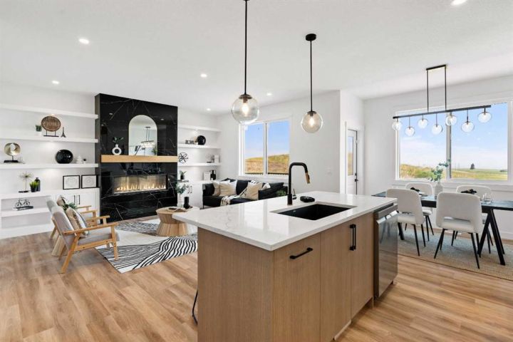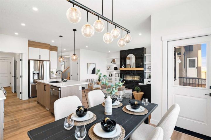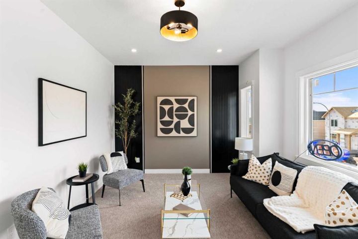 Welcome to an extraordinary opportunity to own a custom-designed Exquisite Home on a 6,360 sqft corner lot in Crossfield. This stunning upgraded two-story home offers 2,211 sqft of carefully crafted living space, an 873 sqft undeveloped walk-out basement, and a triple-car garage, totaling over 3,000 sqft. From the moment you step in, you’ll notice the attention to detail, with soaring 9-foot ceilings on each floor, adding a sense of space and light. Enjoy the front porch, perfect for morning coffee, and the spacious deck off the main floor, ideal for family gatherings and summer barbecues. The open-concept main floor is designed for comfort and modern elegance, centered around a chef’s dream kitchen with a sizable island, sleek quartz countertops, premium stainless-steel appliances, and textured cabinets crafted from durable plywood. Adjacent to the kitchen, a walk-in pantry and breakfast nook add charm and functionality. The sunlit living room offers relaxation with a linear gas Montigo fireplace and, wide plank luxury vinyl plank flooring, (Full feature sheet can be provided upon request). Bold black dual-pane windows frame serene views, adding sophistication alongside our durable stucco exterior with stone accents. This floor also includes a large office, mudroom, and side entrance, enhancing convenience for daily living. Upstairs, the primary suite is a luxurious retreat with tray ceilings, a stunning 5-piece ensuite (dual vanities, soaker tub, and separate shower), and a spacious walk-in closet. Two additional bedrooms, each with its own walk-in closet, provide ample room for family or guests, along with a full 4-piece bathroom. A convenient laundry room with a sink simplifies routines, and a versatile bonus room offers space for a playroom, home theater, or lounge. The lower level, accessible by a separate rear entrance, opens to a walk-out basement with a concrete pad beneath the main-floor deck. The undeveloped basement is perfect for transformation into a rec area or a potential revenue-generating secondary suite (subject to approval and permitting by the city/municipality). Set in the welcoming Iron Landing community, this home is close to parks, playgrounds, and top-rated schools like Crossfield Elementary and W.G. Murdoch School. Enjoy the peaceful charm of Crossfield, with Airdrie just 10 minutes away, Calgary 25 minutes, and easy access to Highway 2. Scheduled for completion in August 2025, this home offers the chance to choose from bespoke finishes, making it a true reflection of your style. Photos shown are from our show home in Iron Landing. Don’t miss this exceptional property—contact us today to make it yours!