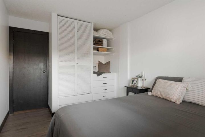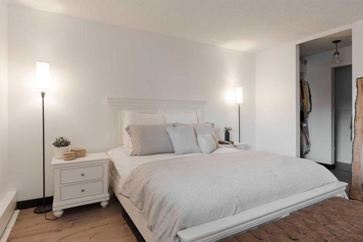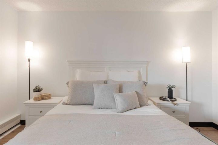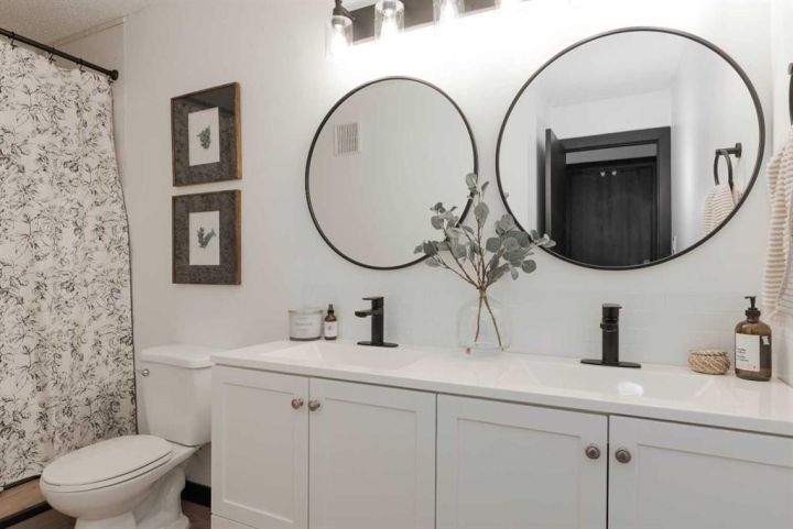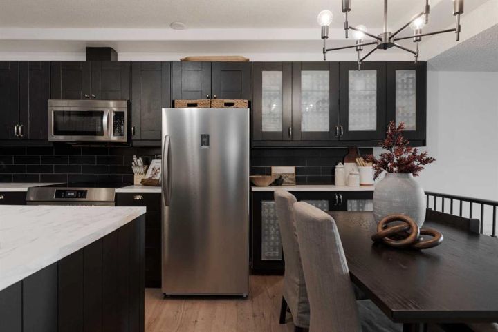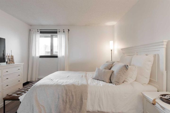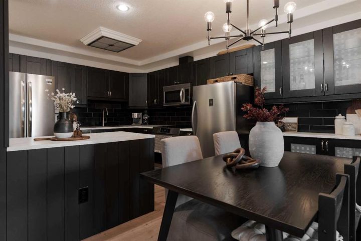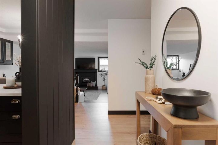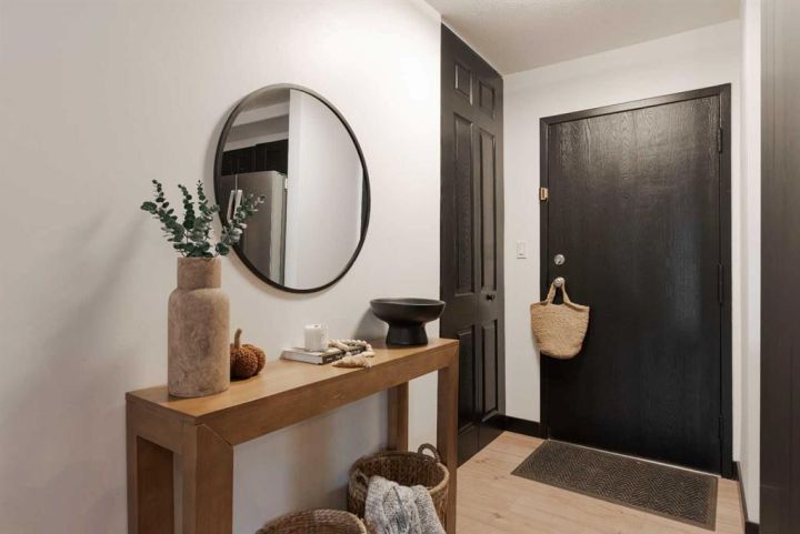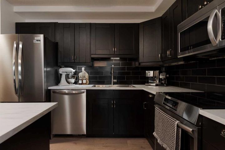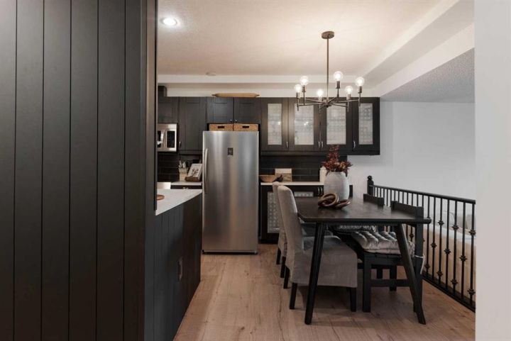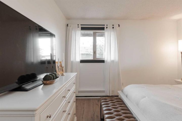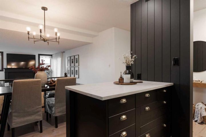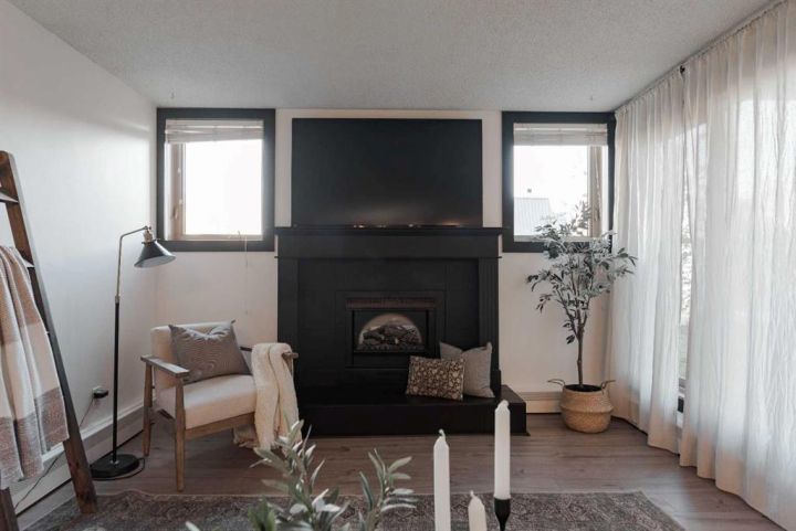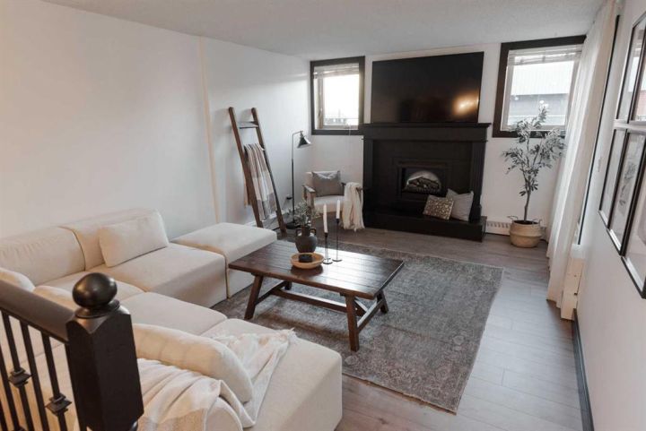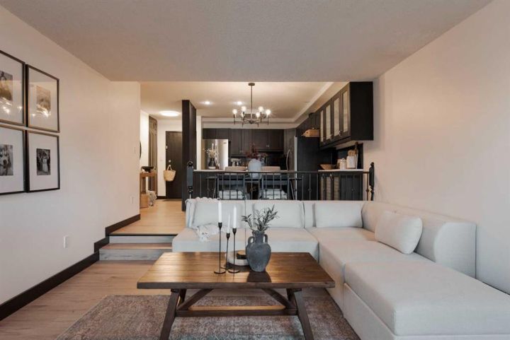 This chic, ground-floor residence effortlessly combines modern sophistication with everyday comfort. Offering a rare blend of space and style, it features 2 bedrooms, 2 bathrooms, a walk-in closet, and a full laundry room - all transformed with timeless design and thoughtful updates. Inside, every detail reflects a designer’s touch - from the matte black cabinetry and warm brass accents to the fresh paint, wide-plank LVP flooring, and new stainless appliances. The kitchen shines with a large peninsula, sleek black subway tile backsplash, farmhouse sink, an induction stove, and dual fridges (or a fridge and stand-up freezer) - balancing form and function beautifully. The open dining area overlooks a sunken living room anchored by an electric fireplace (AS IS) and framed by windows that fill the space with natural light. Step out to the covered, ground-floor balcony - perfect for morning coffee, pets, or simply relaxing outdoors - complete with a private storage area. The primary suite offers a serene retreat with a 2-piece ensuite and walk-in closet, while the 5-piece main bath features a double vanity and designer finishes. A dedicated laundry room features ample cabinetry, a new dryer, and workbench adds both utility and polish. With an assigned parking stall (#111) and an unbeatable location near schools, the dog park, Birchwood Trails, and all of Thickwood’s amenities, this turnkey property delivers modern sophistication and exceptional livability. Beautifully curated and move-in ready - this one stands out.