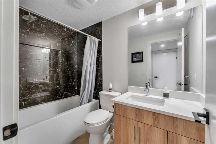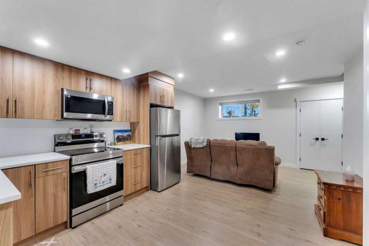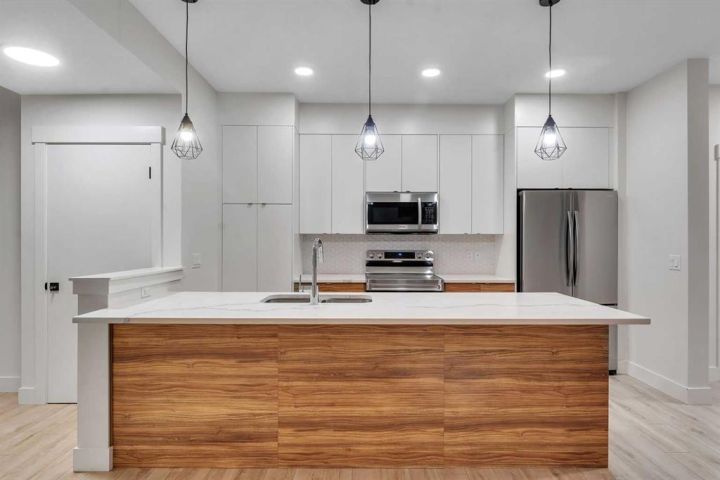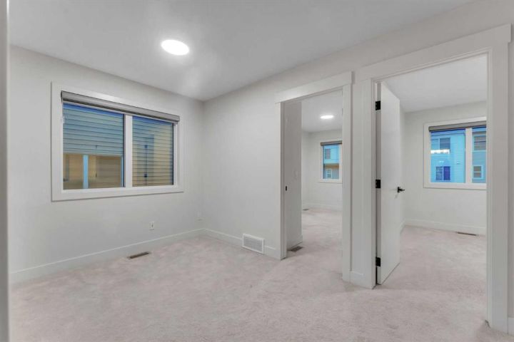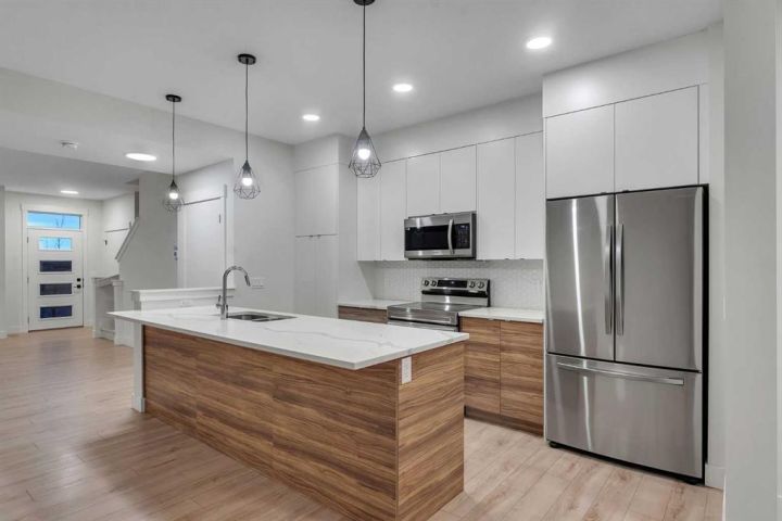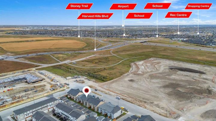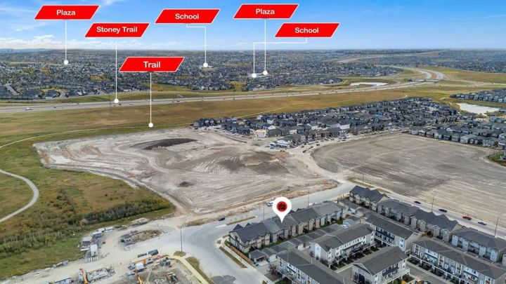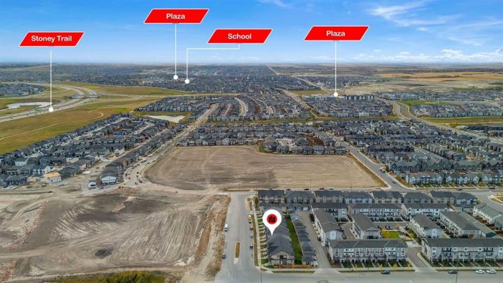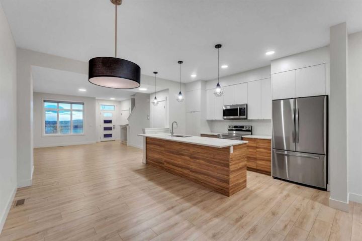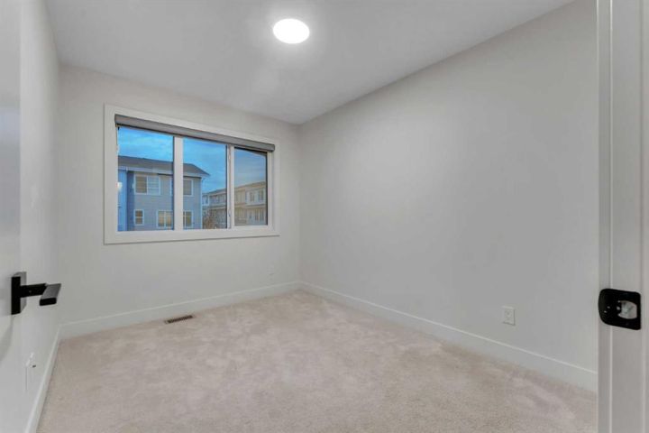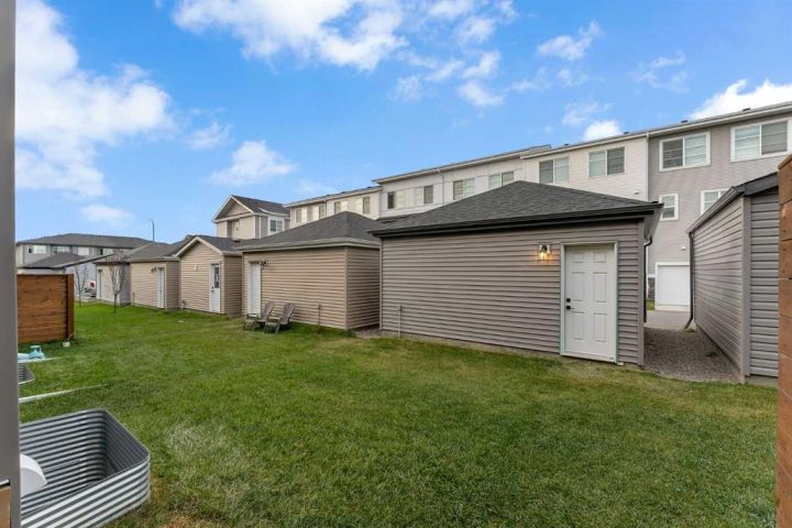 Stunning 4-Bedroom End Unit Townhouse with Illegal Basement Suite in Carrington NW | No Condo Fees! Welcome to this beautifully maintained 4-bedroom, 3.5-bathroom end unit townhouse in the sought-after community of Carrington NW Calgary. With no condo fees, a detached double garage, and a fully developed illegal 1-bedroom basement suite, this home offers incredible value, comfort, and functionality for families or investors alike. As you arrive, the striking brickwork and wide front entry make a bold first impression. Step inside to a thoughtfully designed open-concept main floor, where natural light floods the spacious living room, dining area, and modern 2-piece powder room — perfect for guests and everyday living. At the heart of the home is a chef-inspired kitchen featuring: Two-tone cabinetry with soft-close doors Quartz countertops Stainless steel appliances Full-height cabinets for ample storage Upstairs, you'll find a cozy office nook, ideal for remote work or study. The primary bedroom is a true retreat, boasting a private ensuite, walk-in closet, and breathtaking downtown views right from your window. Two additional bedrooms share a full 4-piece bathroom, and the conveniently located upper-floor laundry makes daily chores a breeze. The fully developed basement offers even more living space with a separate side entrance, making it perfect for extended family or rental income. It features: A spacious 1-bedroom illegal suite Modern kitchen with quartz countertops Stainless steel appliances Full 4-piece bathroom In-suite laundry (Currently tenant-occupied for your convenience and potential income.) Additional features include: Detached double garage – ideal for Calgary winters Fully landscaped front and backyard – ready for entertaining or relaxing End unit location – more privacy and extra natural light This home is located close to parks, walking paths, shopping, public transit, and major roadways for easy commuting. Whether you're a first-time buyer, growing family, or investor, this property checks all the boxes. Don't miss out on this incredible opportunity! Schedule your private showing today and see all that this exceptional home has to offer.