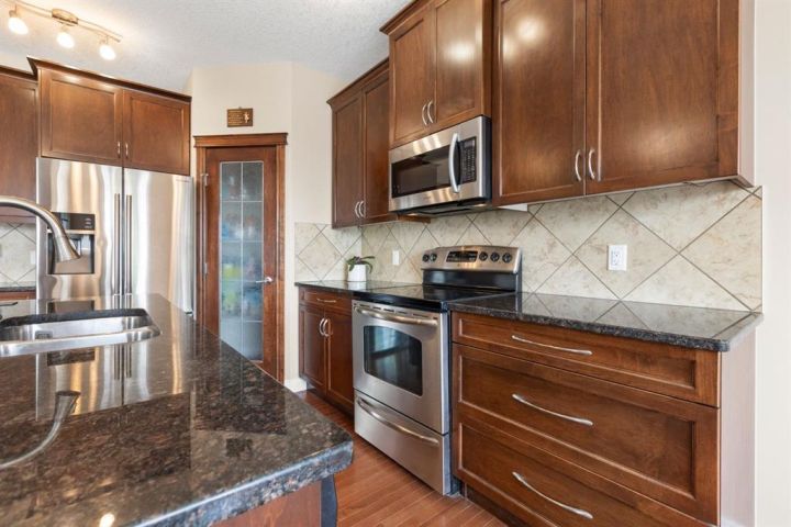 Welcome to this spacious and versatile family home featuring a desirable walk-out basement, rare triple attached garage, and energy-efficient solar panels — perfectly located on a quiet street in the sought-after community of Sherwood. Offering over 3,200 sq ft of total living space, this beautifully maintained 2-storey is ideal for large or multi-generational families, combining comfort, functionality, and long-term savings. From the moment you arrive, you’ll appreciate the charming curb appeal, oversized driveway, and inviting stone-accented exterior. Inside, the bright and functional main floor showcases rich hardwood floors, a grand foyer, a front flex room — ideal for a home office — and an open-concept living area anchored by a cozy gas fireplace. The well-appointed kitchen features maple cabinetry, granite countertops, stainless steel appliances, a corner pantry, and a spacious dining area that opens onto a large upper balcony — perfect for outdoor dining and entertaining. A convenient main floor laundry room completes this level. Upstairs, a generous bonus room with vaulted ceilings and oversized windows provides a great space for movie nights or a playroom. The upper level offers four bedrooms, including a spacious primary suite with peaceful views, a spa-inspired ensuite with dual sinks, soaker tub, separate shower, and walk-in closet, plus a full bathroom for the secondary bedrooms. The fully finished walk-out basement expands your living space with stylish laminate flooring, a large recreation room with built-in dry bar, one bedroom, a flex room, and a full bathroom. The walk-out leads to a covered patio and a fully fenced backyard with raised garden beds — perfect for kids, pets, and gardeners alike. Additional highlights include updated lighting, ample storage, and a thoughtful focus on energy efficiency with solar panels helping to reduce utility costs. Enjoy easy access to parks, scenic pathways, schools, shopping at Beacon Hill and Sage Hill, plus quick routes to Stoney trail and other major roadways to downtown, airport and beyond. Don’t miss this opportunity to own a fully finished six-bedroom-equivalent walk-out home with triple garage in one of NW Calgary’s most desirable family communities!