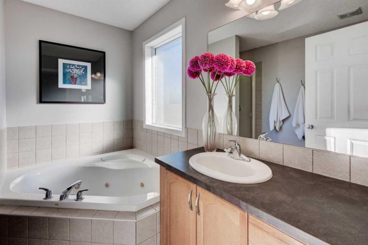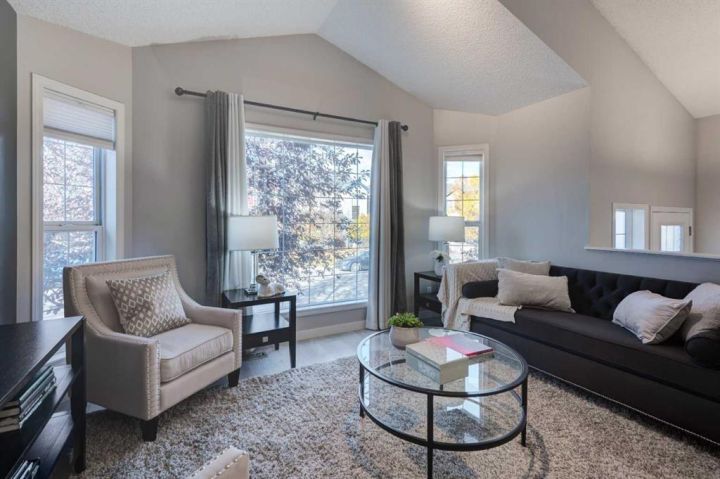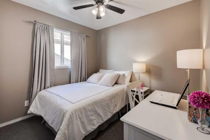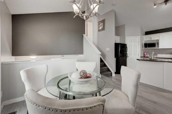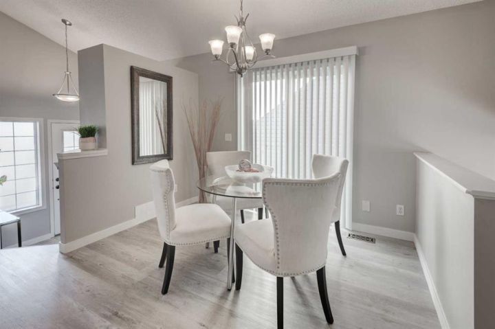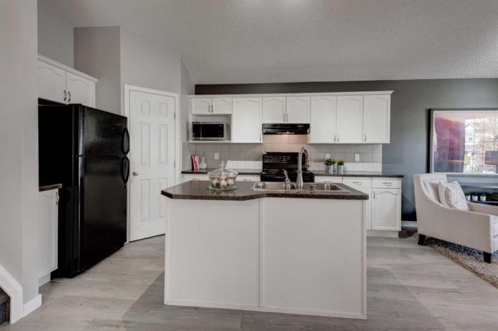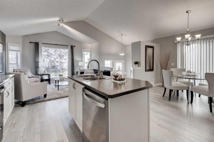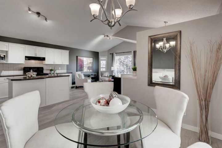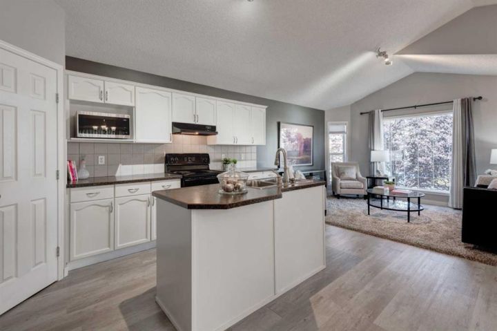 Welcome to this beautifully appointed family home, perfectly nestled in the highly sought-after community of Cimarron Grove. This charming four-level split radiates warmth and character, highlighted by soaring vaulted ceilings that fill the main floor with natural light. The inviting living room flows effortlessly into a spacious dining area and a tastefully updated white kitchen featuring ample cabinetry, a large center island and a convenient walk-in pantry. Upstairs, discover a comfortable guest bedroom, a well-appointed 4-piece bathroom and a tranquil primary suite complete with space for a king-sized bed, a large closet and a private 4-piece ensuite with a jetted soaker tub. The walkout third level offers incredible versatility—perfect for a home theatre, home gym or recreation space—with direct access to the newly fenced backyard, ideal for entertaining or relaxing evenings outdoors. This level also features a convenient wet bar for added enjoyment. The fourth level expands your living space with a bright office or flex room, a practical laundry area, abundant storage and an oversized guest bedroom with a walk-in closet. Meticulously maintained and thoughtfully updated, this home showcases fresh paint, luxury vinyl plank flooring, a newer roof, central air conditioning and more. Ideally located within walking distance to parks, schools, and the vibrant Cornerstone Shopping District—with its fantastic mix of dining, shopping and everyday conveniences—this home perfectly blends comfort, style and lifestyle appeal.