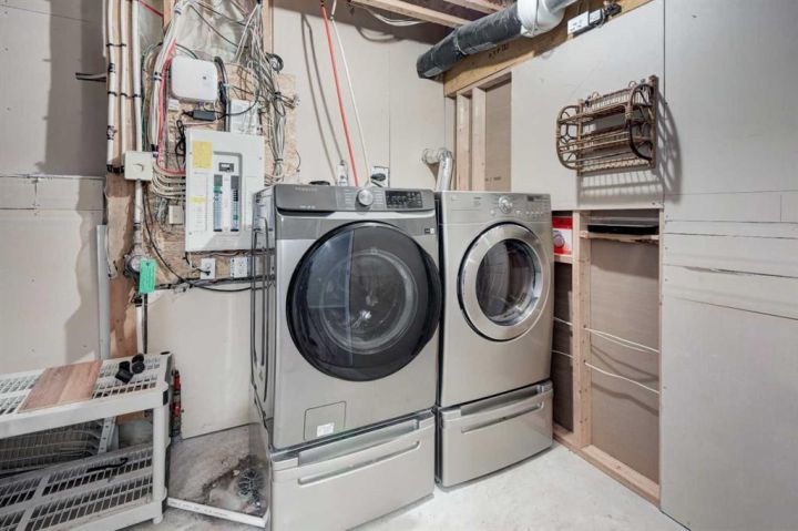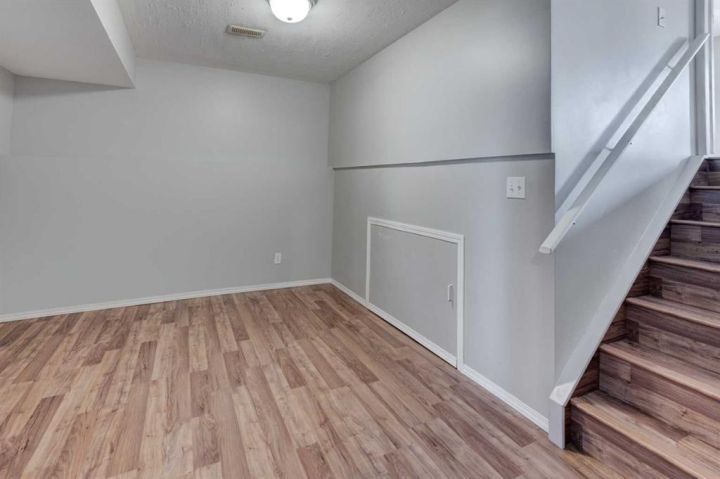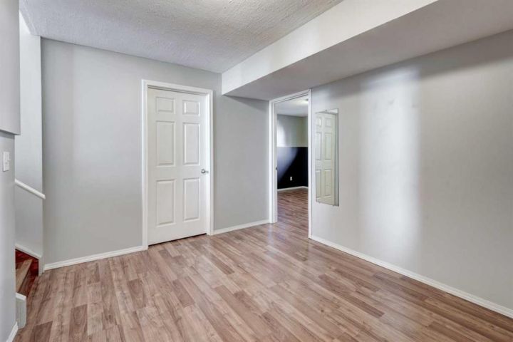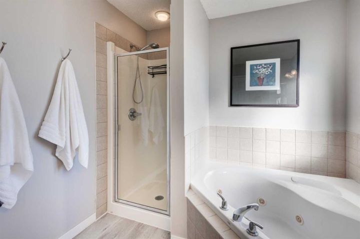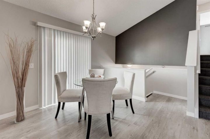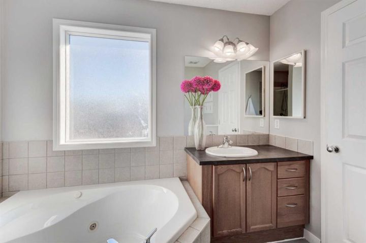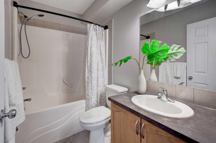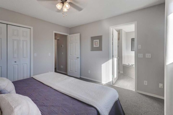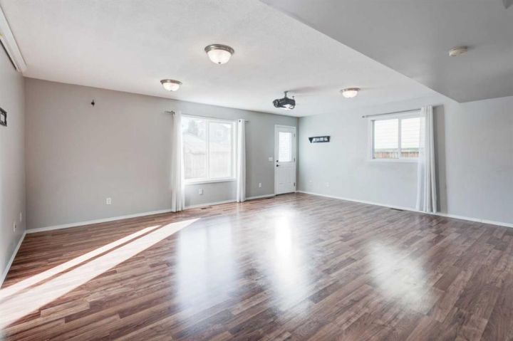 Welcome to this beautifully appointed family home, perfectly nestled in the highly sought-after community of Cimarron Grove. This charming four-level split radiates warmth and character, highlighted by soaring vaulted ceilings that fill the main floor with natural light. The inviting living room flows effortlessly into a spacious dining area and a tastefully updated white kitchen featuring ample cabinetry, a large center island and a convenient walk-in pantry. Upstairs, discover a comfortable guest bedroom, a well-appointed 4-piece bathroom and a tranquil primary suite complete with space for a king-sized bed, a large closet and a private 4-piece ensuite with a jetted soaker tub. The walkout third level offers incredible versatility—perfect for a home theatre, home gym or recreation space—with direct access to the newly fenced backyard, ideal for entertaining or relaxing evenings outdoors. This level also features a convenient wet bar for added enjoyment. The fourth level expands your living space with a bright office or flex room, a practical laundry area, abundant storage and an oversized guest bedroom with a walk-in closet. Meticulously maintained and thoughtfully updated, this home showcases fresh paint, luxury vinyl plank flooring, a newer roof, central air conditioning and more. Ideally located within walking distance to parks, schools, and the vibrant Cornerstone Shopping District—with its fantastic mix of dining, shopping and everyday conveniences—this home perfectly blends comfort, style and lifestyle appeal.