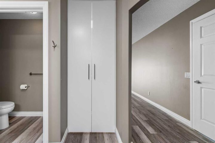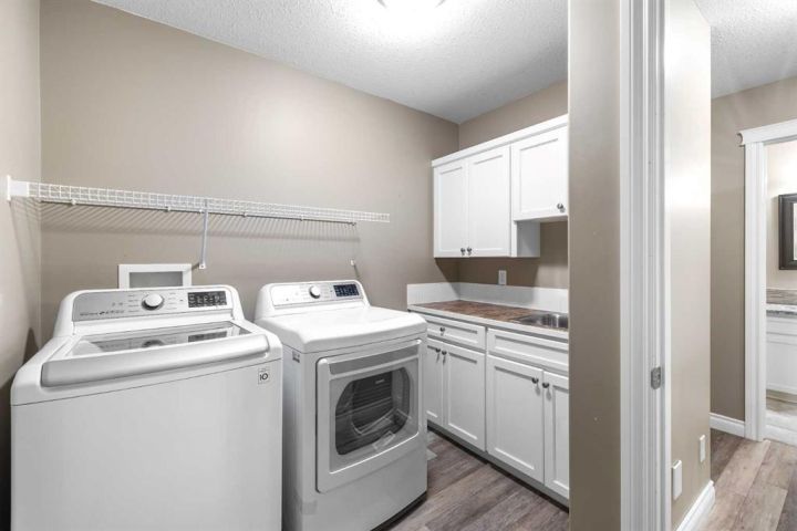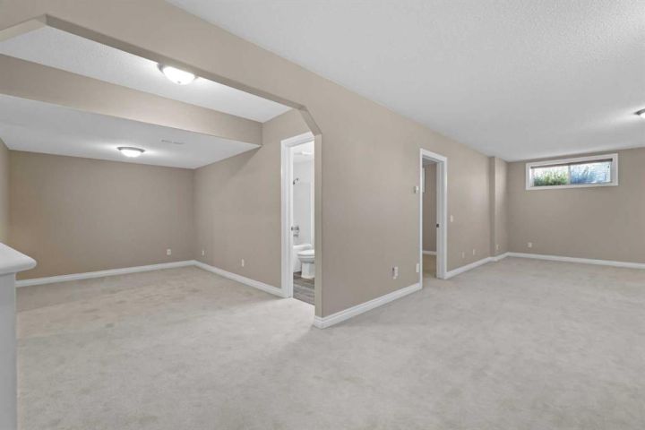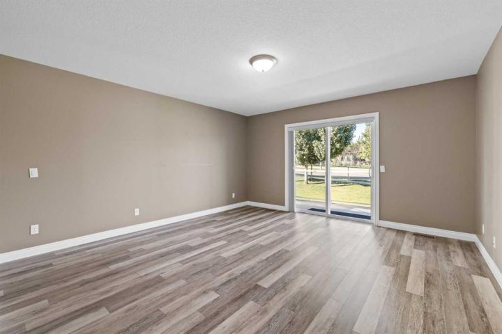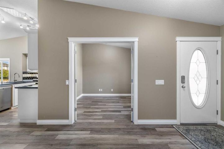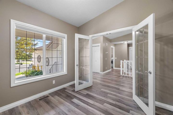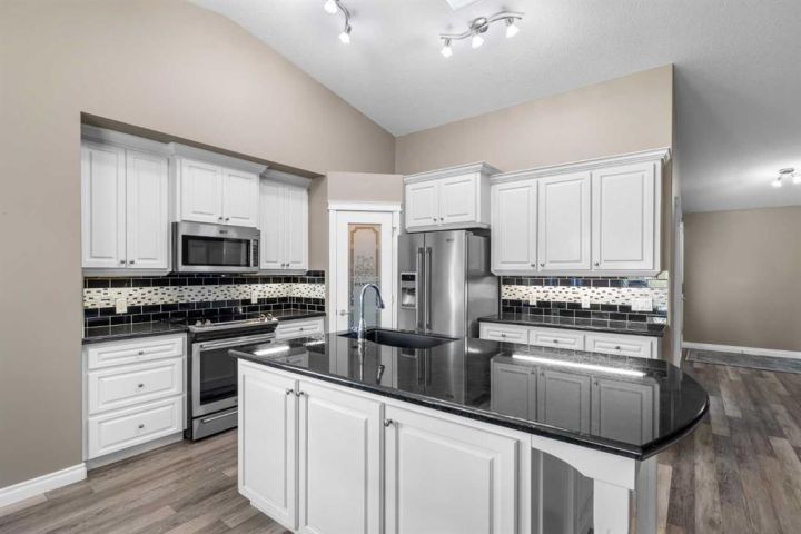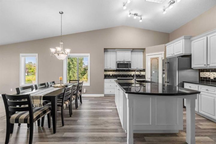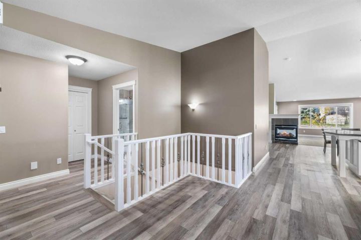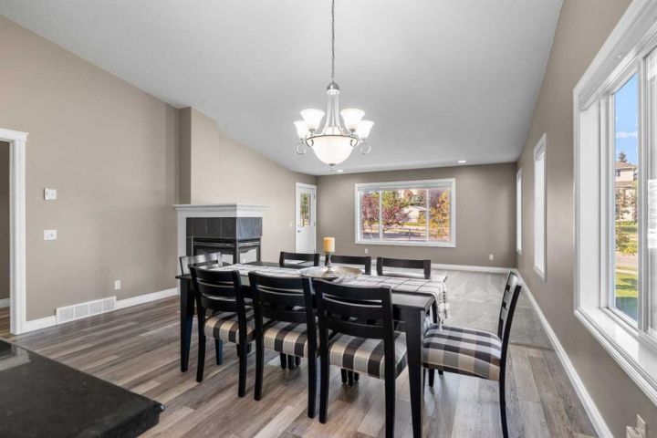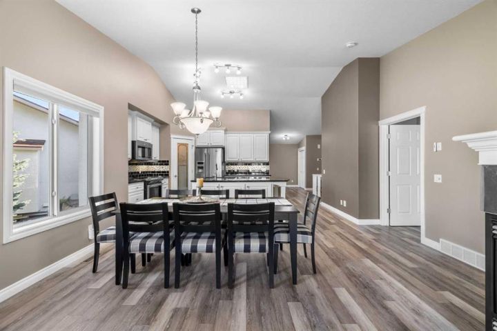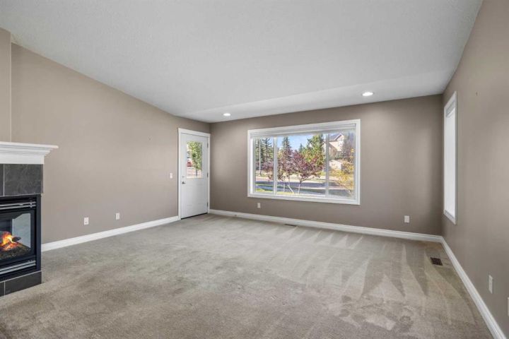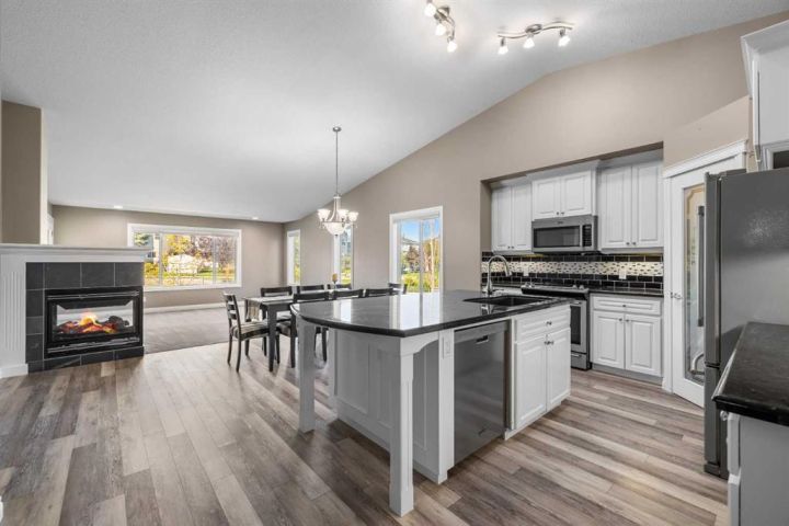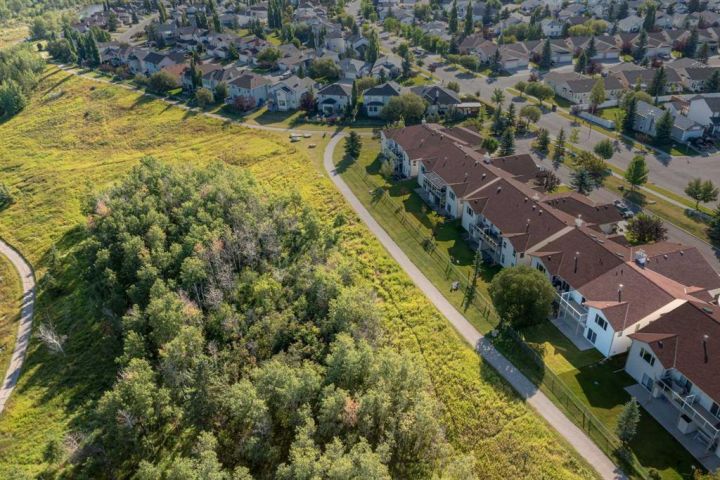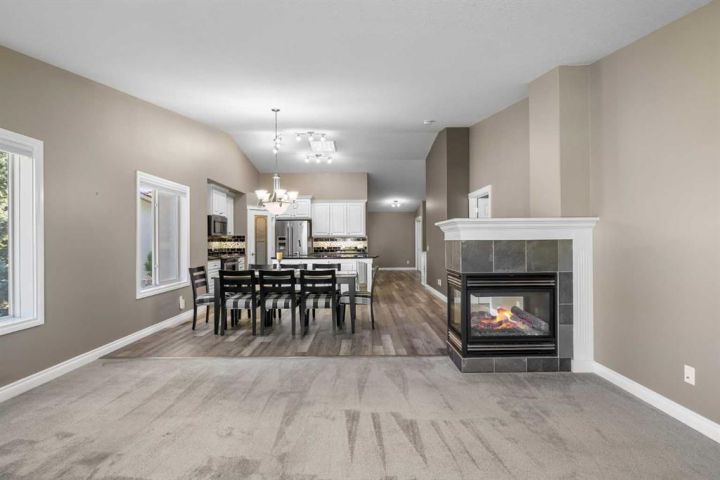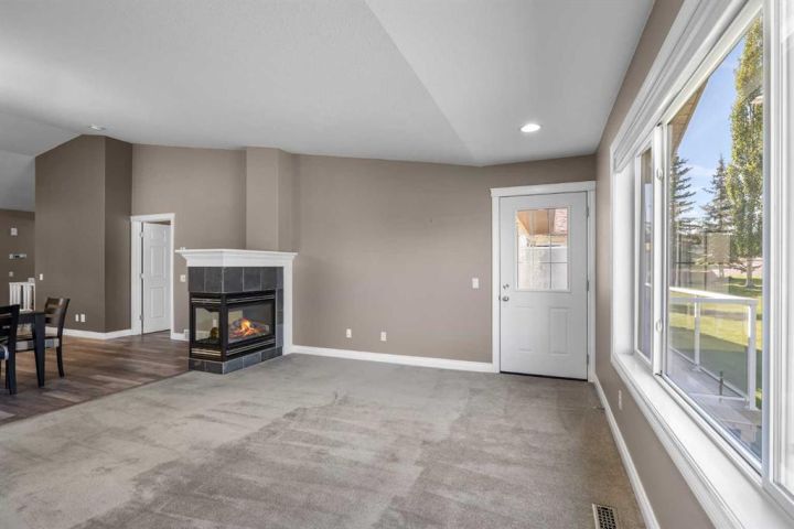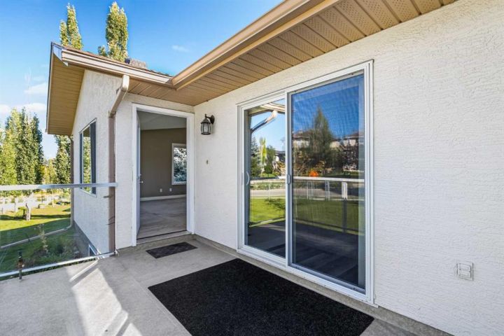 **PLEASE CHECK OUT THE DRONE VIDEO! BEAUTIFUL SPACIOUS and MOVE-IN READY BUNGALOW VILLA IN AN EXCEPTIONAL LOCATION! OVER $78,000.00 IN UPGRADES & RENOVATIONS. Sheep River Vistas is a quiet 55 plus complex that backs onto the Sheep River Ridge pathway and natural treed area offering you expansive unobstructed views of the Sheep River Valley! This fully developed bungalow offers a stunning 2608 sq. ft. of developed living space. A well-designed open concept main floor with bright spacious rooms. Vaulted ceilings throughout the main floor and nine-foot ceilings down. A large welcoming foyer. Bright main floor den with double French doors and east window makes a great home office or quiet retreat. An elegant spacious living room with large west window, two north windows and a French door that opens to the raised balcony that overlooks the well-manicured greenspace. Three-sided peninsula gas fireplace is enjoyed whether relaxing or dining. The spacious dining area is perfect for a large table. The bright and spacious gourmet kitchen with skylight features black granite counters, custom tile backsplash and white painted oak cabinets and walk-in pantry. Large center granite island with eating bar. Convenient renovated main floor three-piece bathroom off the foyer is perfect for guests. Large bright primary bedroom with sliding patio door to the raised west balcony, the perfect place for a morning coffee. Huge, renovated spa inspired three-piece bath with skylight, oversize full height tiled walk-in shower with pull down seat, granite vanity, oak cabinets and separate make-up vanity, private lavatory, additional closet and arched passage into the large walk-in closet. Main floor laundry/mud room features coat storage and laundry, including washer, dryer, large sink, counter, and oak cabinets. An inviting fully developed lower-level with the comfort of in-floor heating. Expansive family room with gas fireplace make this a great area for entertaining. Two large bright bedrooms with walk-in closets and an adjacent renovated four-piece bath with soaker tub. Lots of storage area in the utility/storage room. Oversize double attached insulated and dry walled garage. Excellent grounds keeping and snow removal, so you are free to live the “Villa Lifestyle”. Pets are welcome with restrictions and board approval