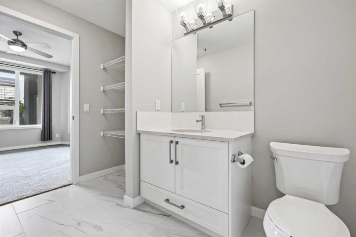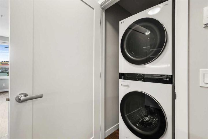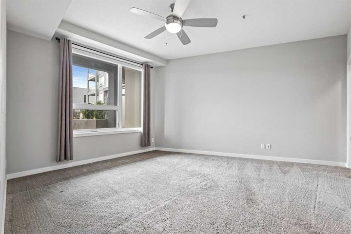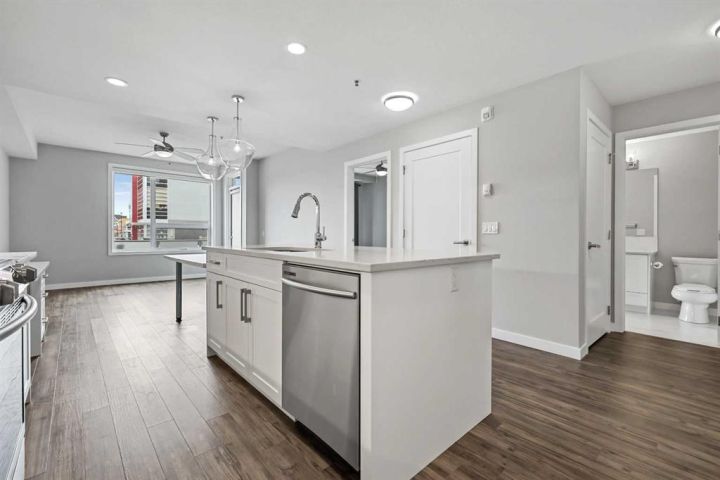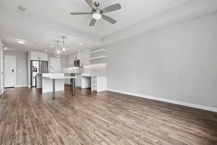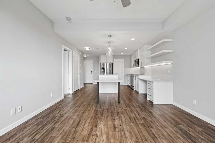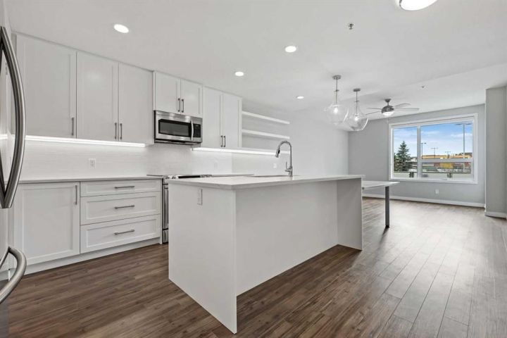 Welcome to this beautifully designed 1-bedroom home—one of StreetSide Developments’ most popular floor plans. Built by a trusted builder with over 27 years of experience, this residence strikes a perfect balance between smart design, innovative finishes, and an unbeatable location. Step inside and discover a bright, open-concept layout that seamlessly connects the kitchen, dining, and living areas—ideal for both entertaining and everyday living. The chef-inspired kitchen showcases a large eating bar, walk-in pantry, and a handy built-in IT station—the perfect nook for working from home or managing your day. You’ll love the contemporary touches, including charcoal quartz countertops, soft-close white cabinetry, upgraded stainless-steel appliances, and durable luxury vinyl plank flooring throughout. The primary bedroom comfortably fits a king-sized bed and offers private access to the 4-piece bathroom, creating a thoughtful blend of privacy and convenience. Extend your living space outdoors to the patio off the great room, a perfect spot to unwind or enjoy your morning coffee. This main-floor unit includes heated underground parking and offers easy access to the outdoors—no waiting for elevators! Ideally located in the sought-after community of West Springs, you’ll be just steps from local shops, cafes, and scenic green-space pathways. With 730 sq. ft. of stylish living, this home delivers the perfect combination of function, comfort, and Westside convenience.