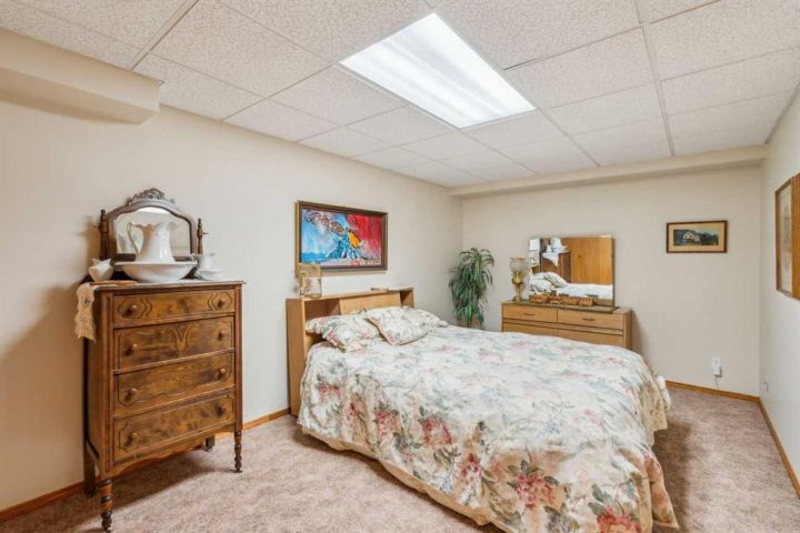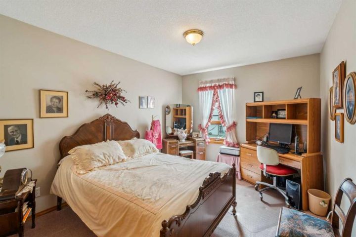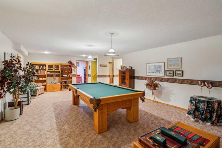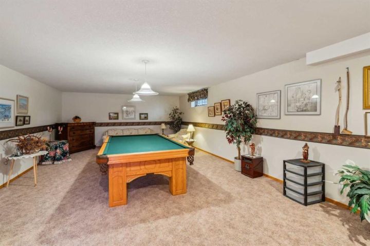 Discover a rare opportunity in the heart of Nanton—this beautifully maintained 1805 sq ft bungalow. Step into a home that blends warmth and elegance with vaulted ceilings, an open concept layout, and mature trees surrounding the property for a peaceful and private setting. The spacious living room and formal dining area are anchored by two cozy gas fireplaces, creating welcoming spaces for gatherings and relaxing evenings. The large kitchen offers plenty of cabinetry, an eating area, and seamless access to the outdoors—perfect for summer entertaining. The oversized primary bedroom provides a retreat of its own, featuring a spa-like 5-piece ensuite with jacuzzi tub. Two additional bedrooms, along with a convenient main floor 3-piece bathroom, offer flexibility for guests or family. Enjoy year-round comfort with in-floor heating, two hot water tanks, and a water softener. The main floor laundry adds day-to-day convenience, while the oversized double garage accommodates your vehicles and storage with ease. Downstairs, the expansive games room, an additional 3-piece bath, and generous storage space round out the functional lower level. Outside, a durable Duradeck-covered deck provides ample space to enjoy the beautifully treed surroundings. Book your private showing today with your favourite realtor.