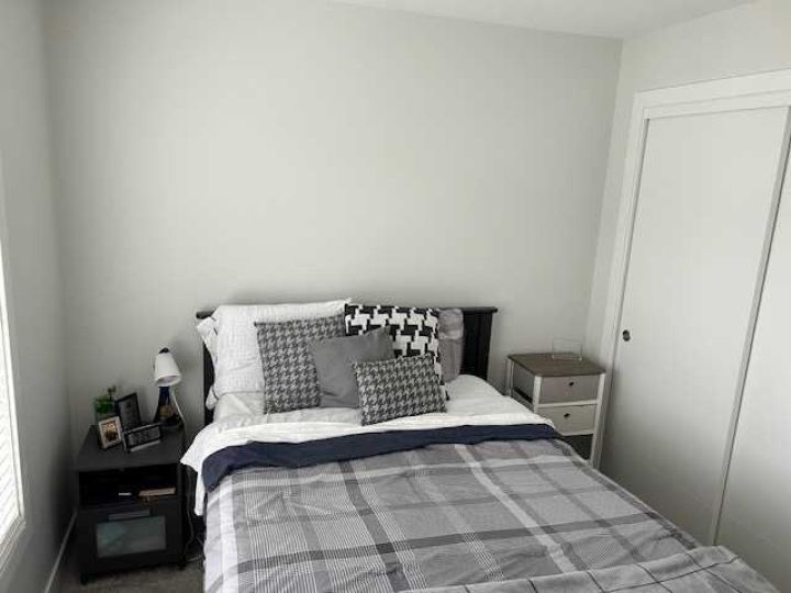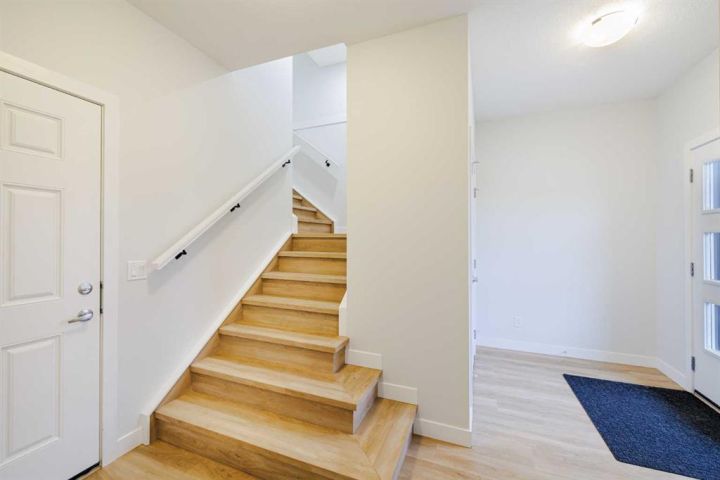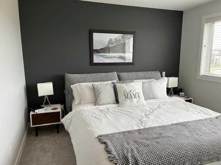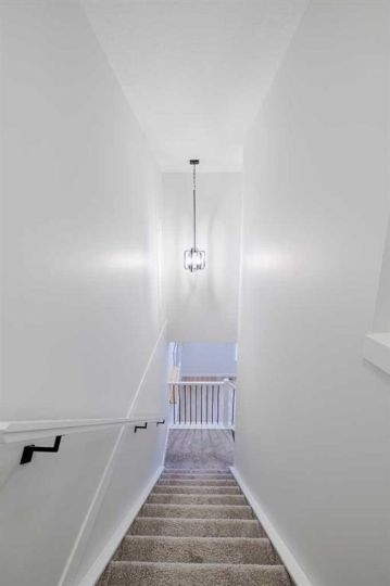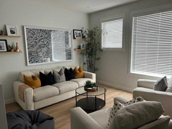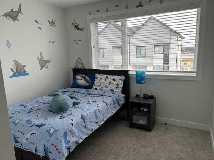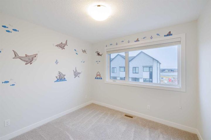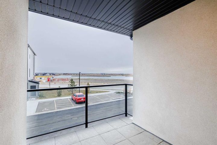 Welcome to this exquisite townhome that epitomizes the perfect blend of luxury, functionality, and natural beauty. Nestled in the highly sought after community of Harmony, this residence stands out with a plethora of upgrades, meticulous maintenance, and thoughtful design. As you step inside this you are met with a great sized den space sitting off the front entrance and steps away from the oversized double car garage. Boasting a forward-thinking 40-amp connection to the garage for electric vehicles, this home is a testament to modern living. Ascending up the stairs you are met with the kitchen which immediately captivates with its elegant features. Quartz countertops glisten, complemented by a large island adorned with a breakfast bar for casual dining. The ceiling-height white cabinetry adds an air of sophistication, and all appliances are an upgraded stainless steel package, including a gas range stove that caters to the culinary enthusiast. A culinary haven wouldn't be complete without a massive pantry, and this home delivers with extensive shelving for optimal organization. Adjacent to the kitchen is the charming eating nook, offering not only a delightful space to enjoy meals but also access to the front deck. From this vantage point, take in breathtaking views of the serene lake. The living room boasts gorgeous natural light, providing a bright and open atmosphere. Large windows frame panoramic views of the majestic mountains, connecting the interior with the surrounding landscape. A beautiful fireplace becomes a focal point, featuring a custom tile surround that adds a touch of elegance and warmth to the space. Arriving at the upper level, the primary suite awaits. The highlight of the primary suite is the custom California closet. The ensuite bathroom is a sanctuary in itself, featuring in floor heating, a private water closet, a standalone shower, and a double vanity at a comfortable counter height. The convenience continues with an upgraded laundry area. Quartz counters above the appliances enhance the space. Additional shelving and a large linen closet ensure that storage is never a concern, adding practicality to the overall design of the home. The upper level is completed with two additional generously sized bedrooms along with a 4-piece bathroom. This townhome goes beyond the ordinary, offering not only a luxurious living space but also a lifestyle that harmonizes with the natural beauty that surrounds it. With meticulous attention to detail, modern upgrades including air conditioning, and a strategic location that maximizes views. With four parking spots between the garage and driveway, this property combines convenience and elegance seamlessly. Enjoy maintenance free living, no snow shoveling or yard work required. Walking distance to the lake and up and coming shopping & amenities development including the Nordic Spa. Pride of ownership is seen throughout.