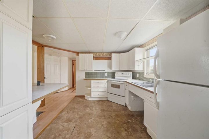 A 2 bedroom home on a large lot! The front entryway greets you to the living room that features a vinyl window with view to the front yard. White melamine kitchen cabinets are complemented by full tile backsplash and an island. There are two bedrooms both with laminate flooring. The back entryway has a laundry area. The large yard has a wood deck and an oversized shed that could be used as a shop. Close proximity to amenities. New hot water tank just installed.