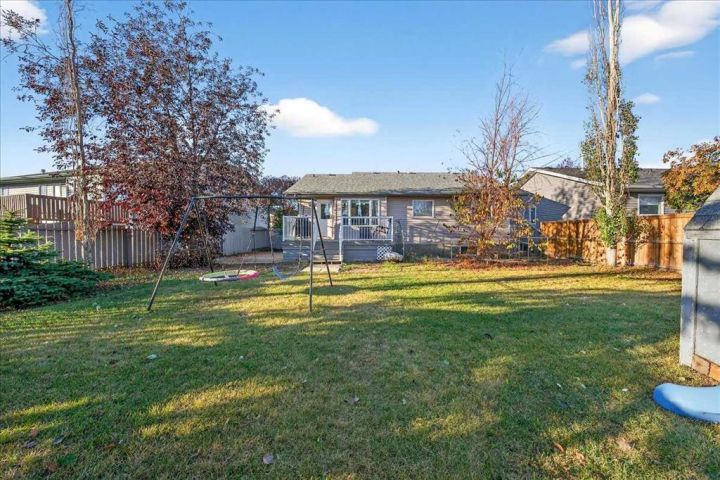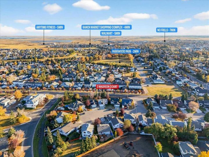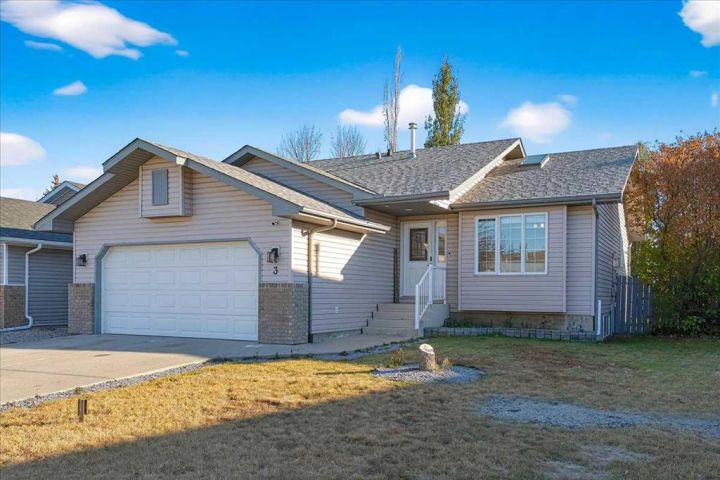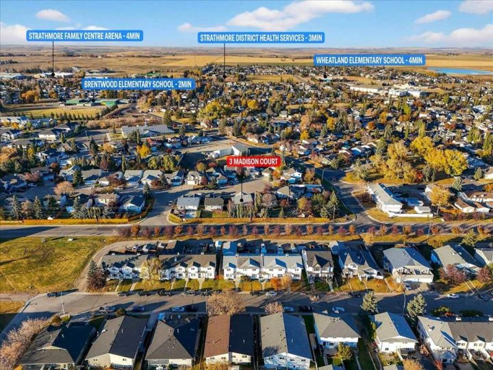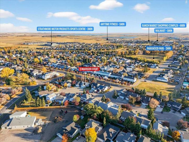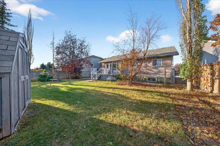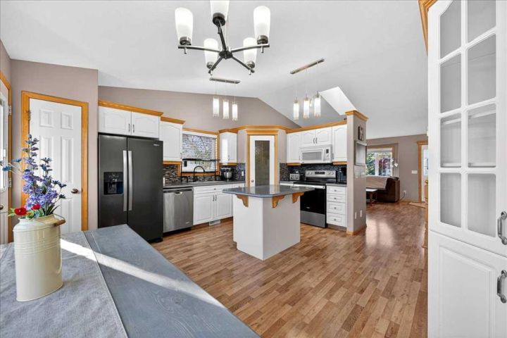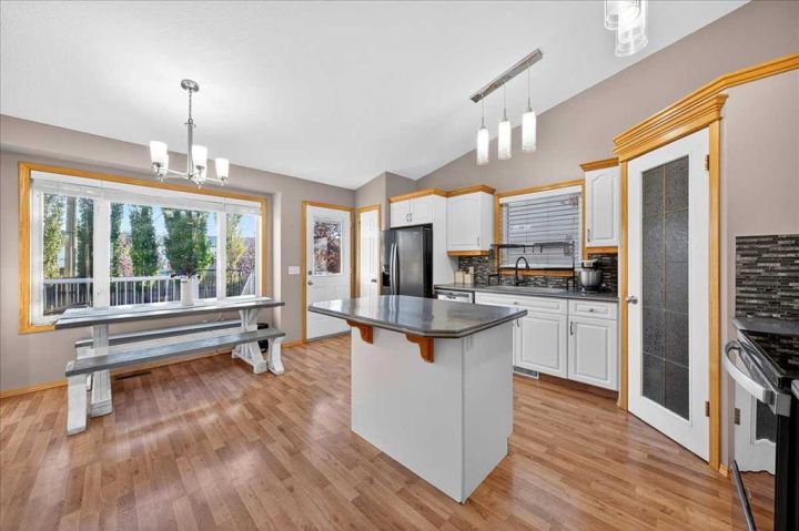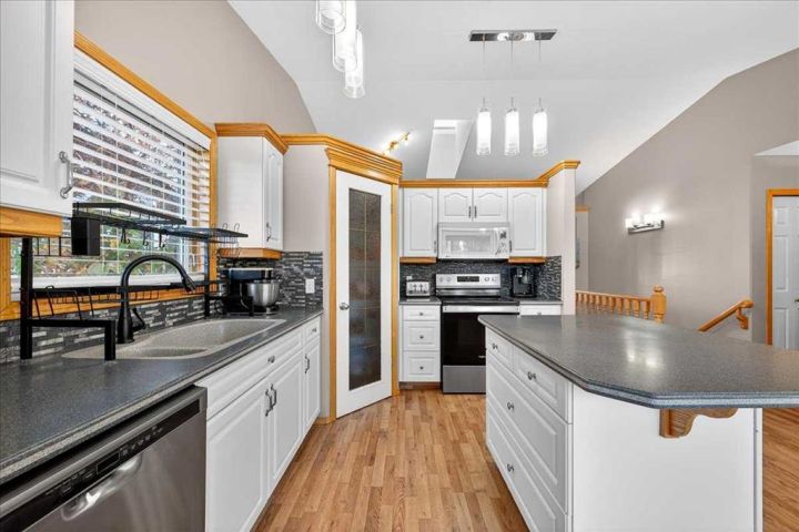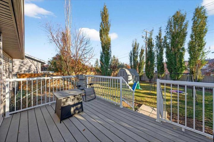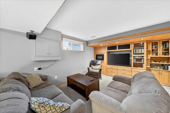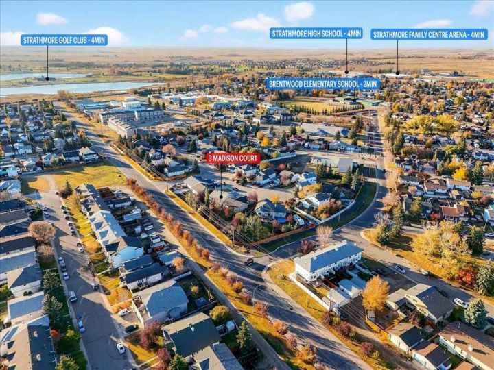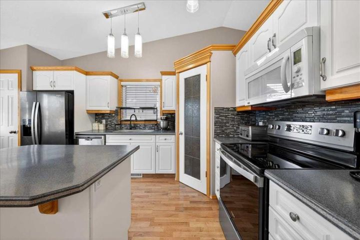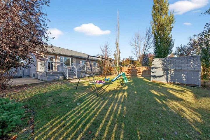 Charming 5-Bedroom Bungalow in Strathmore – Quiet Cul-de-Sac Location!?? PLEASE CHECK OUT THE VIRTUAL TOUR! Welcome home to this classic 5-bedroom, 3-bath bungalow nestled on a beautifully landscaped lot in the heart of Maplewood. Tucked away on a peaceful cul-de-sac, this home offers the perfect blend of comfort, style, and convenience. Step inside to discover vaulted ceilings and a sun-filled living room with a cozy corner fireplace and skylight that fills the space with natural light. The bright, open kitchen features timeless white cabinetry with crown molding, a corner pantry, solid surface countertops, and extra custom built-in cabinetry—ideal for storage and entertaining. From the dining area, patio doors lead to the back deck overlooking the private yard. The main floor offers three bedrooms, including a spacious primary suite with a 3-piece ensuite, plus a 4-piece main bath for family or guests. The fully finished lower level is perfect for relaxing or entertaining, featuring a large family room with built-in entertainment center, surround-sound system, plush carpeting, two additional bedrooms, and another 3-piece bath.