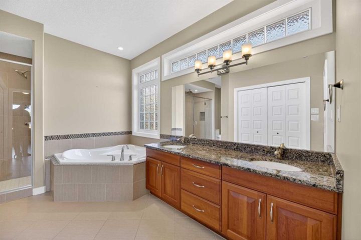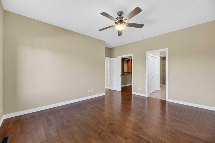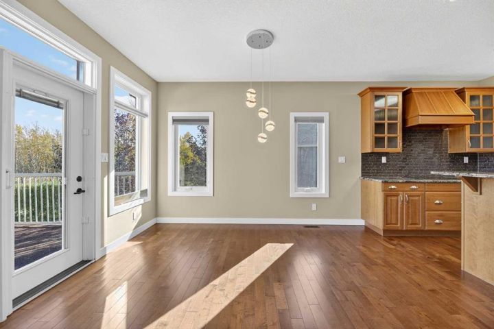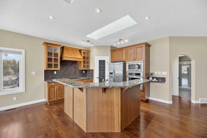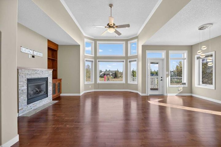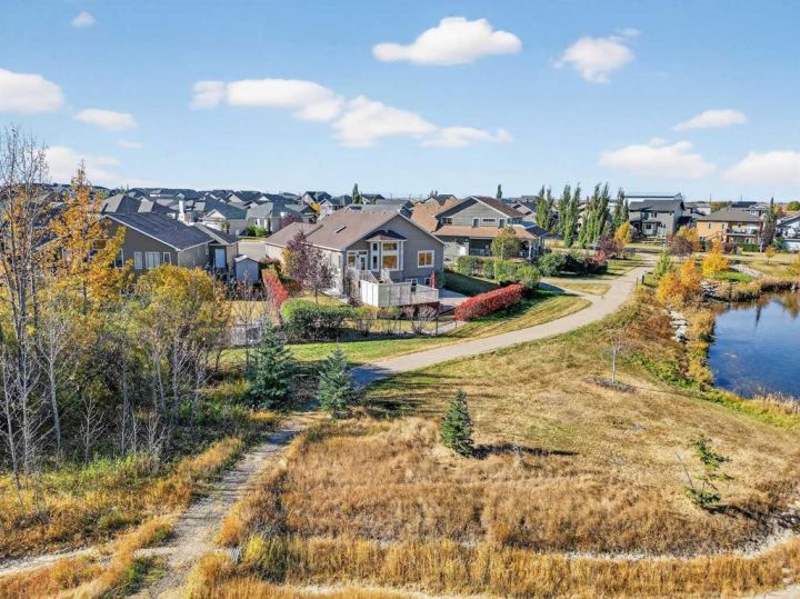 Welcome to 91 Briegel Road in the charming community of Olds, Alberta! This beautifully maintained 1,590 sq ft bungalow with a fully finished basement sits on a spacious 9,591 sq ft lot backing onto a scenic green space and pond, which transforms into a community skating area in winter. Inside, you’ll find 4 bedrooms (2 up, 2 down), 3 bathrooms, and high-end finishes throughout. The primary suite features a luxurious 5-piece ensuite with double sinks, a jetted soaker tub, and a walk-in closet. The spacious main floor laundry room is a dream—complete with cabinets and a laundry sink. The heart of the home includes a vaulted-ceiling living room with a cozy gas fireplace and custom built-ins, a kitchen with granite counters, skylight, walk-in pantry, and a large island—ideal for gatherings. The fully developed basement features 9-foot ceilings, in-floor heat, a massive rec room, 2 additional bedrooms, and a 4-piece bath. Enjoy entertaining outdoors with a two-tier deck (with lighting), gas BBQ hookup, stamped concrete patio, with a gas starter for a gas firepit, and enclosed under-deck storage. Other highlights include central A/C, a heated oversized garage, hardwood floors, and stucco siding. This home is the perfect blend of comfort, elegance, and outdoor living—backing nature with urban convenience just minutes away.