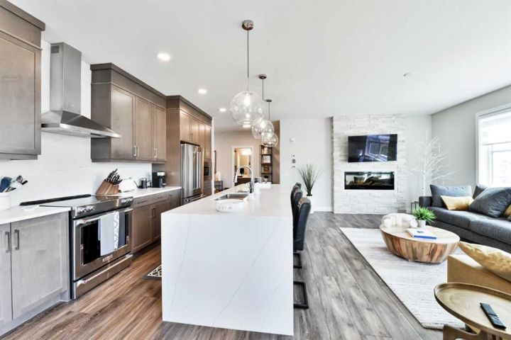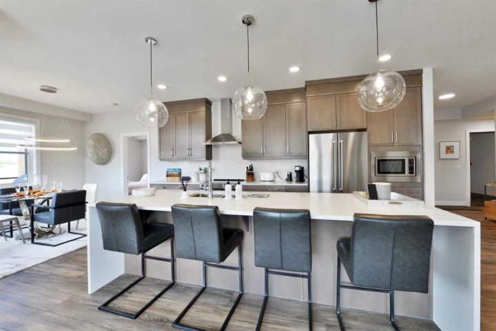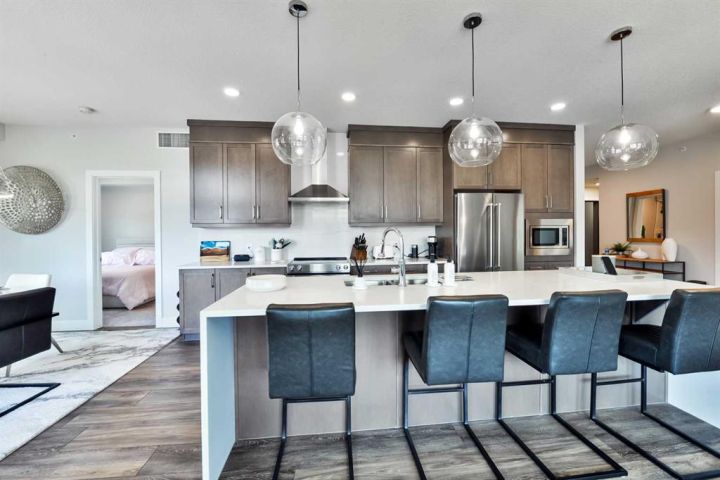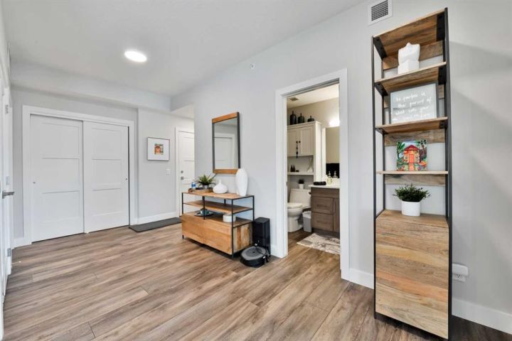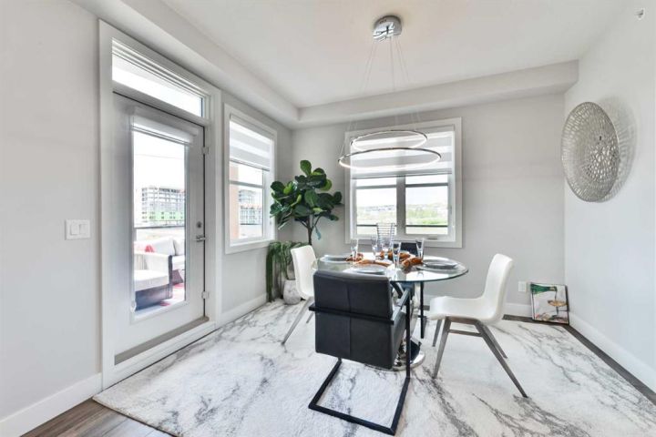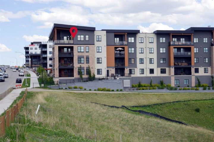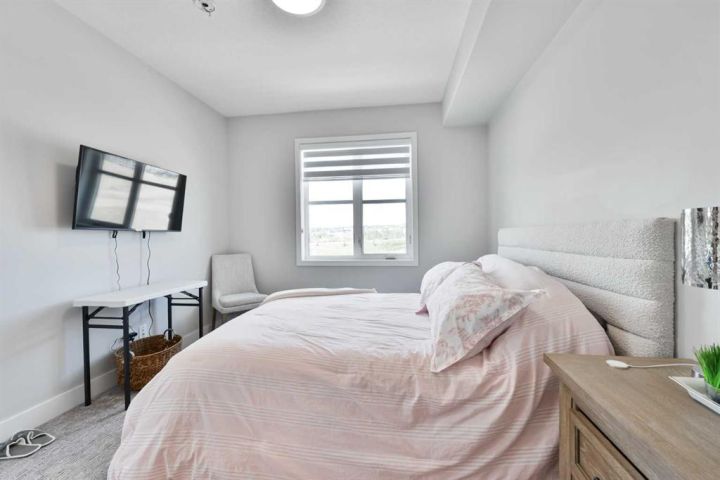 Welcome to this stunning top-floor, corner-unit condo offering over 1,100 sq ft of beautifully designed living space, featuring 2 bedrooms, 2 bathrooms, and an exceptional layout that blends comfort with functionality. From the moment you step inside, you’re greeted by an abundance of natural sunlight and a spacious front entry. To your left, a discreet laundry area and a generous flex room with double doors—ideal as a home office or additional storage—add to the versatility of this home. The thoughtful split-bedroom layout ensures privacy, with a large secondary bedroom and full bathroom on one side, and a spacious primary suite on the other, complete with a walk-in closet and private ensuite. At the heart of the home is the open-concept great room, dining area, and gourmet kitchen—perfect for entertaining. Step outside onto the expansive wraparound balcony and take in the serene ravine and mountain views. Two conveniently located underground parking stalls (#39 & #40) are just steps from the stairwell—making it a breeze to run up to the unit or quickly access your vehicle. Perfectly situated just a short walk to Aspen Landing’s shops, restaurants, and amenities, and within close proximity to top-rated public and private schools. Enjoy easy access to downtown Calgary, the mountains, and the airport, along with nearby public transit and future park spaces. Whether you're downsizing, investing, or seeking a lock-and-leave lifestyle for winter travel, this impressive residence offers it all.