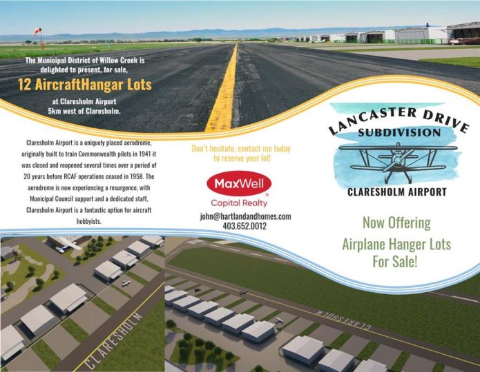 Now available at the recently upgraded Claresholm Airport, a registered southern Alberta Aerodrome with no user fees. 12 building lots beside the recently sealed taxiway along the main 3100 ft runway. The main runway was recently upgraded with an asphalt overlay and lighting which is also scheduled for upgrade in 2026 along with upgrades to follow in the future for the 3100 ft cross runway. The Municipality has made a firm and enthusiastic commitment to continually upgrade and maintain the Claresholm airport now and into the future! These .25 acre lots are priced very reasonably at $65,000 per lot and $85,000 for the one larger .46-acre lot. There is a two year time limit on building commencement as well as a restrictive covenant to protect collective development integrity regarding the size and design of a storage building which is to have provision for an aircraft door on the runway side of the lot. All services are at the lot line and responsibility for hookup is the buyers. If the commercial building is to be used as a hangar then access surface to the taxiway is also the buyer’s responsibility. Any living quarters must be built along the back of the building along Lancaster drive. The covenant is available on request from the listing realtor. There is GST required on the property. Right now, this is an excellent, early opportunity to get in on the ground floor of an exciting new development just off the highway 2 corridor 1 hour south of Calgary. Located just a few minutes outside the bustling town of Claresholm near the base of the Porcupine Hills, population 3,804. Better have a look as the lot options are wide open right now and yours for the choosing!
