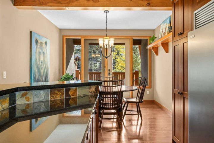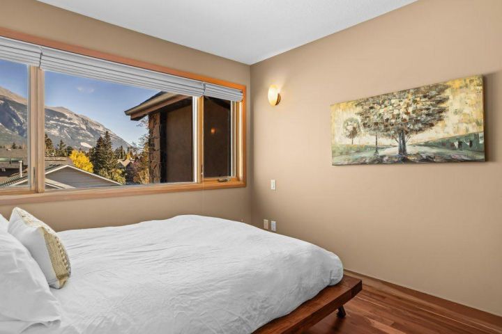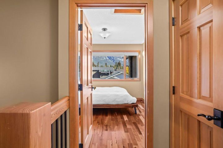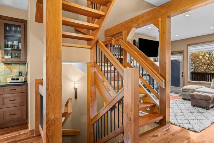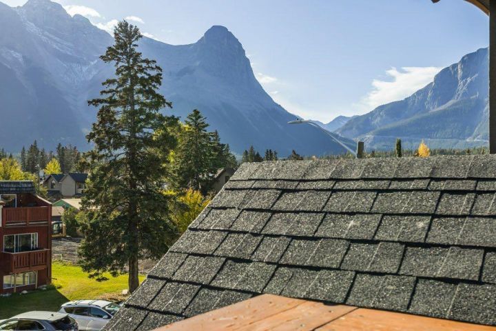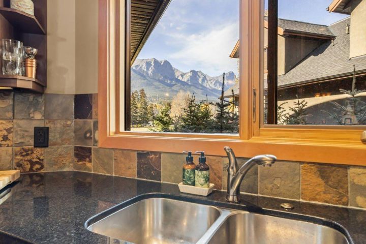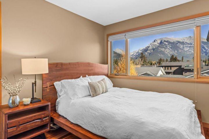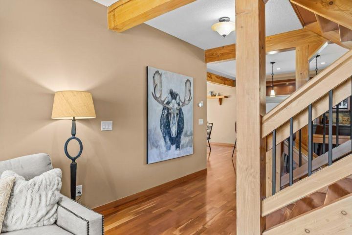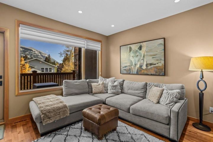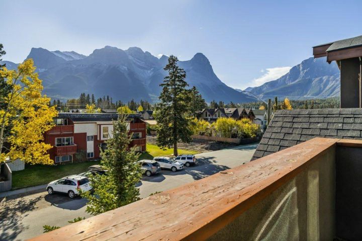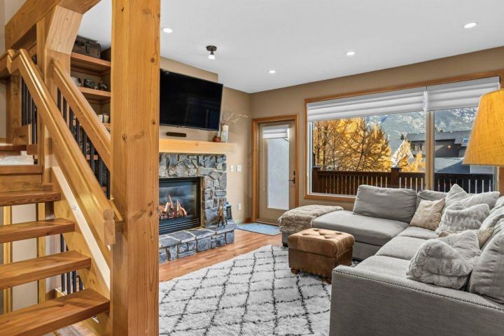 Immaculately maintained South Canmore townhome located steps from Downtown restaurants, shops and the Bow River walking trails. Perfect as a vacationer retreat, investment property or full-time living. This Elk Run Custom Home features 3 full baths, and 3 bedrooms. Four patios offer panoramic views of the Bow Valley from its South, East and West facing windows. The interior showcases exceptional craftsmanship with cherry hardwood flooring, floating stairs, custom cherry cabinetry, wood beams, granite countertops, and in-floor heating on the main level. The luxurious primary suite includes a steam shower and in-floor heating in the ensuite bath for a true spa like experience. Additional features include a single attached car garage equipped with a 220 volt outlet for an EV charger. Enjoy the warmth of the Rundle rock gas fireplace in the cozy living room or relax on one of the outdoor patios while taking in the stunning mountain scenery. Make this your home today.