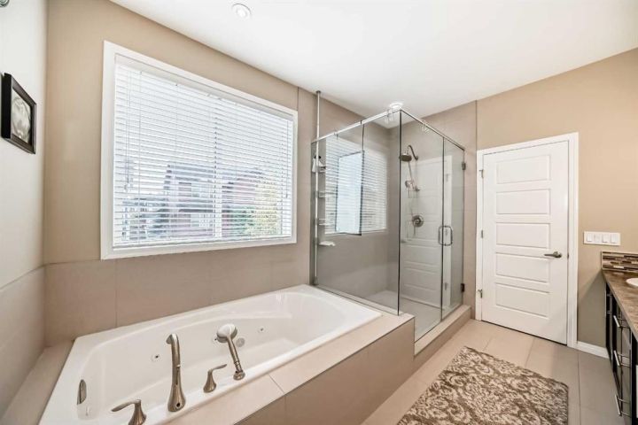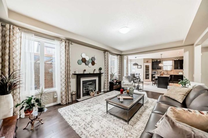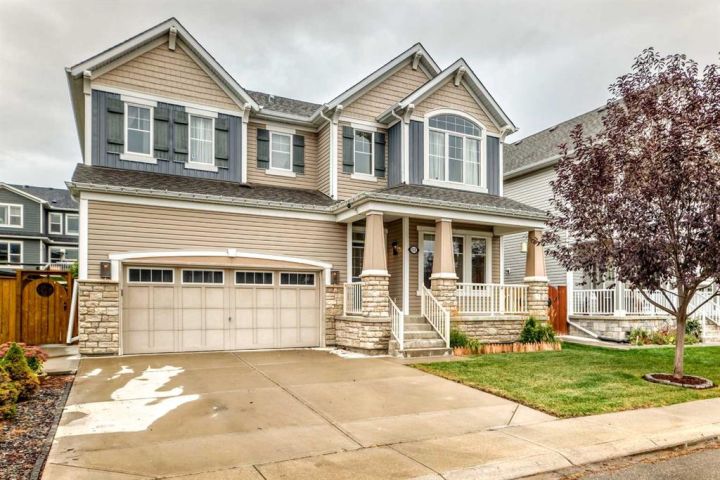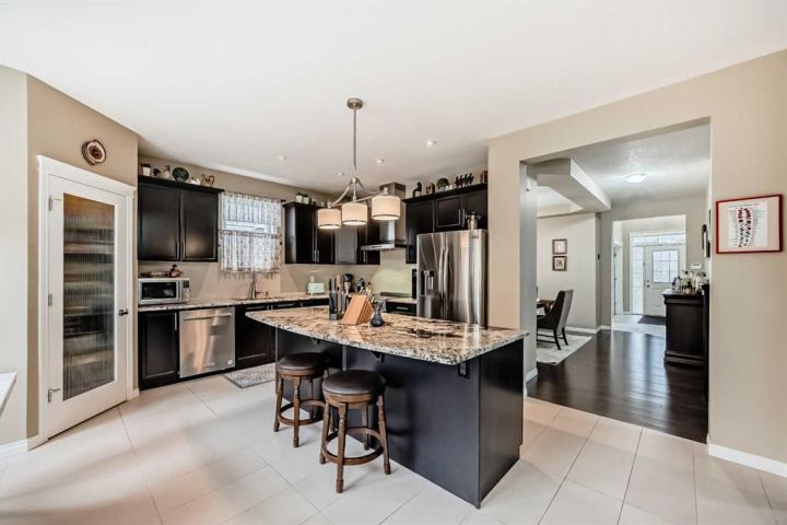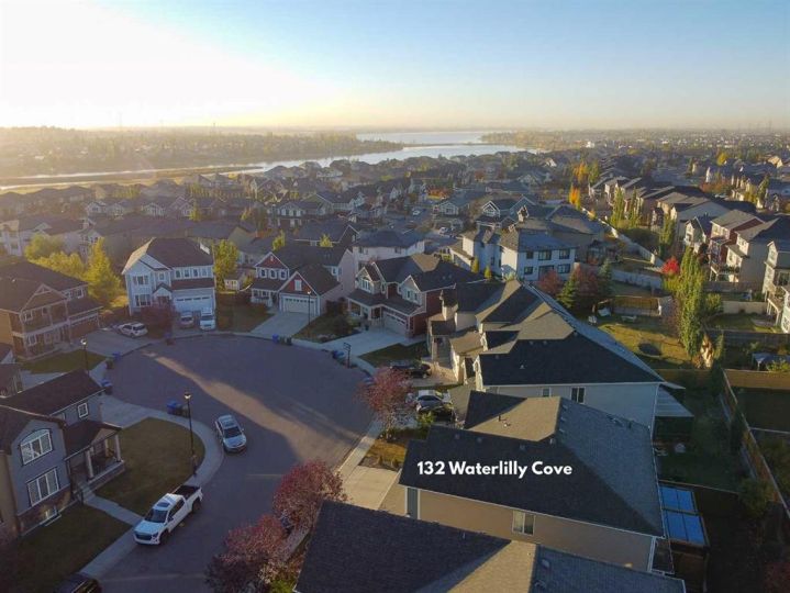 Welcome home to 132 Waterlily Cove - a farmhouse-style oasis built by award-winning Mattamy Homes, where warm family memories await. Nestled on a quiet cul-de-sac in Lakepointe, this home offers more than 2,800 sq ft above grade, head-turning curb appeal with its huge verandah, and an oversized double attached garage. Step through the foyer and you're greeted by a vaulted ceiling, welcoming you inside. Gorgeous maple hardwood and ceramic tile stretch throughout the main floor, complemented by 9ft ceilings you’ll find on both levels. Need to work from home? There’s a private home office behind frosted double French doors. Want to host dinner parties? A formal dining room with a tray ceiling sets the mood. The heart of the house is the modern kitchen - espresso shaker maple cabinets, marbled granite counters, stainless steel appliances (including induction stove & hood fan), a huge corner pantry, and a big island with extra storage. The adjacent breakfast nook is bright, framed by 6ft windows that bring the outdoors in. Enjoy cozy evenings in the family room, anchored by a ceramic-tiled gas fireplace with a rich dark maple mantle. In summer, the stamped concrete patio with custom pergola beckons for family BBQs or lazy afternoons. Beyond, the yard is beautifully landscaped and well-maintained. Upstairs, you’ll find a massive bonus room - great for movie nights or a kids’ hangout. The primary suite is a retreat, large enough for a king bed, with two walk-in closets! The ensuite includes a soaker tub, glass-encased shower, and a 7ft dual vanity. Two additional generous bedrooms and another full bathroom with double sinks ensure everyone has space. Laundry is also upstairs, with extra storage, and the recently added A/C keeps things comfy year-round. The unfinished basement is a blank canvas waiting for your ideas - there's space to add another bedroom, rec room, and even a full bathroom. Location is everything. In Lakepointe, you get walking trails, parks, green space, and proximity to Chestermere Lake for boating, paddleboarding, and fishing - plus easy access to shopping, schools, and highways. If you’re looking for a family home that blends style, comfort, and a community outside of the big city - this is it!