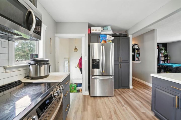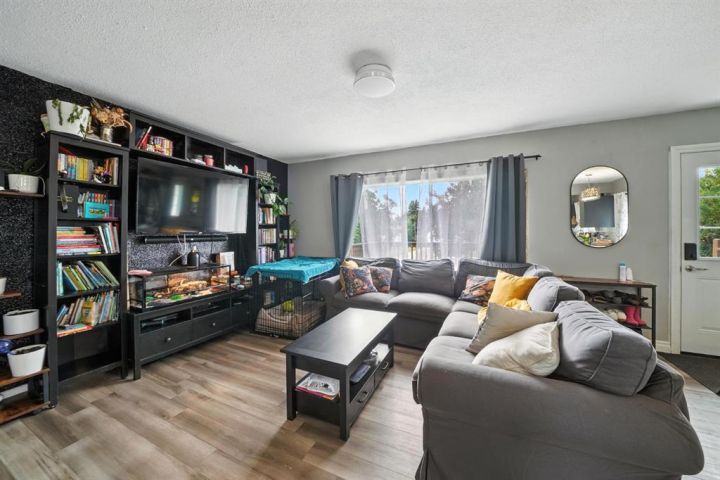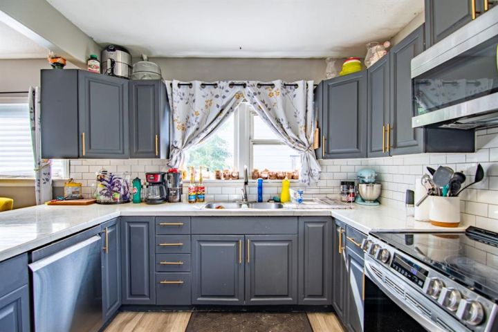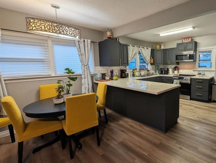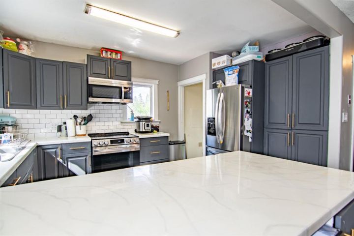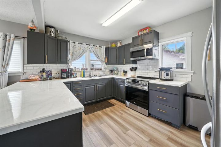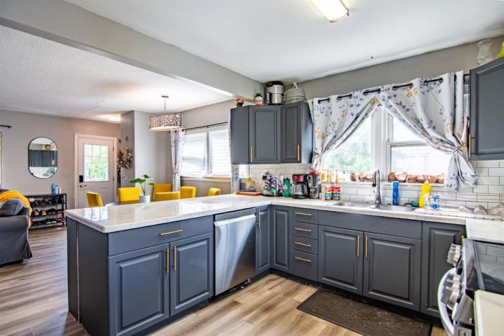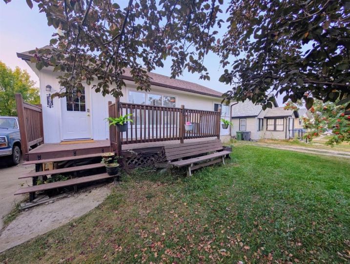 FIRST TIME HOME BUYERS or PERFECT FOR THE SIGNLE GUY WHO WANTS TO TINKER IN A GARAGE: check out this Sweet cottage style bungalow in the heart of family oriented Rimbey . . . plenty of charm and tons of potential to make this property your forever home. Situated on a large lot with a single detached garage and plenty of space for dogs and kids to play in the backyard. Large front deck facing south . . . perfect place to start your morning with a cup of coffee on this very mature quiet street with your own beautiful Chokecherry tree. Inside you will find lots of updates over the last few years PLUS NEW WINDOWS UPSTAIRS (some were already replaced in 2015) just installed! Main floor kitchen and living room is very bright and open. Lots of space for the family to gather whether watching movies or entertaining guests. Lovely newer vinyl flooring, fresh paint , new backsplash, epoxy countertops, oak cabinets painted grey and newer appliances. Two bedrooms upstairs plus family bathroom also with updates including porcelain tile and new toilet. Downstairs has a large rec room with wood burning fireplace for the chilly winter nights. So much potential in this basement for growing families! Seller is leaving flooring and other supplies for the handyman who wants to finish up the last few jobs! Plus 1/2 bath downstairs is functional! This home has lots of extras including AIR CONDITIONING, hardy-board siding, new electrical panel in 2023, shingles 2015, hot water tank in 2019, Blower motor and furnace maintenance done in 2025 plus a NEW board. Perfect home for young couples looking to start a family, investors or a couple wanting to retire in a lovely smaller town. . . you will want to check this home out. Close to all amenities, swimming pool, skate park, playground, schools and shopping . . .you won't regret it!