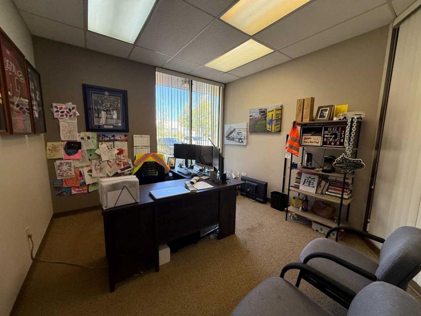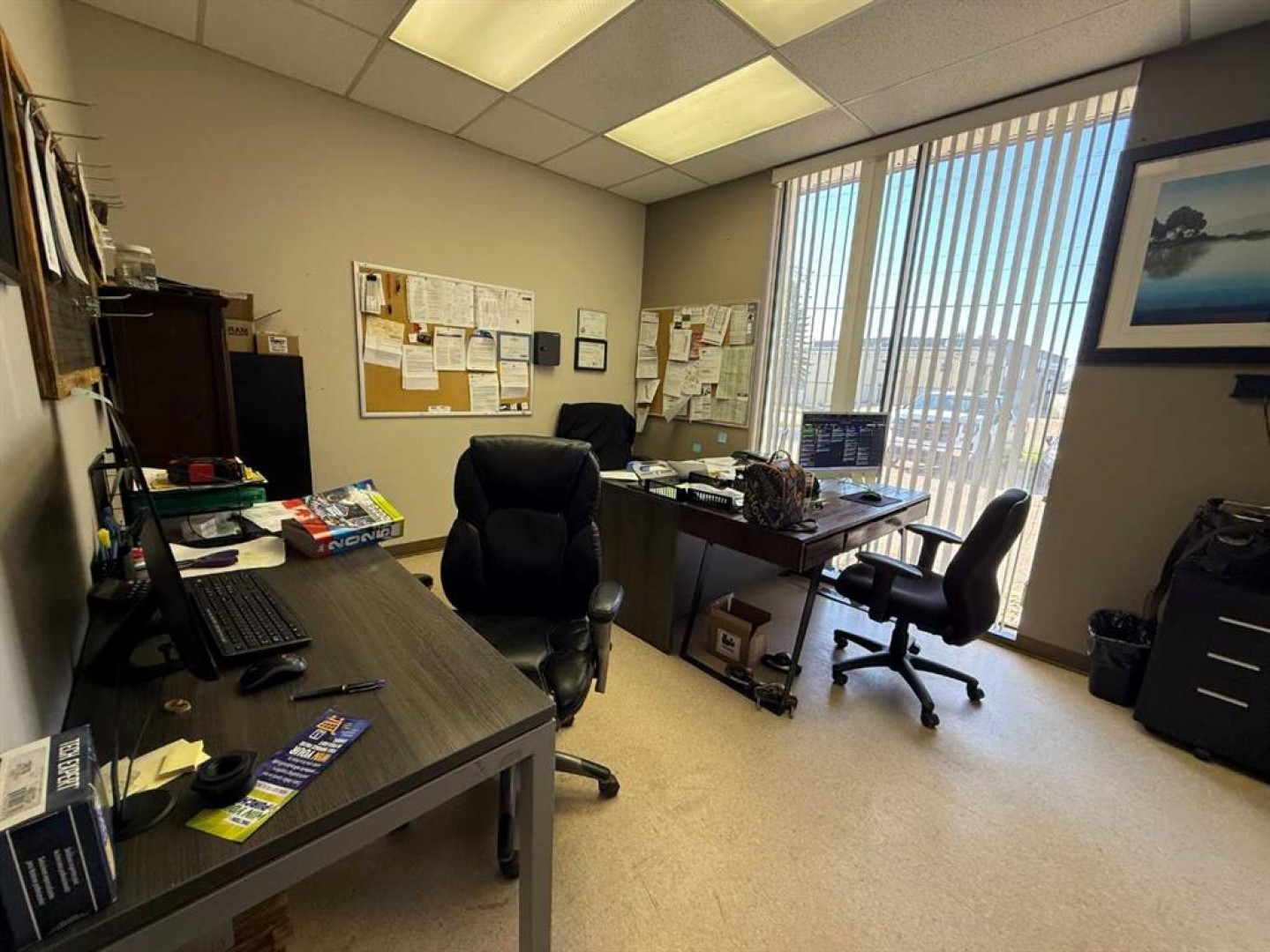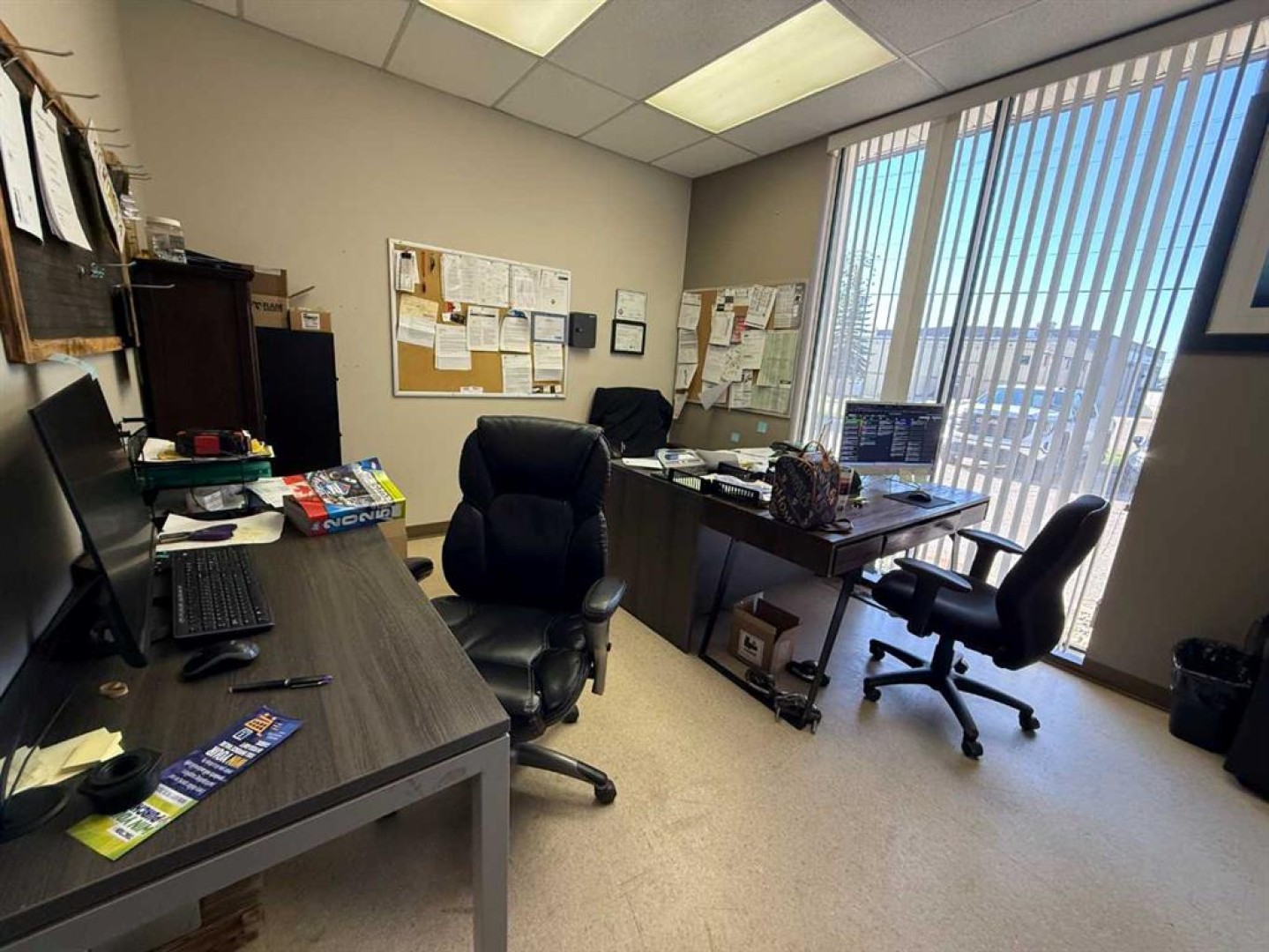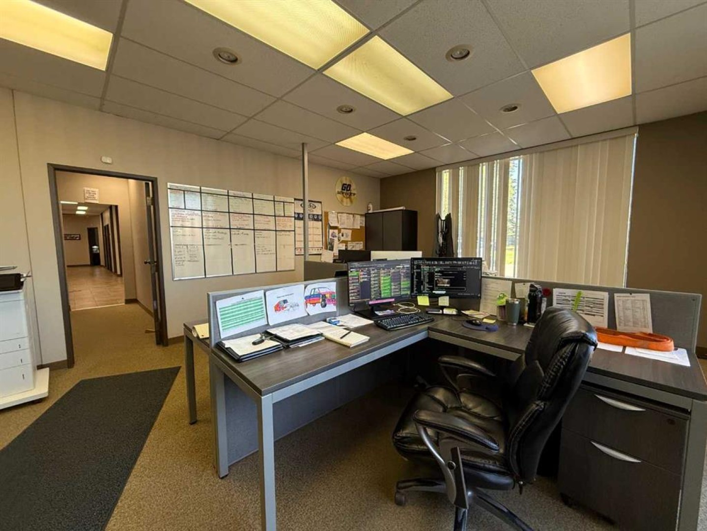 Well-positioned in Edgar Industrial, this freestanding industrial building offers a versatile combination of office, shop, and yard space. The air-conditioned office component includes a spacious reception area, boardroom, staff kitchen with sink and dishwasher, copy room, two washrooms, and a janitor’s closet with mop sink—designed to support both administrative and operations teams. The shop is divided into two functional areas, both outfitted with upgraded LED lighting. A drive-in wash bay and three 100’ drive-thru bays in the north shop provide efficient access and workflow. The exterior features a fully powered, graveled, and well-lit yard with secure gated access and excellent drainage tied into the adjacent City storm pond. Located just off Highway 11A with quick access to Taylor Drive, the property also benefits from high exposure along Highway 11. This site offers strong logistical advantages for industrial users needing space, visibility, and yard capability. Additional rent is $4.42 PSF.