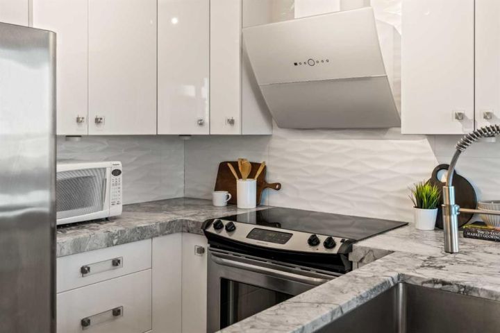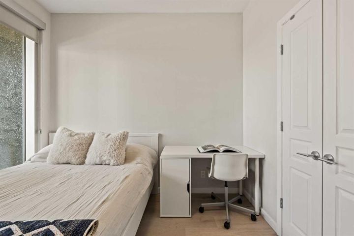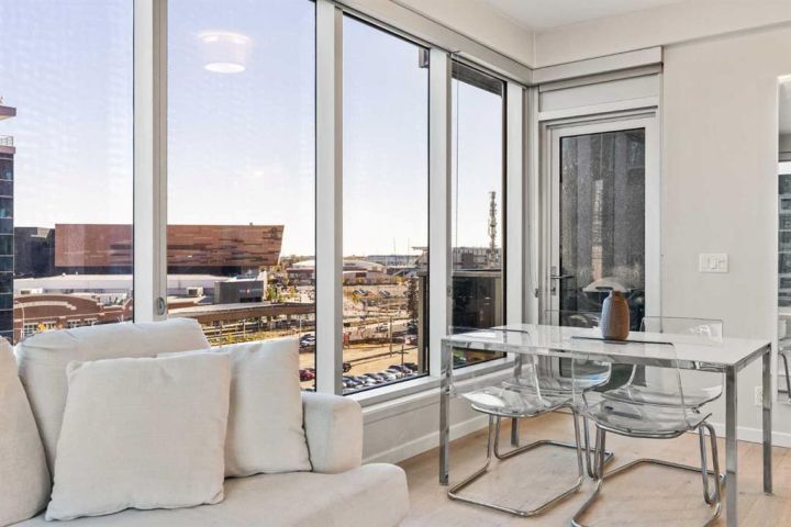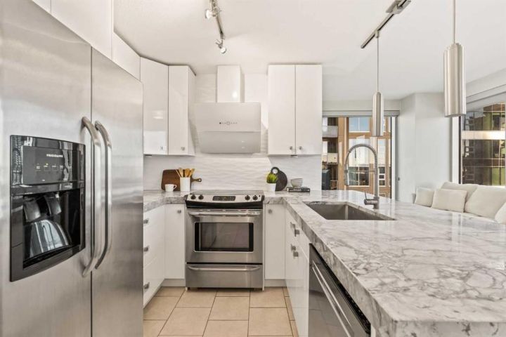 Welcome to Alura, where timeless elegance meets contemporary design in this fully renovated condo. This beautifully updated property features 2 bedrooms, 2 bathrooms and TWO Titled Parking Stalls - a very rare offering for a Beltline condo! This property redefines luxury urban living in the heart of downtown Calgary. The bright kitchen features mitred-edge marble countertops with a dramatic waterfall finish, a custom Italian-engineered hood fan, and full-height high-gloss cabinetry that provides both beauty and functionality. Resilient tile flooring flows throughout the main entry, hallway and kitchen, with updated hardwood flooring throughout the living space and bedrooms. The open-concept living and dining areas are flooded with natural light and offer stunning panoramic city views, including breathtaking morning sunrises that illuminate the skyline and views of downtown Calgary from both the living area and primary bedroom. The full dining space + island peninsula seating makes hosting and entertaining that much easier and more comfortable. The primary suite is a true retreat, complete with captivating downtown views, a fully customized walk-in closet, and a luxurious 4-piece ensuite with updated vanity and granite countertops. A second bedroom which is located at the opposite end of the condo for optimal privacy, and full bathroom make this layout ideal for guests, a home office, or shared living. Step outside to your private, fully covered balcony - an all-season outdoor oasis perfect for morning coffee, evening wine, or year-round barbecues. Additional features include 2 Titled underground heated parking stalls (providing rental income for a stall if only one is needed), a secure storage locker, and access to Alura’s premier amenities including concierge and a full gym. Located in an amenity-rich building with easy access to the downtown core, 17th Avenue and endless restaurants and retail options nearby, this property is ideal for young professionals or investors. This home offers the perfect balance of sophistication, comfort, and convenience - everything downtown living is meant to be.