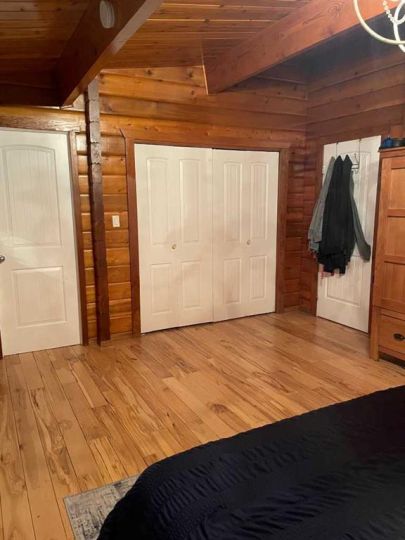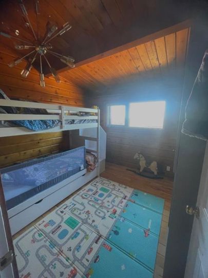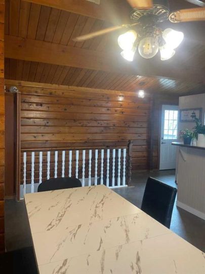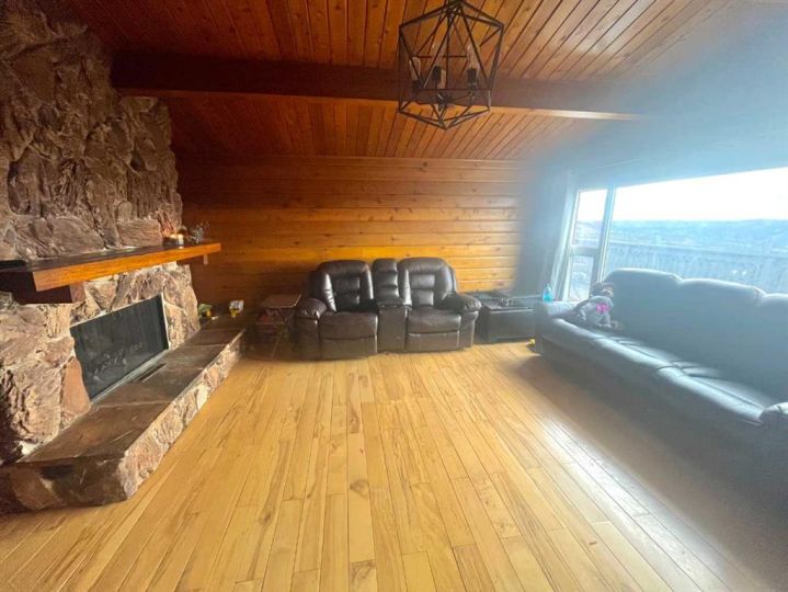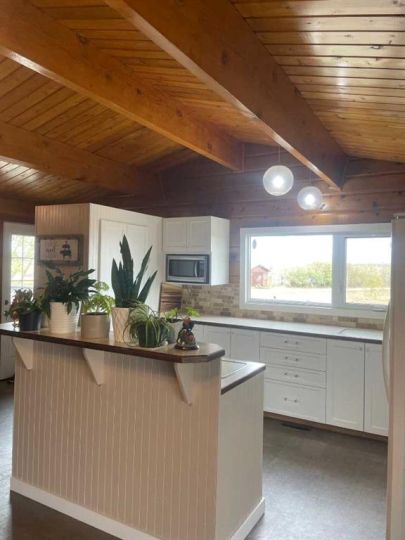 A beautiful maple-lined entrance welcomes you to an immaculate 4-bedroom, 2-bathroom home featuring a wraparound deck, partially enclosed for year-round enjoyment. Inside, you’ll find designer lighting, hardwood floors, and warm neutral décor. The bright white kitchen offers a breakfast bar, dining nook, and stylish pendant lighting, while the wood-burning fireplace with stone surround sets a cozy tone in the living room.