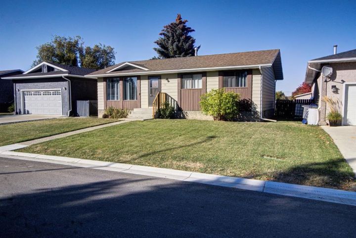 Charming Bungalow Near the Golf Course Located just a couple blocks from the beautiful 18-hole golf course, this well-kept bungalow offers a great blend of comfort and potential. The main floor features three bedrooms, updated 4pc main bath, laminate flooring throughout, and a bright, spacious living room with large south-facing windows that fill the home with natural light. The dining area offers plenty of space for family gatherings, while the cute corner kitchen includes room for a breakfast table—perfect for morning coffee or casual meals. Primary bedroom has a 2pc ensuite. Downstairs, the basement is ready for your finishing touches, with a framed-in rec room, laundry area, and storage space—plus room to add additional bedrooms if desired. Outside, you’ll find a generous backyard with a ground-level patio and ample space to create your dream garden or outdoor retreat. Move-in ready with quick possession available—this home is a wonderful opportunity to enjoy small-town living close to the golf course and all local amenities.