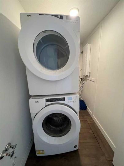 Dishwasher, Electric Stove, Refrigerator, Washer/Dryer Stacked