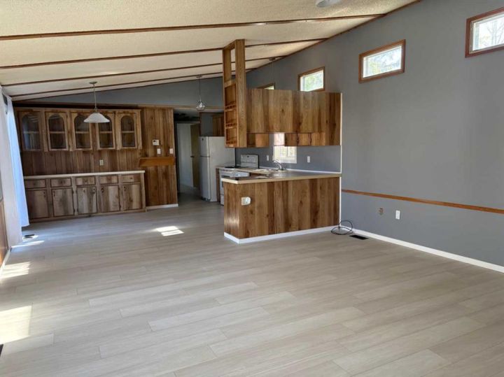 Why Rent when you could purchase this 3 bedroom 2 bathroom mobile home in Aloha Mobile Home Park. This mobile home is MOVE IN READY. The Sellers have completed a number of upgrades including new vinyl flooring, new baseboards, updated light fixtures, fresh paint through out and remodeled 4 piece bath and new vinyl widows . The dormer styled windows in the living area provide extra natural light even during the winter months You will love the large kitchen area with built in china cabinet and loads in the eating area for your entire family. The primary bedroom features double closets. Two additional bedrooms and a remodeled 4 piece bath are on the opposite end of the mobile away from the Primary bedroom. Head out thru the patio doors and have coffee on your deck and enjoy the very private fenced back yard. Paved parking stalls for two vehicles. Do not hesitate and phone your realtor today to book a showing, you will not be disappointed. Quick Possession