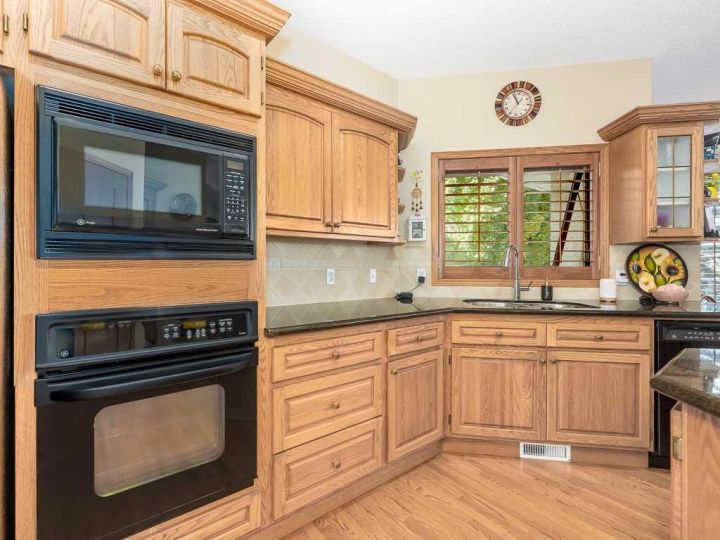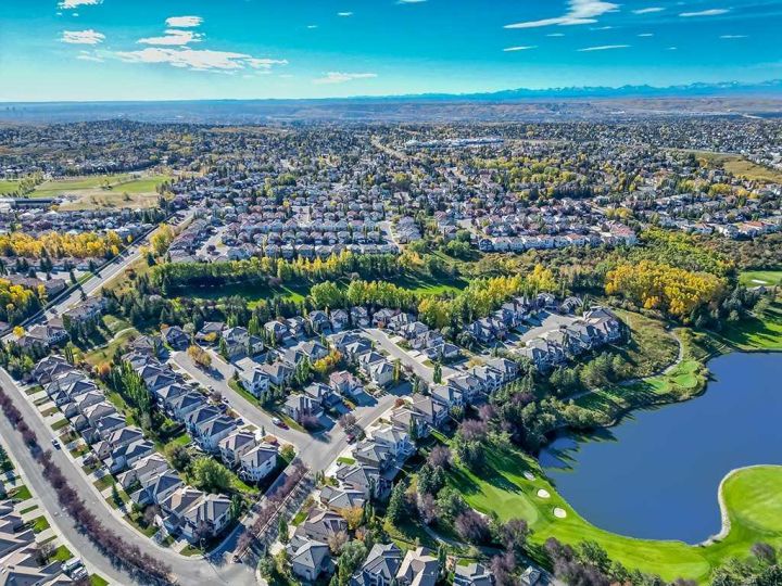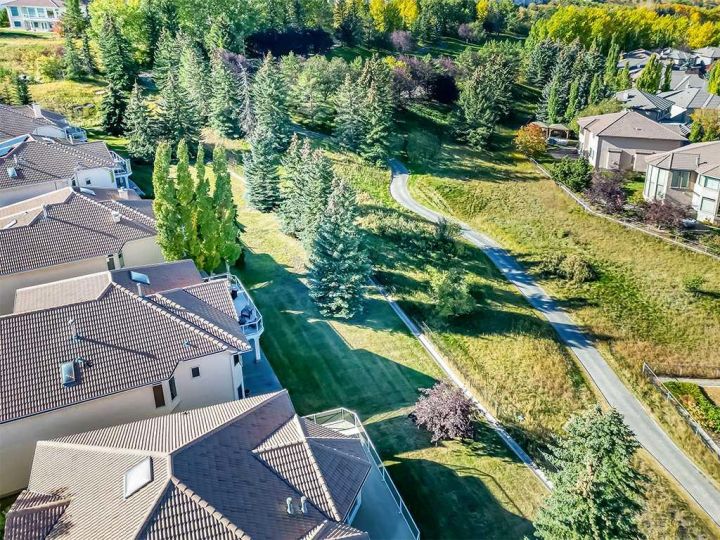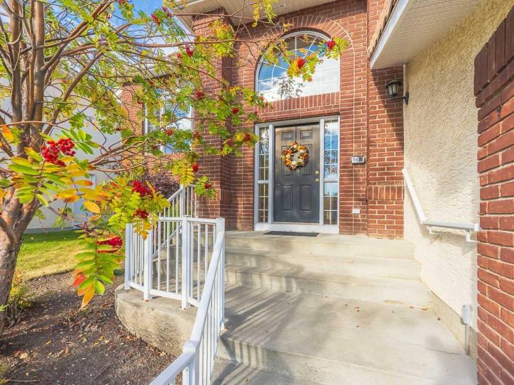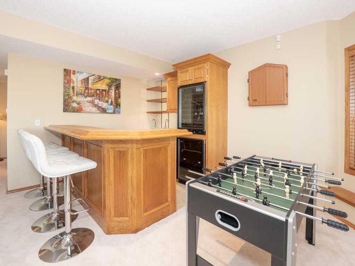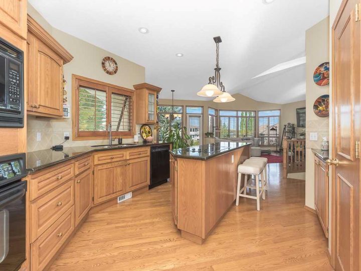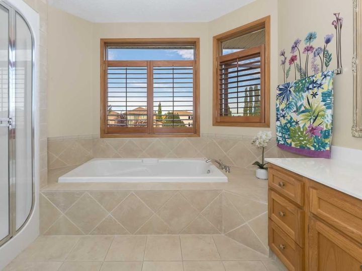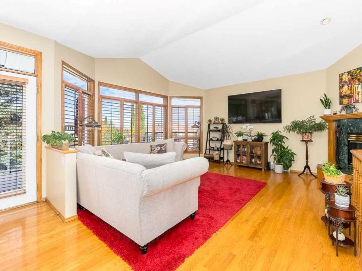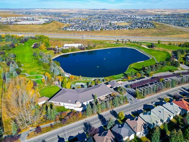 Immaculate raised walkout bungalow backing directly onto the golf course with stunning, unobstructed panoramic views in the highly sought-after community of The Hamptons. This beautifully maintained executive home showcases a timeless brick and stucco exterior with a clay tile roof and a spacious open-concept floor plan with soaring vaulted ceilings. The bright main level features gleaming hardwood floors and a welcoming living room with a cozy corner gas fireplace and a wall of windows that capture spectacular views and fill the space with natural light. The gourmet kitchen offers granite countertops, a large central island, built-in appliances, and a convenient pantry. Enjoy morning coffee or evening sunsets from the adjacent breakfast nook with access to the full-width rear deck overlooking the expansive yard and golf course beyond. The formal dining area with French doors opens to a private den, ideal for a home office. The primary suite boasts a luxurious five-piece ensuite with a jetted tub, separate steam shower, and walk-in closet. A generous second bedroom and full main bath complete the main level. The professionally developed walkout basement is perfect for entertaining, featuring a massive recreation room with numerous windows allowing for abundant natural light, a wet bar, built-in entertainment unit, second gas fireplace, and access to the lower patio. A third bedroom, four-piece bath, laundry room, and plenty of storage complete this level. Additional highlights include central air conditioning, a double front attached garage, and exceptional pride of ownership throughout. An unbeatable location just minutes from parks, schools, shopping, and golf, with easy access to Stoney Trail, Shaganappi Trail, the University of Calgary, and Foothills Hospital. A rare opportunity to own a walkout bungalow in this coveted setting.