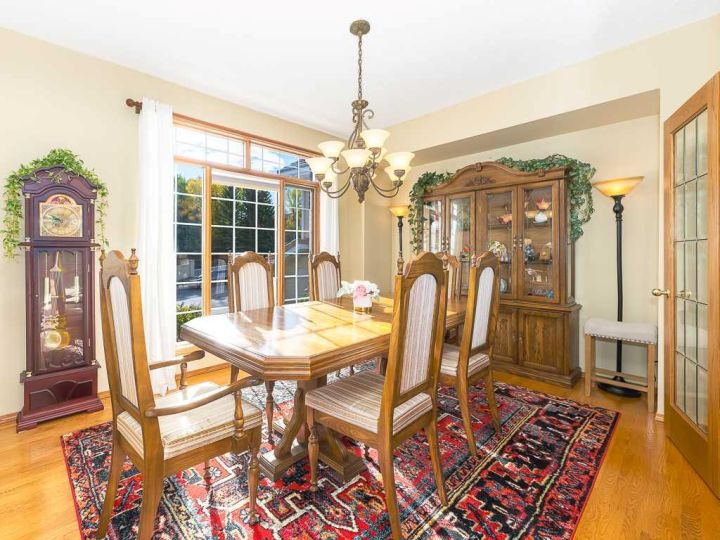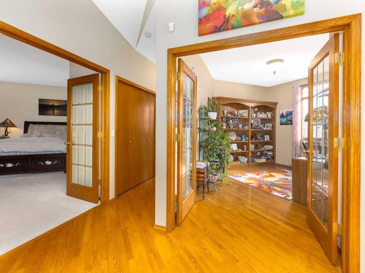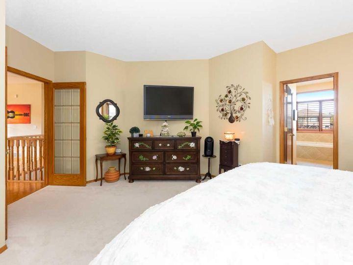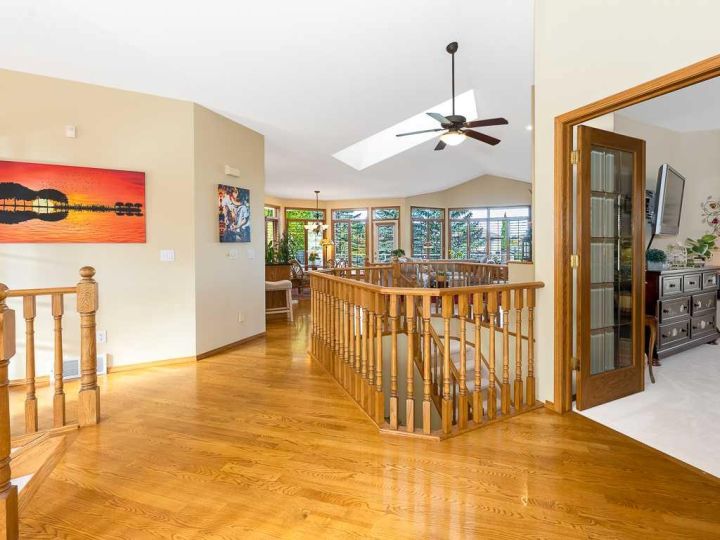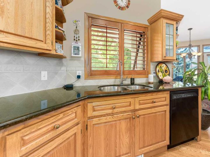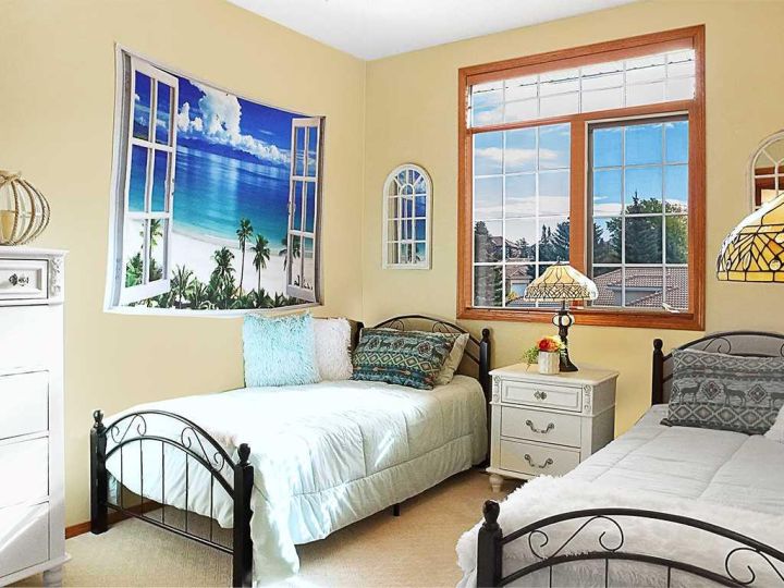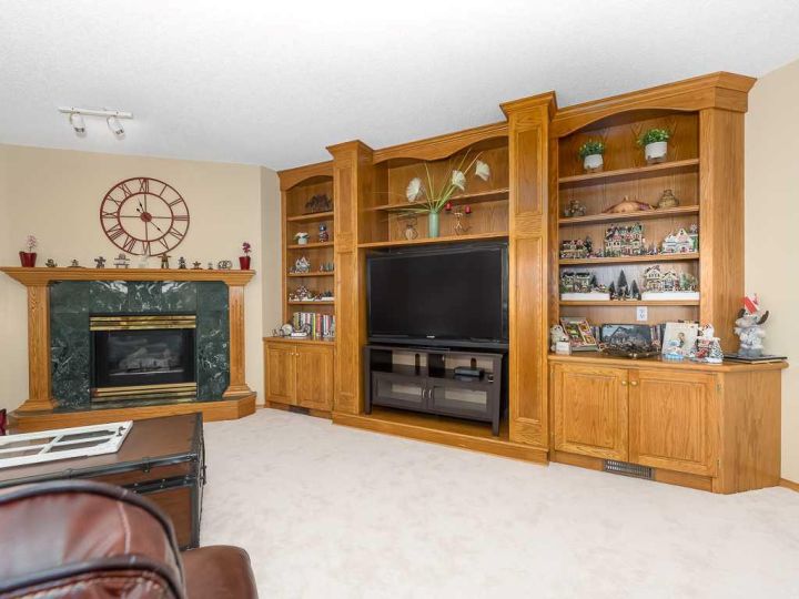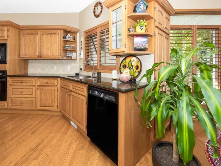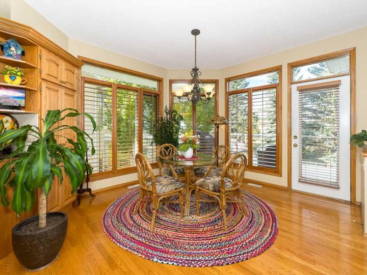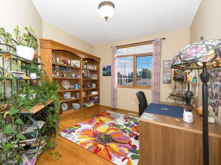 Immaculate raised walkout bungalow backing directly onto the golf course with stunning, unobstructed panoramic views in the highly sought-after community of The Hamptons. This beautifully maintained executive home showcases a timeless brick and stucco exterior with a clay tile roof and a spacious open-concept floor plan with soaring vaulted ceilings. The bright main level features gleaming hardwood floors and a welcoming living room with a cozy corner gas fireplace and a wall of windows that capture spectacular views and fill the space with natural light. The gourmet kitchen offers granite countertops, a large central island, built-in appliances, and a convenient pantry. Enjoy morning coffee or evening sunsets from the adjacent breakfast nook with access to the full-width rear deck overlooking the expansive yard and golf course beyond. The formal dining area with French doors opens to a private den, ideal for a home office. The primary suite boasts a luxurious five-piece ensuite with a jetted tub, separate steam shower, and walk-in closet. A generous second bedroom and full main bath complete the main level. The professionally developed walkout basement is perfect for entertaining, featuring a massive recreation room with numerous windows allowing for abundant natural light, a wet bar, built-in entertainment unit, second gas fireplace, and access to the lower patio. A third bedroom, four-piece bath, laundry room, and plenty of storage complete this level. Additional highlights include central air conditioning, a double front attached garage, and exceptional pride of ownership throughout. An unbeatable location just minutes from parks, schools, shopping, and golf, with easy access to Stoney Trail, Shaganappi Trail, the University of Calgary, and Foothills Hospital. A rare opportunity to own a walkout bungalow in this coveted setting.