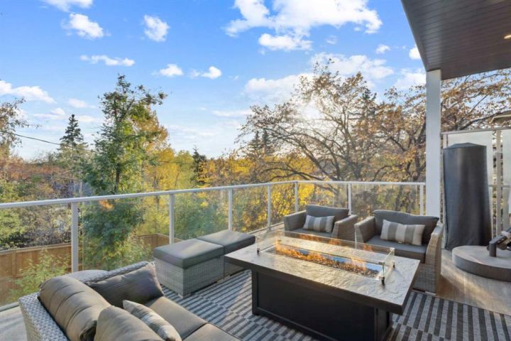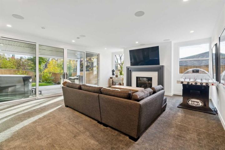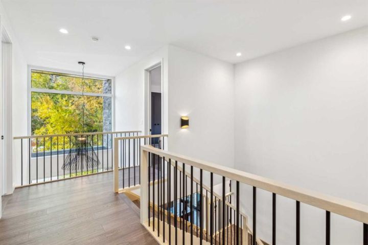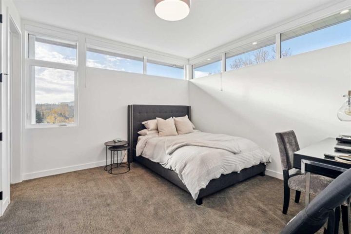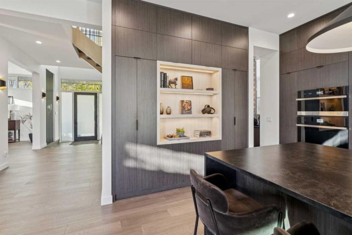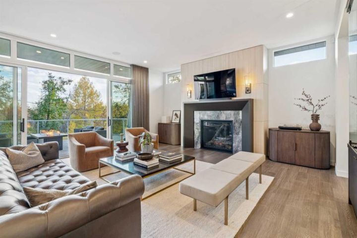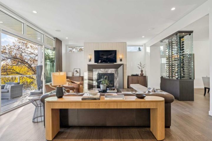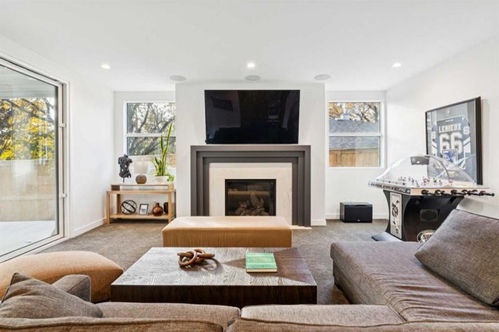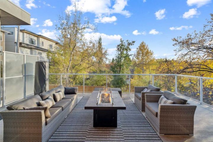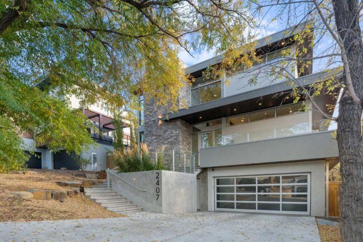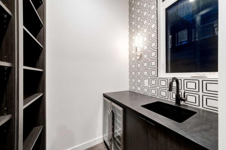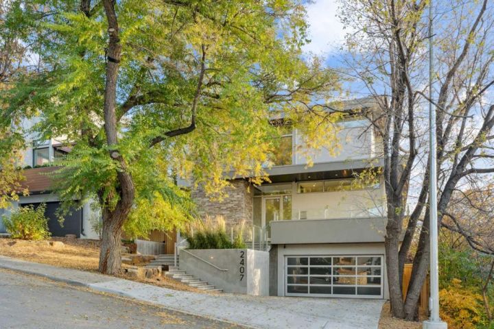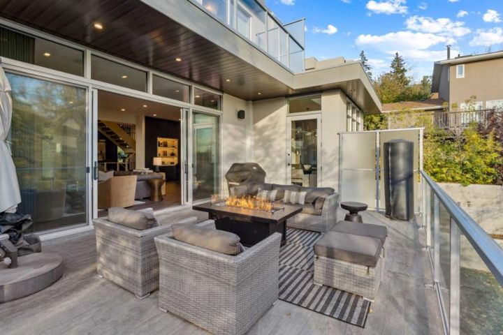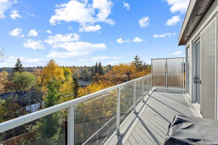 Tucked away in an exclusive enclave just moments from Kensington and the downtown core, this modern architectural residence offers refined living in a truly exceptional setting. Designed for both comfort and sophistication, the home combines thoughtful design, superior craftsmanship, and cutting-edge systems throughout. Built to the highest standards, it features triple-pane windows, 2-zone hydronic in-floor heating in the basement, finished triple garage with floor drains, and a dual-zoned HVAC system. Extensive concrete retaining walls and planters frame the property, while Lutron lighting control, an 8-zone sound system with integrated ceiling and outdoor speakers, and 7.2 surround sound in the recreation room elevate the living experience. Porcelain tiles imported from Italy, Caesarstone countertops, and solid core interior doors reflect the quality that defines every detail. The main level showcases expansive open-concept living with 10-foot ceilings and floor-to-ceiling south-facing windows that flood the home with natural light. The kitchen is a true centrepiece—equipped with integrated JennAir appliances including a 48” gas range top, and a walk-in coffee bar/pantry with prep sink and wine fridge. A striking glass wine wall with floating racks separates the formal dining area, which comfortably hosts 12–14. The stone-clad fireplaces anchors the living room, while a glass-enclosed main floor den provides a serene workspace. Step outside to the 25’ x 16’ deck overlooking a secluded, landscaped south yard surrounded by mature trees. Upstairs, three spacious bedrooms each feature a private ensuite. The primary suite is a sanctuary with a spa-inspired 5-piece ensuite bathroom with heated floors, custom window coverings, an impressive 21-foot walk-in closet with extensive built-ins, and a private south-facing balcony offering sweeping and serene views of the Bow River Valley. A large, well-appointed laundry room completes the upper level. The walk-out basement includes a guest suite with attached bath, a recreation room with gas fireplace and wet bar, and access to a covered patio and your oversized triple garage with heated floors. The home has security cameras, central vacuum, irrigation, EV charging, and hot tub hookup. Perfectly positioned for an active lifestyle, this residence is steps from the Bow River pathways, West Hillhurst tennis and pickle-ball courts, and offers quick access to 16th Avenue for effortless weekend escapes to the mountains. Minutes from top schools, hospitals, shopping, the C-train, and downtown Calgary—this is contemporary living at its most complete and luxurious.