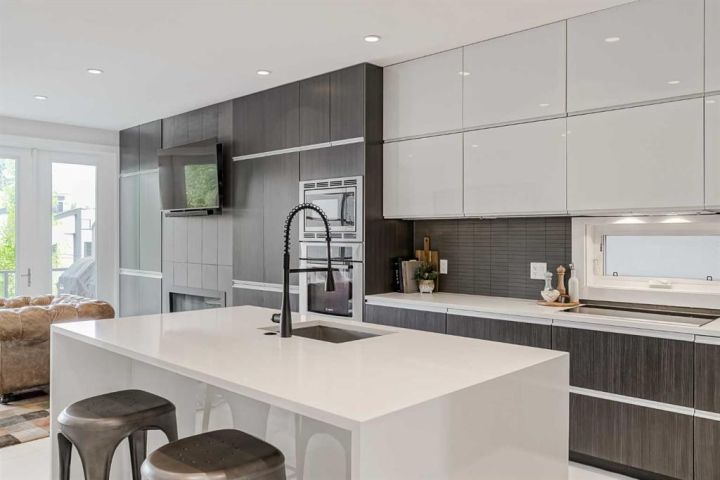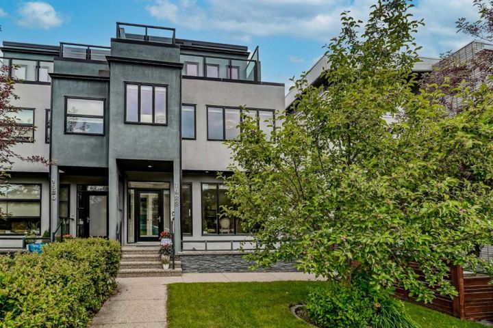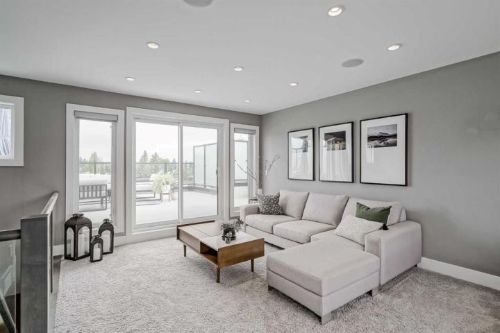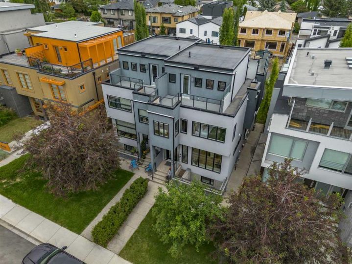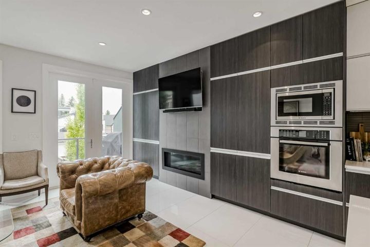 Step into sleek, modern luxury with this stunning custom-built home where crisp, clean lines and high-end finishes create a show-stopping impression inside and out. The main floor features a striking 24x24 tile throughout and an open-concept layout drenched in natural light from oversized, metal-clad windows. The chef-inspired European kitchen is a true centerpiece—complete with quartz countertops, a waterfall island, and premium Bosch & Miele appliances. Entertain in style, and don’t miss the jaw-dropping 2-piece powder room—guests will talk about it long after they leave! Upstairs, you’ll find two spacious bedrooms, a full laundry room, and a breathtaking primary retreat. Wake up to panoramic city views from bed, then indulge in your spa-like ensuite featuring a double vanity, oversized jetted tub, custom steam & rain shower with body jets, and heated tile floors. A custom walk-in closet completes the dream. The third-floor bonus room offers an additional oasis with even more incredible city views and a sunny south-facing balcony—plus, yes, there’s a bathroom on every level! The walkout basement is equally impressive, boasting in-floor heating beneath plush carpeting, a cozy fourth bedroom, a den, a beautifully finished storage area, and a rec room/TV area complete with a full bar—perfect for game nights and movie marathons