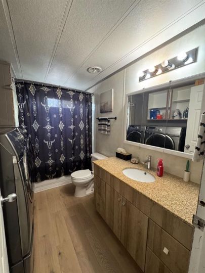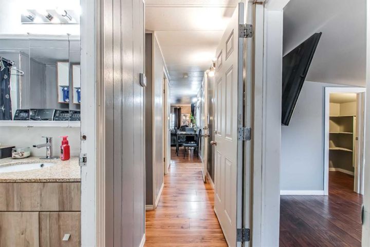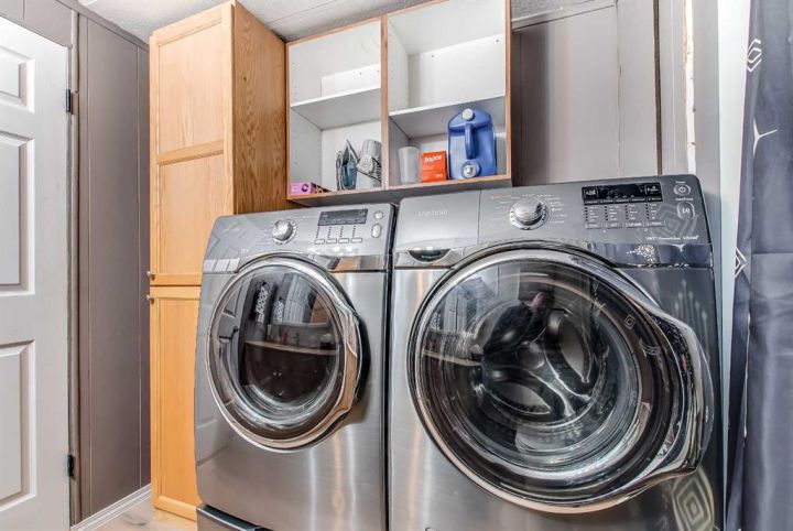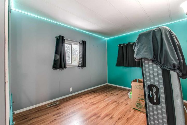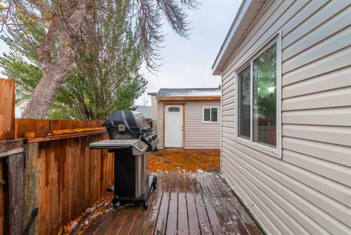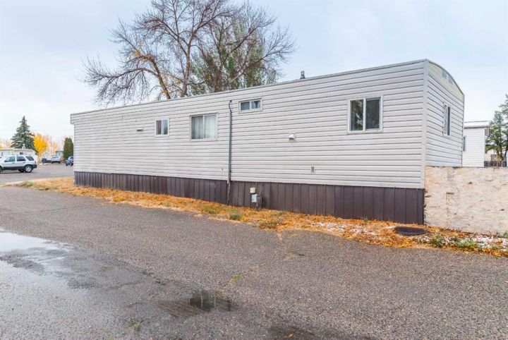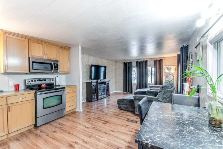 Move-in ready and well cared for, this 3-bedroom mobile home offers great space and updates throughout. An addition expands the living area and includes a large, heated, and versatile front entry with a coat closet. Inside, the open-concept main living area features a comfortable living room and a functional kitchen with oak cabinets, a full appliance package, a dining space, and a handy pantry or storage closet. The primary bedroom is a good size with a walk-in closet. Two additional bedrooms and a 4-piece bathroom complete the layout. The bathroom has been refreshed with updated flooring and vanity and includes a washer and dryer for added convenience. Outside, you will find a large, fully fenced yard with two generous storage sheds and a raised garden box. Additional features include central air conditioning, mostly upgraded windows, a heat tape replaced two years ago, and some fresh interior paint. Do not miss out on this move-in-ready, affordable home! Call today to book your viewing.