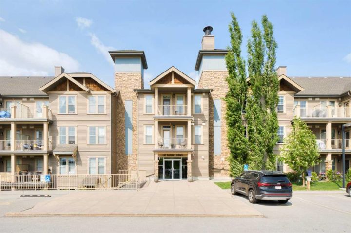 Bright, open-concept living defines this stylish one-bedroom, one-bath condo in Cochrane’s sought-after Sunset Ridge community. Designed for connection and comfort, this 579 sq. ft. ground-floor home welcomes you through a private entry straight onto your gas-line-ready patio — perfect for morning coffee or a cozy evening barbecue under the big Alberta sky. Inside, high ceilings and oversized windows fill the open living space with natural light, while the modern kitchen with breakfast bar and generous storage blends practicality with social charm. The spacious bedroom and walk-in closet bring everyday luxury, and in-suite laundry with extra storage keeps life simple. With titled parking, a fully equipped fitness centre, and pet-friendly approval, this home balances convenience and comfort. Condo fees include heat, gas, water, sewer, trash, and snow removal for truly low-maintenance living. Just steps from Cochrane’s scenic walking paths, parks, and mountain views, this is an easy place to call home. Book your private showing today. Let’s make YOUR dreams... Realty!