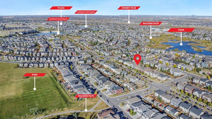 Welcome to the award-winning lake community of Mahogany! Ideally located just steps from the Beach Club, this warm and inviting semi-detached home offers the perfect blend of comfort, style, and community living.This home is sure to impress with a desirable floor plan featuring an open concept design, 9’ ceilings, wide plank laminate floors throughout the main level, and oversized windows that fill the space with natural light. The heart of the home is the upgraded kitchen, showcasing quartz countertops, modern cabinetry, and a layout designed for both everyday family meals and effortless entertaining. You’ll also appreciate the comfort of central air conditioning and the convenience of a double detached garage, offering plenty of space for parking and storage. Upstairs, you’ll find three spacious bedrooms, including a relaxing primary suite complete with a private ensuite and walk-in closet. A second full bathroom makes busy mornings effortless. The finished basement extends your living space with a fourth bedroom, three-piece bathroom, and a flexible rec area that can grow with your family — whether it’s a playroom, home gym, or movie space. Steps from your doorstep, enjoy all that Mahogany has to offer: sandy beaches, swimming, skating, parks, pathways, and year-round activities for every age. This is where family memories are made — welcome home to Mahogany.