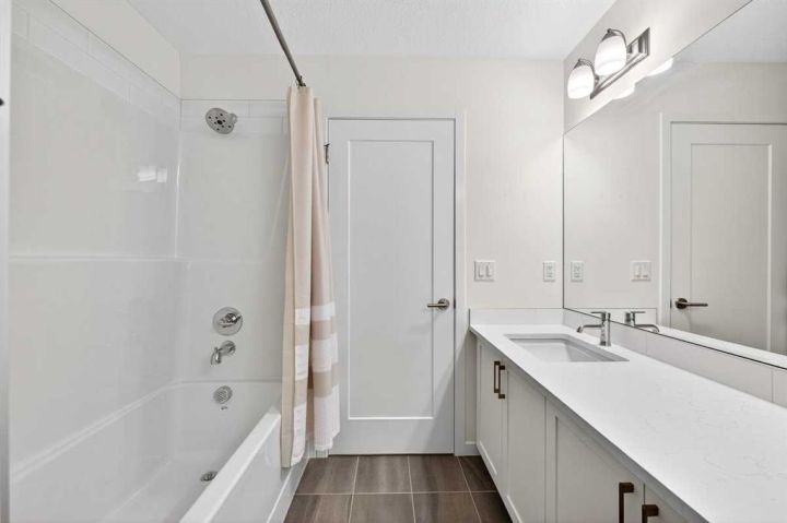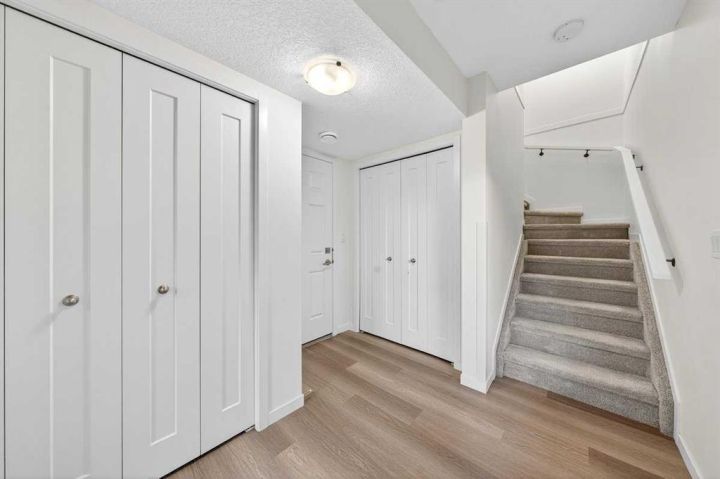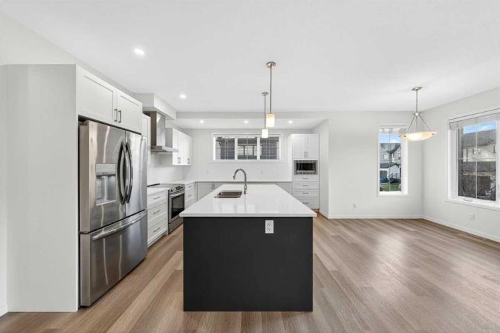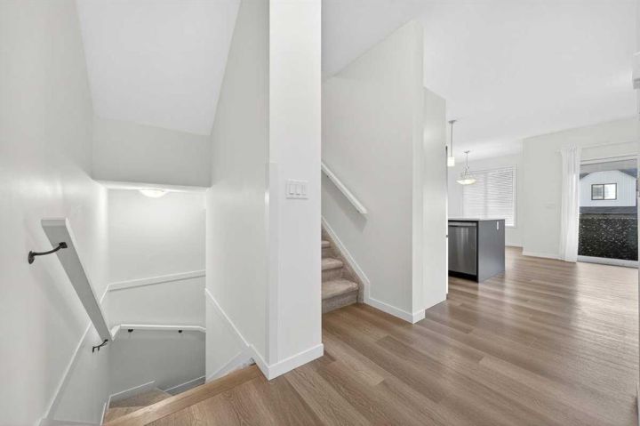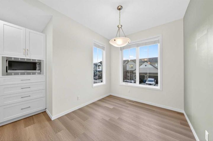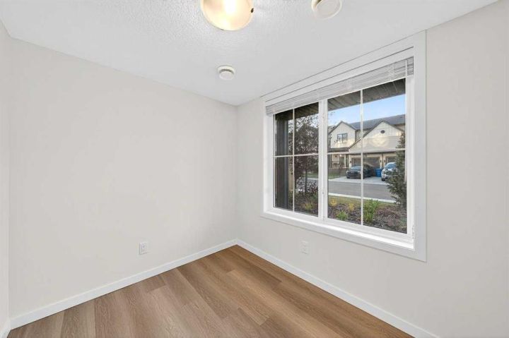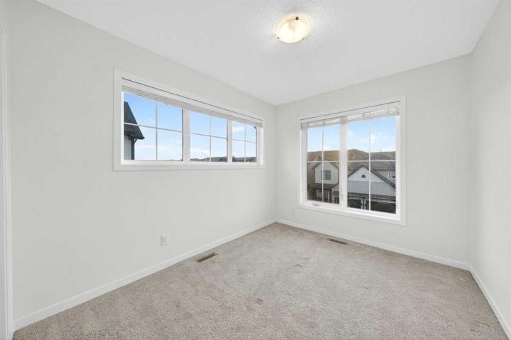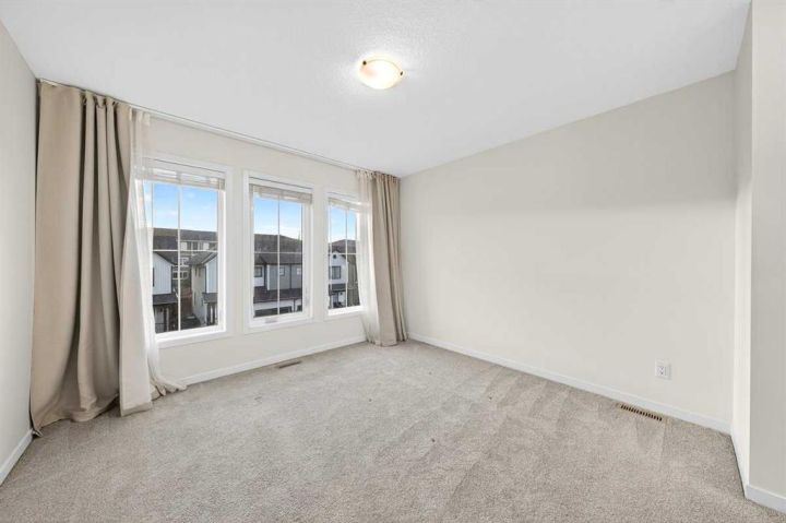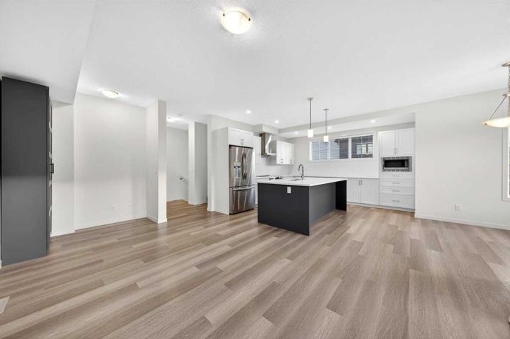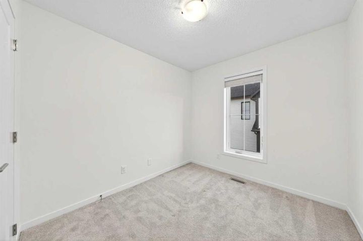 Welcome to this immaculate 3-bedroom, 2.5-bath, three-storey corner unit home that offers modern comfort, style, and convenience in every detail. This non-condo property is covered by new home warranty and showcases beautiful bright windows throughout, filling each space with natural light. The entry level features a versatile office or den with a large window—perfect for working from home or creating a quiet reading nook—along with access to a single attached garage and driveway for added convenience. The open-concept main floor is designed for both living and entertaining, with vinyl plank flooring, stunning quartz countertops, and a contemporary kitchen that blends functionality with elegance. Upstairs, you’ll find three spacious bedrooms, including a serene primary suite with a double vanity and plush carpeted bedrooms for added comfort. Enjoy your morning coffee on the private balcony, or unwind outdoors in your small side yard and large front yard, offering rare outdoor space for a home of this style. Perfectly located right beside Northcott Prairie Elementary School, and just steps from pathways, parks, and amenities, this home delivers the ideal balance of community and convenience.