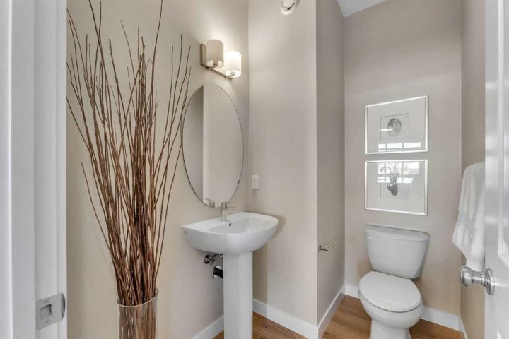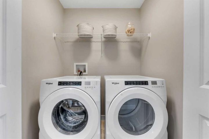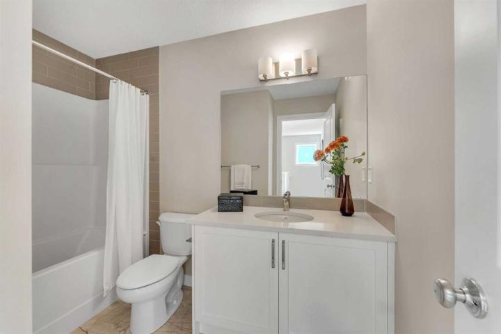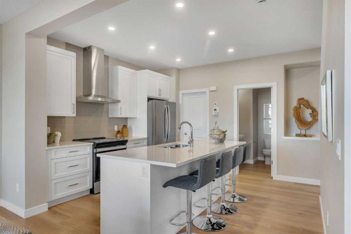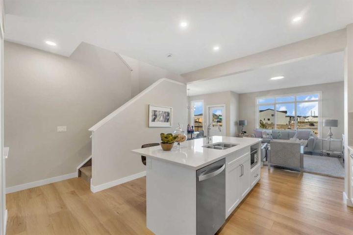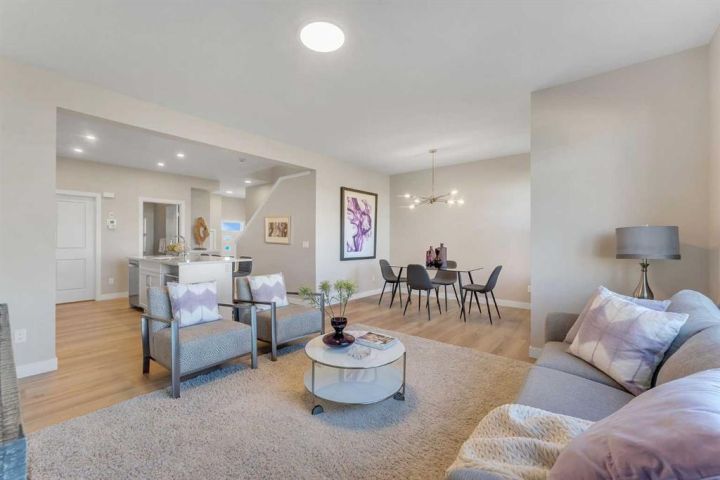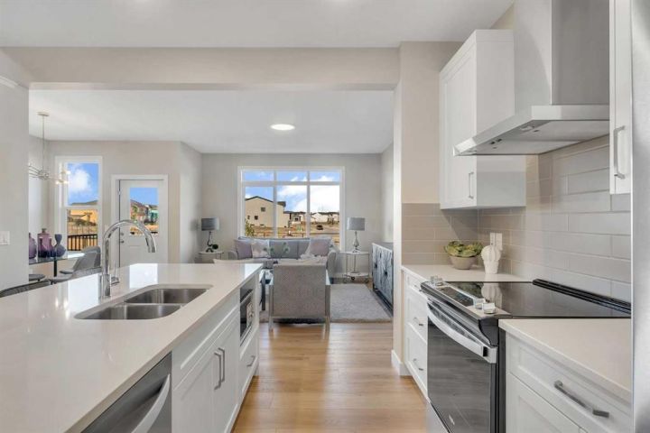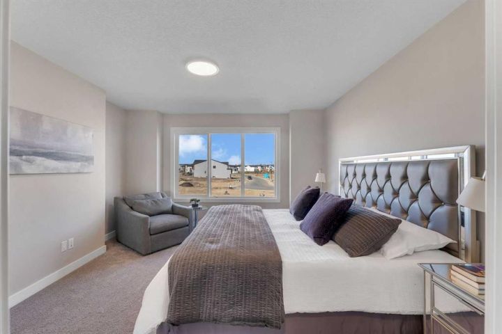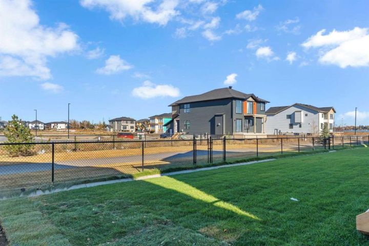 Stylish, steps to the lake, and ready for you to call home. Welcome to this beautifully appointed, 1700 sq ft brand-new Alliston at Home front-attached garage duplex, ideally located just steps from Chestermere Lake. Offering a thoughtful and functional floor plan with gorgeous finishes throughout, featuring 3 bedrooms, 2.5 bathrooms, a side entrance to the basement and backing onto a pathway with a lake view, what's not to love? Inside, the open concept kitchen, living room and dining area features wide luxury vinyl plank flooring and airy 9' ceilings, creating a bright and spacious feel. The kitchen will please the chef of the home with quartz countertops, a large island perfect for meal prep and entertaining, classic white 42" cabinets, sleek stainless steel appliances and a dedicated pantry. Triple-pane windows, which are a standard feature at Alliston Homes, flood the space with natural light. A powder room and spacious foyer with a large closet off the double attached garage complete the main level. Step outside to the sunny backyard, complete with a deck equipped with a gas line for BBQs, and enjoy lake views year-round. Whether swimming in the summer or skating in the winter, this location is all about connection to the outdoors. The spacious yard offers ample space for children or pets to play. Upstairs, the primary suite is a comfortable retreat, featuring a large walk-in closet and a spa-inspired en-suite with his and hers sinks and a spacious walk-in shower. Two additional bedrooms and a convenient laundry room complete the 2nd level. The unfinished basement with 9-foot ceilings and a side entrance offers endless potential for future development and equity-building ideas. This property is turnkey, complete with front and back landscaping and is close to schools, shopping and access to the Calgary.