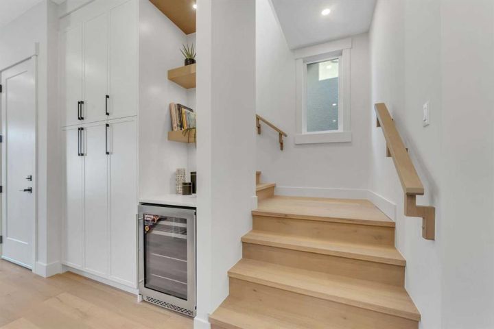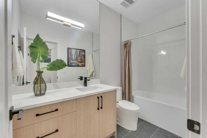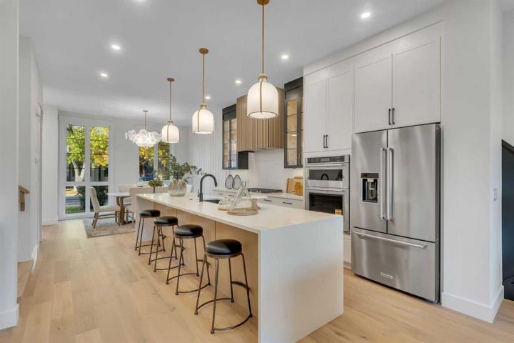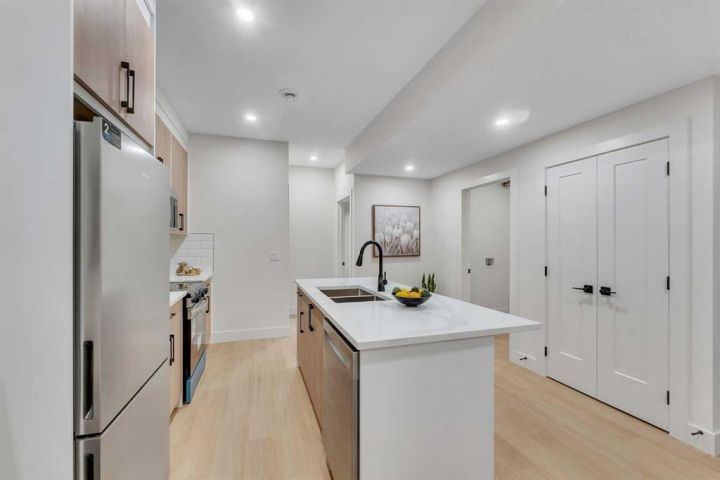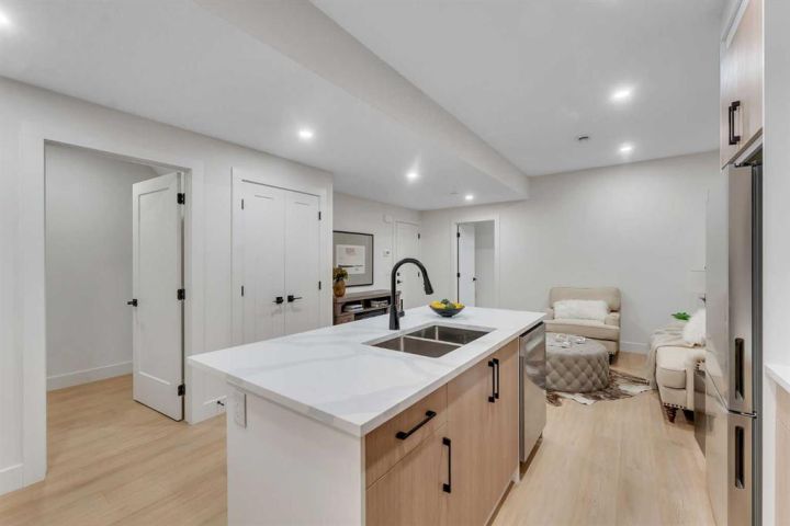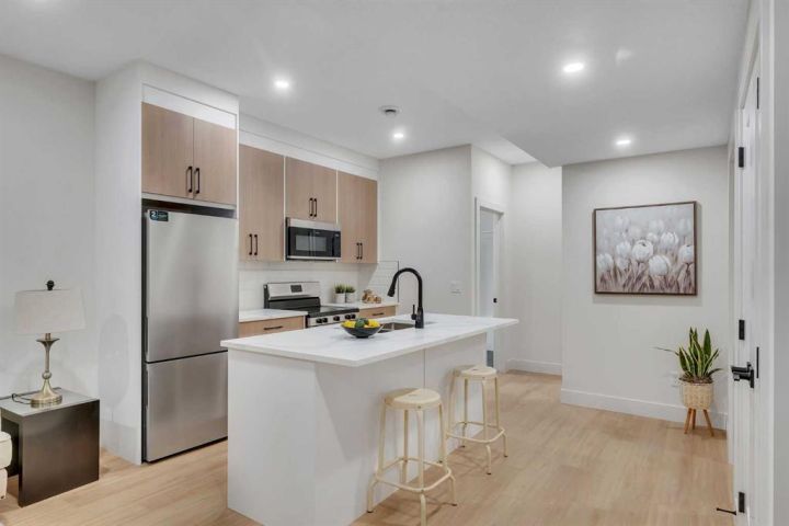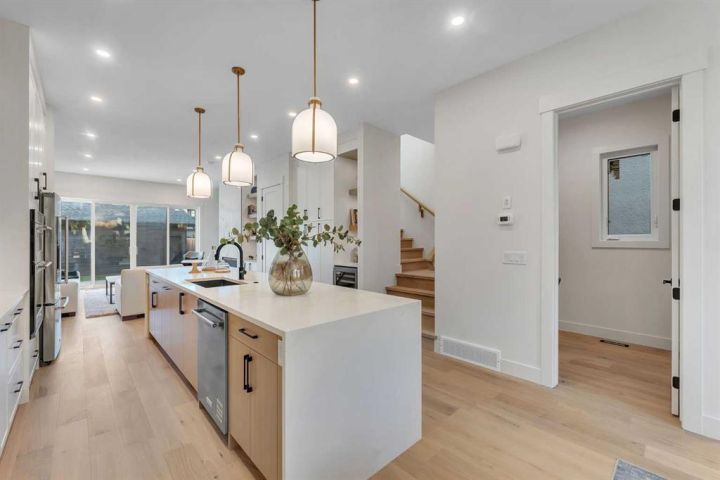 Welcome to the heart of Mount Pleasant, one of Calgary’s most sought-after inner city neighbourhoods. This newly built semi detached home combines modern design with practical family living, offering over 2,800 sq ft of beautifully finished space including a legal suite. Thoughtfully designed for flexibility, it’s ideal for multi generational living or rental income without compromise on comfort or style. The open concept main level features large windows that fill the home with natural light. The kitchen showcases KitchenAid appliances, sleek and stylish custom cabinetry, quartz countertops, and a stunning full slab backsplash that creates a clean, seamless look. A large island anchors the space, perfect for casual meals or conversation. The adjoining dining and living areas flow naturally toward the deck, creating an inviting space for both family time and entertaining. A fully fenced, landscaped yard with a composite deck offers a private, low maintenance outdoor retreat. Upstairs, the primary suite is a true escape, featuring a large walk in closet and a spa inspired ensuite with Italian tile, a steam shower, freestanding tub, and dual vanities. Italian tile continues through all bathrooms, adding a consistent, upscale feel. Two additional bedrooms, a full bath, and a laundry room complete the level, designed with both privacy and function in mind. The legal two bedroom basement suite is self contained with its own entrance, full kitchen, laundry, and bath, ideal for extended family or generating additional income. The design and sound separation ensure comfort for both households. Additional features include smart toilets, engineered hardwood on the main and upper floors, durable LVP in the basement, and a double detached garage offering secure parking and extra storage. The exterior blends red brick, and modern accents for timeless curb appeal. Mount Pleasant continues to be one of Calgary’s most desirable communities, known for its mature tree lined streets, walkability, and welcoming feel. Residents enjoy easy access to Confederation Park, the community pool and sports facilities, as well as cafes and boutiques along 4th Street NW. Close proximity to SAIT, Kensington, and downtown makes daily life convenient and connected. A home that delivers quality construction, flexible living, and a location that will always be in demand. Move in ready. Measurements based on builder’s plans. RMS measurements to be completed prior to possession. All buyers and their agents are advised to verify measurements to their own satisfaction. Photos and RMS measurements are from the other side of the duplex and are provided for reference only. Finishes, layout, and measurements may vary slightly.