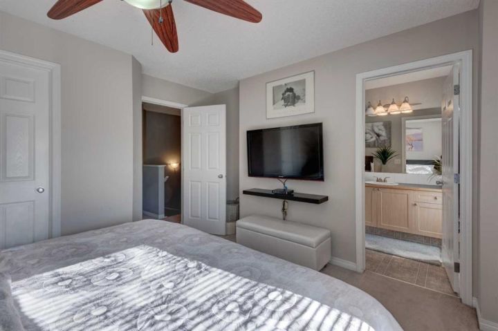 This charming 2-bedroom, 2.5-bath townhome in the family-friendly complex of Copperfield Village is perfect for first-time home buyers or investors looking for low-maintenance living. Conveniently located steps from the bus stop and within walking distance to parks, schools, and local amenities — this home is a must-see! Upon entering, you’ll find a bright, open entryway with tiled flooring and direct access to the single attached garage. The upper level features a spacious and cozy living room with soaring ceilings and access to the back patio that opens to street level. Continue up to the next level, where you’ll discover an open-concept kitchen and dining area featuring maple cabinetry, black appliances, a pantry for extra storage, and a second balcony just off the dining space. This level is completed by a 2-piece bath and a convenient laundry room with upper cabinets for added organization. The top floor offers two generous primary bedrooms, each with its own private ensuite bath and walk-in closet — ideal for roommates or guests. The finished basement provides additional living space that can easily serve as a rec room, office, or home gym, along with plenty of storage. With easy access to major roadways and all local amenities nearby, this beautiful home won’t last long!