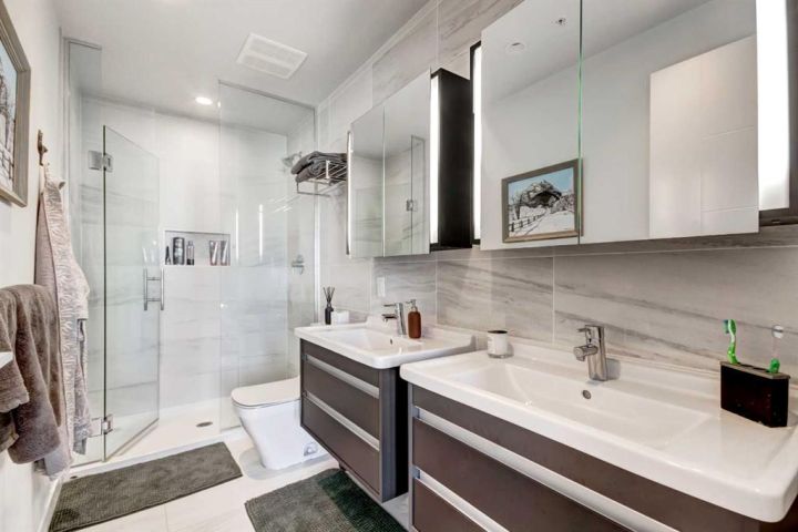 Welcome to unit 703 in The Royal! A lovely 2 bedroom 2 bathroom double balcony corner unit with stunning downtown views. The floor to ceiling windows flood the main living space with natural light and the north and east vistas are stunning. The bright kitchen is fully equipped with a large quartz island, high end appliances, plenty of cabinet and counter space with custom built in - all overlooking the main living and dining areas, perfect for entertaining. Large primary bedroom, with direct access to the second balcony, features a walk-in closet, an ensuite with a large glass door shower, double vanity and heated floors. The second bedroom is located on the opposite side of the unit, perfect for guests or home office. Other features include air conditioning, a gas line on the balcony for bbq, in-suite full size stacked laundry and additional 4 piece bathroom with soaker tub. Residents can enjoy the many amenities including a fitness center, steam room, sauna, squash court, 24-hour concierge/security, outdoor courtyard, and private dining area for larger get togethers. Located just off 17th avenue you will have quick access to great shopping, restaurants, groceries, coffee shops and pubs. Building is very pet friendly, with approval, and there are many parks and green spaces near by. This unit is complete with a secure heated underground parking space and a separate storage locker. An excellent well cared for urban home.