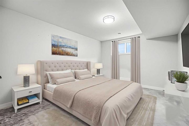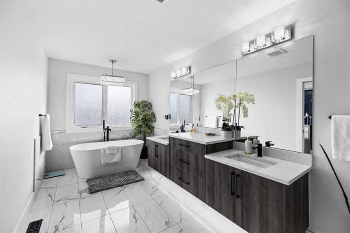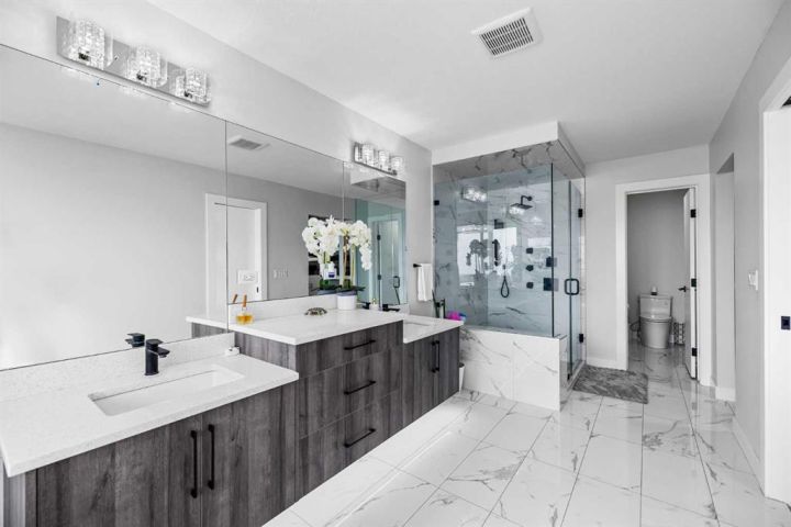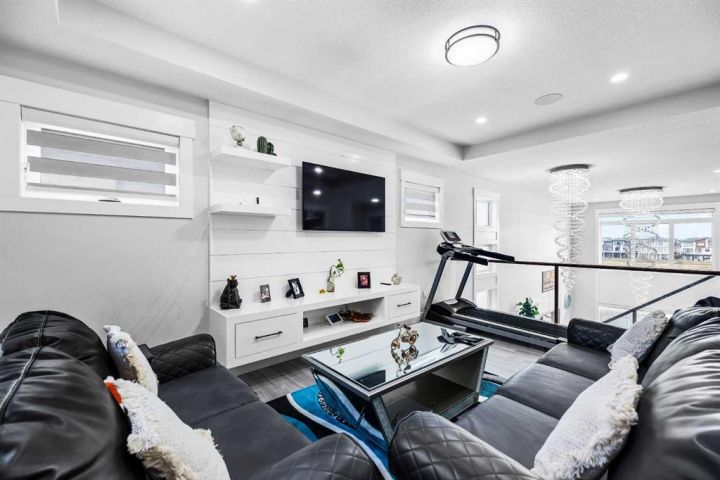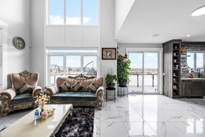 Experience waterfront luxury in this recently completed custom build on a premium, extra large 50-ft walkout lot. Backing onto tranquil waterfront and scenic pathways in Chestermere’s Waterford community, this home showcases over 4,500 sq ft of living space, and $150K in premium builder upgrades. The main level features large format polished marble tile, a chef’s kitchen with maple cabinetry, marble countertops, and a spice kitchen fully equipped with upgraded appliances. An elegant living area with gas fireplace, beautiful open-tread staircase, and a full width glass-railed deck overlooking the water. Upstairs includes a family room overlooking the open-to-below great room, four bedrooms, a spa-inspired primary ensuite, a junior primary with ensuite, and large laundry with a sink and extra storage. The walkout basement is an illegal suite, fully developed by the builder to match the professional craftsmanship of the upper levels—perfect for multi-generational living or rental income. Complete with a triple car garage, dramatically impressive lighting upgrades, and extensive maple millwork and custom feature walls, this home defines modern waterfront living in Chestermere.